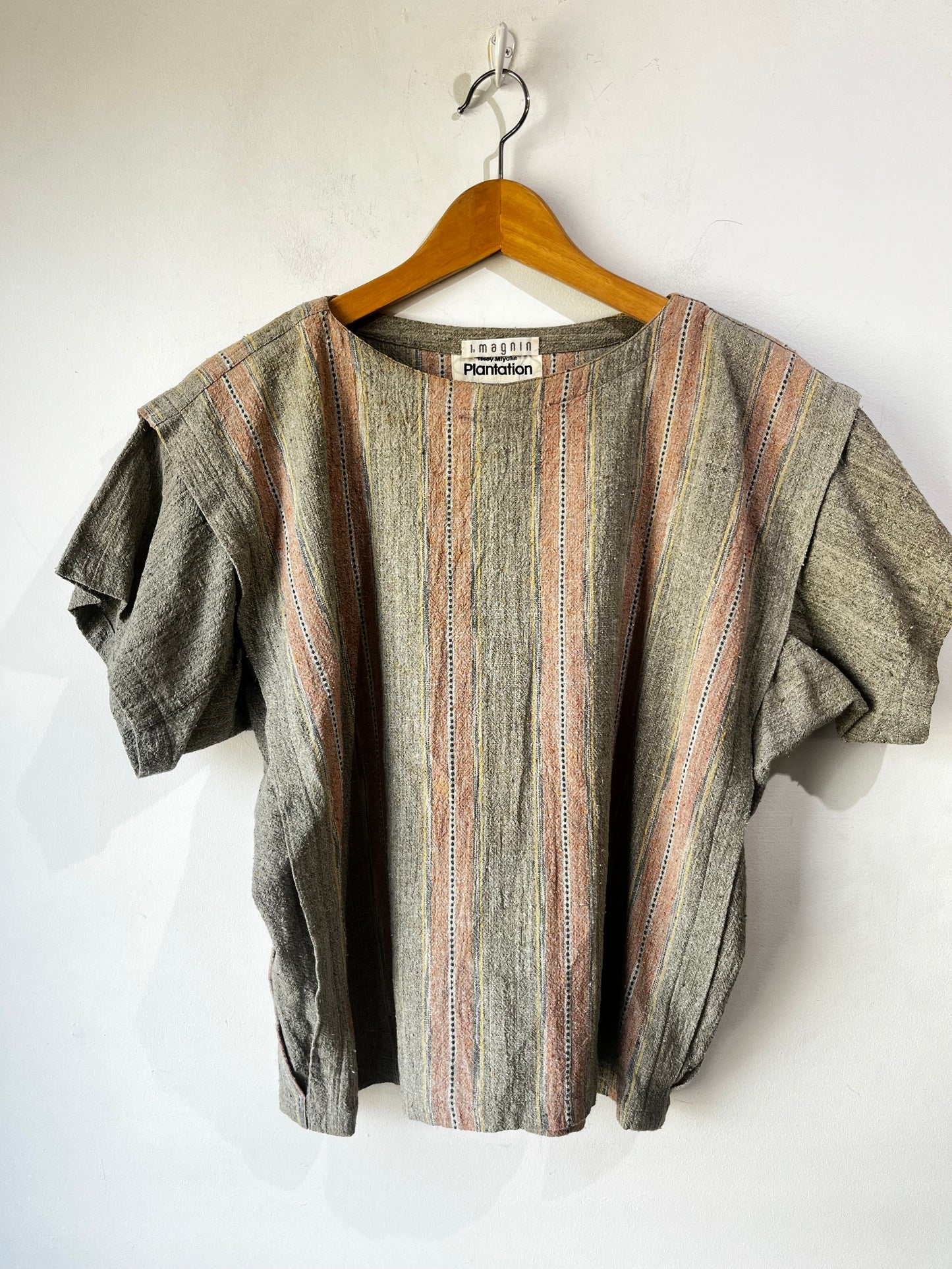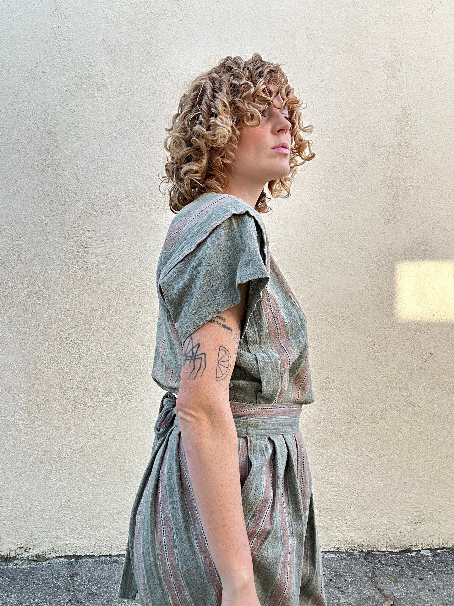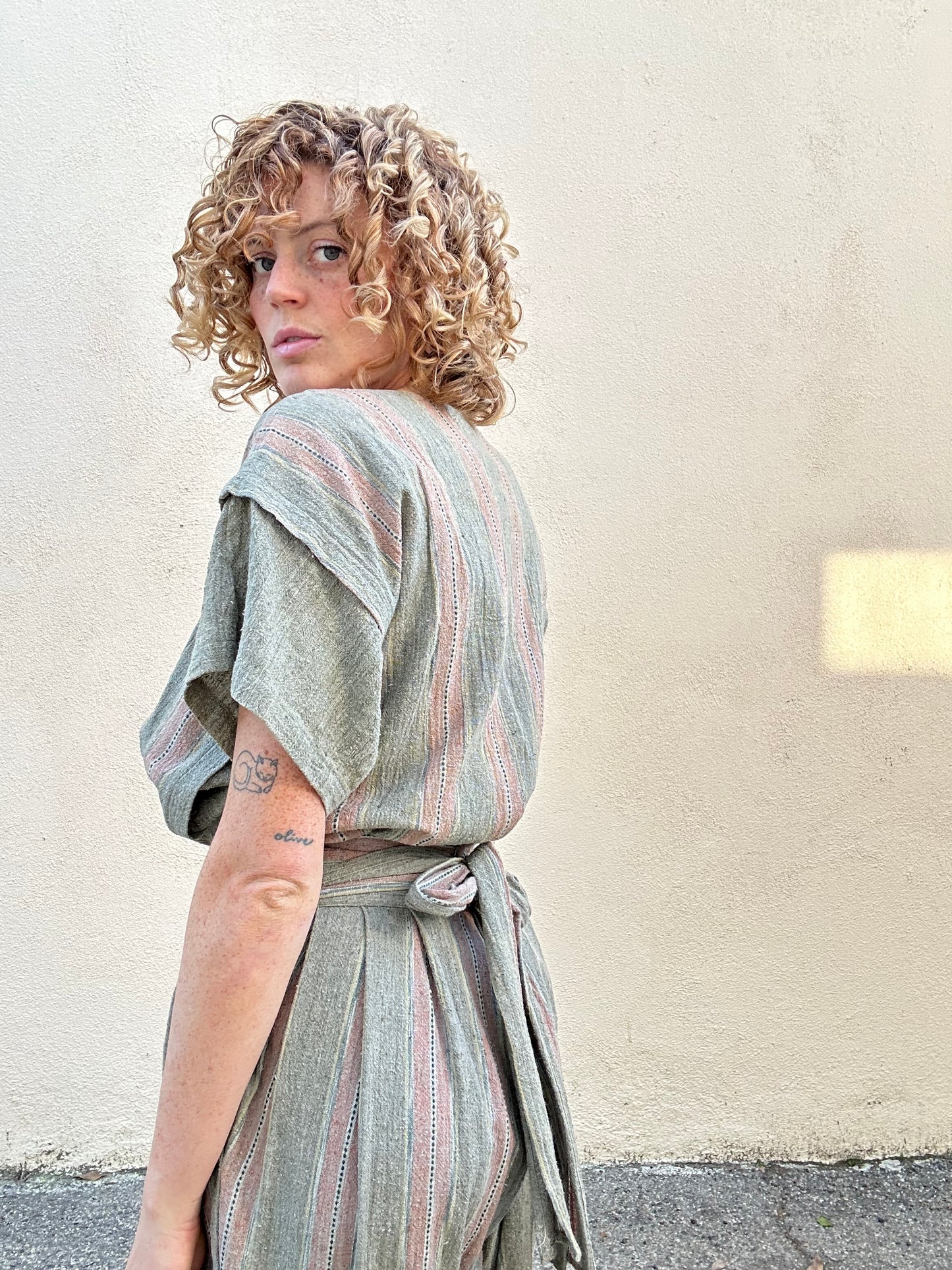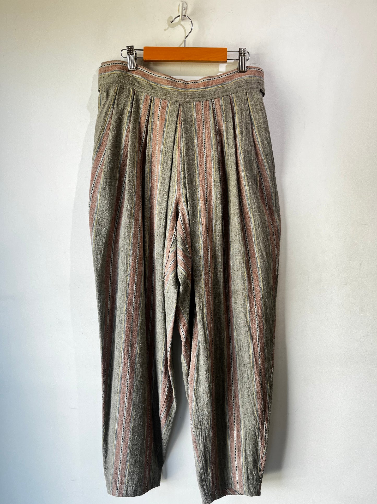 Issey Miyake Plantation Pink Stripe Two-Piece Outfit. This soft striped cotton nubby linen two piece outfit features an architectural caped bodice, while the inverted pleat pants with wrap waist and sash tie ensure a flattering fit. Garments are in very good, gently worn condition and are free of tears, stains and defects.