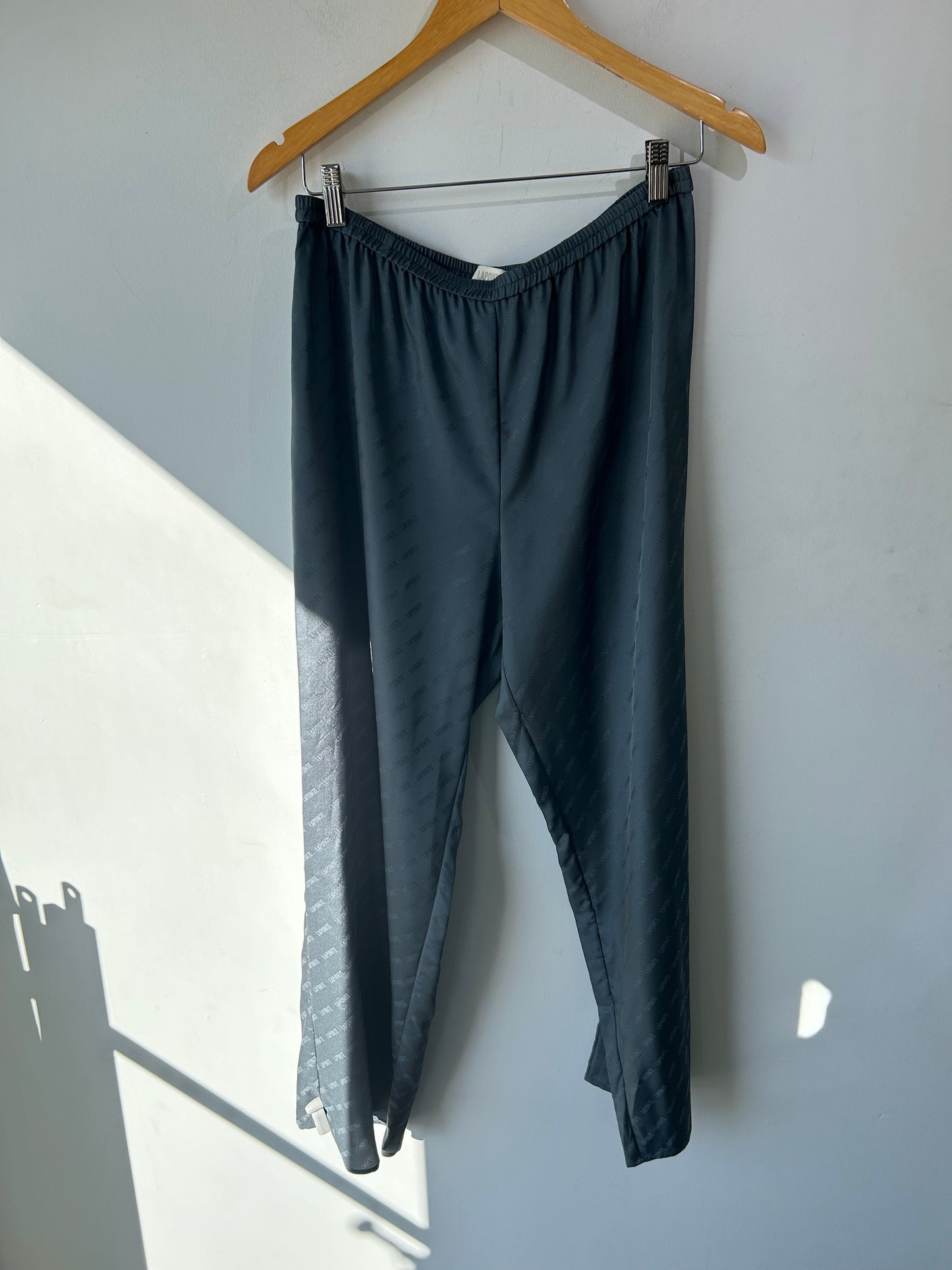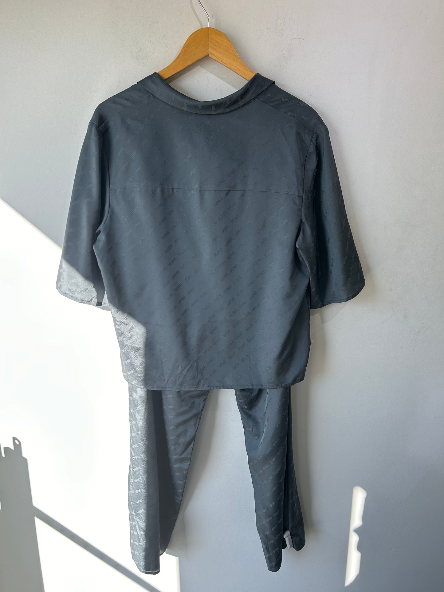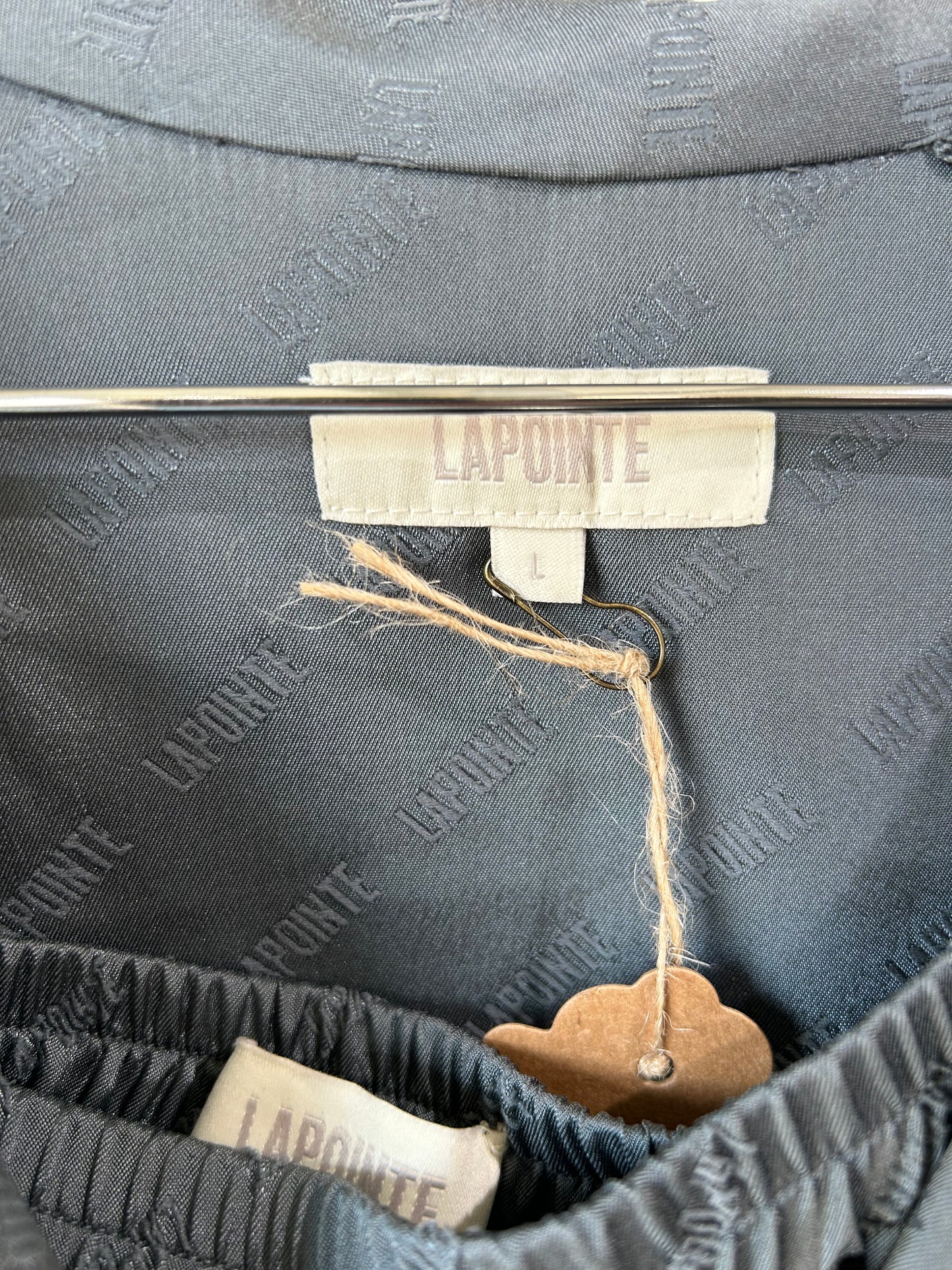 Sally Lapointe Grey Silk Set. Easy to wear yet cool as can be slate grey silk set with repeating "Lapointe" pattern throughout the material. Marked size L. In excellent, like new condition.