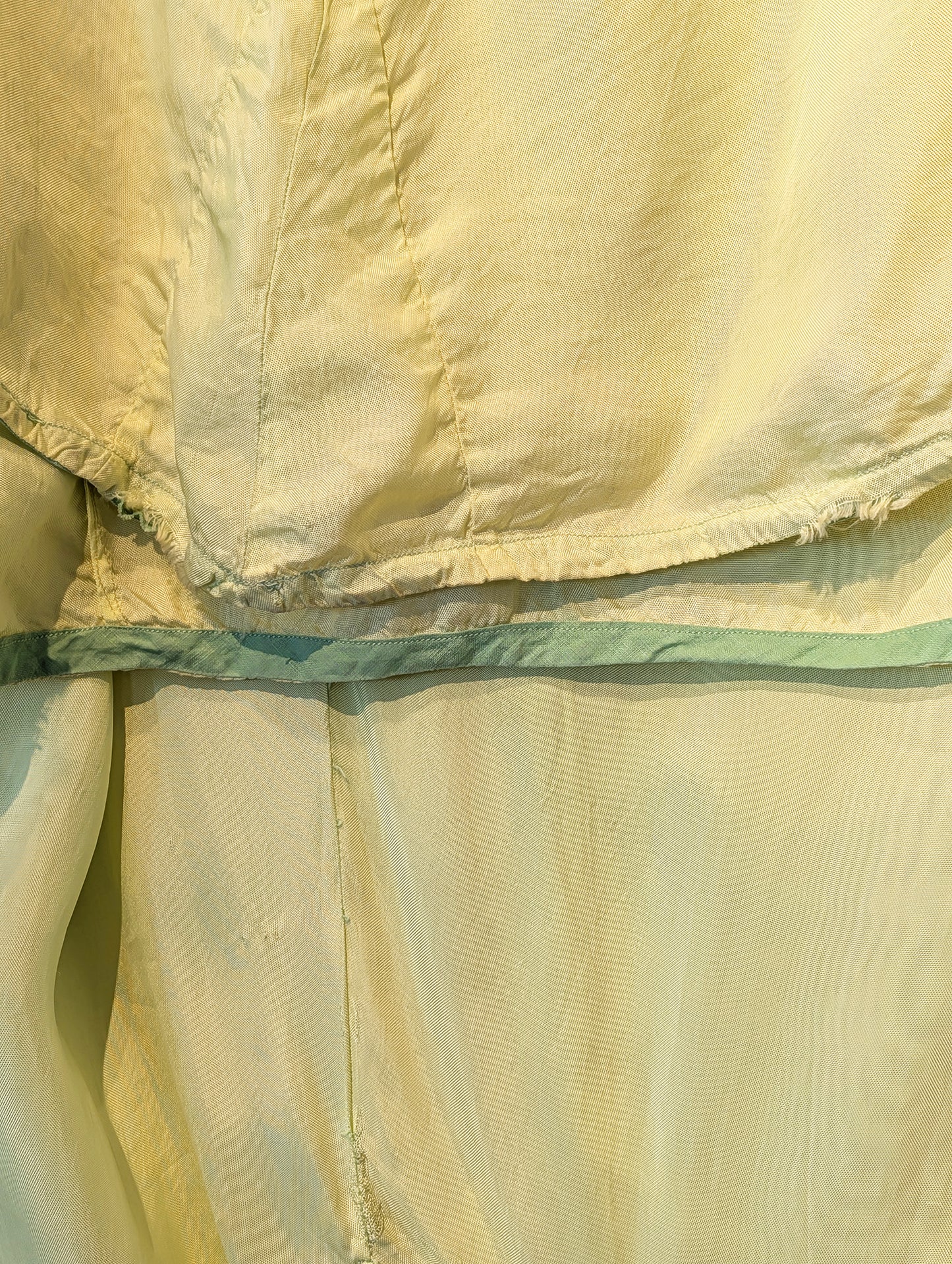 Not your average slip, this chartreuse rayon number has lived a little. The straps have been repaired, the neckline altered, and the result is something closer to DIY rebellion than delicate underpinnings. Its slinky drape still whispers “lingerie,” but the patched-up charm shouts back “punk.” A slip that refuses to stay in its lane, it’s raw, it’s altered, and it’s got just the right edge. Slip is in fair vintage worn condition, has a twisted strap from a post-market alteration, and some damages throughout (pictured).