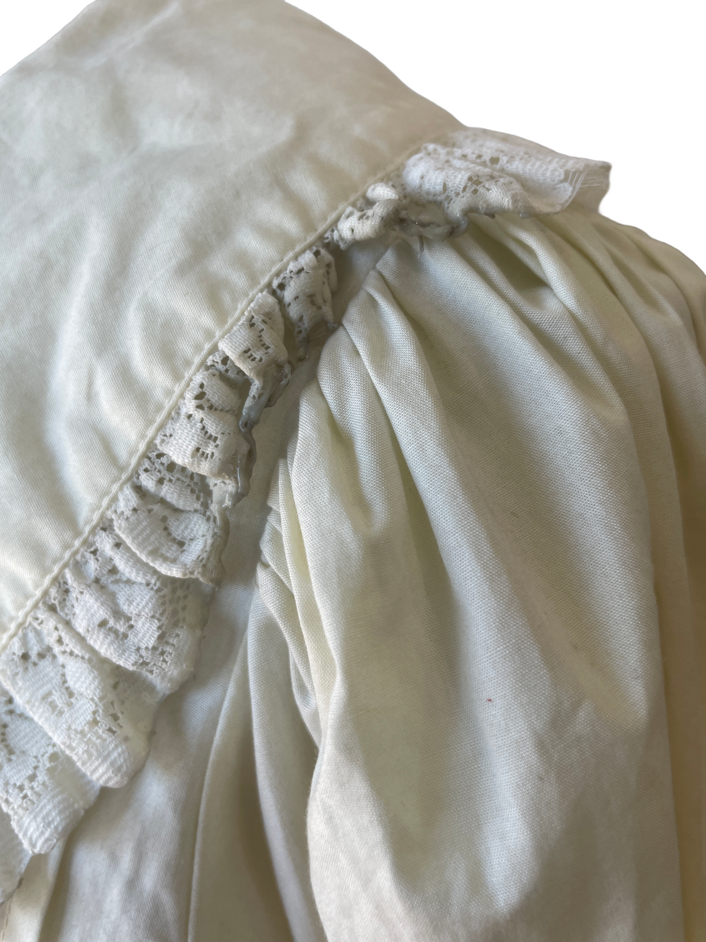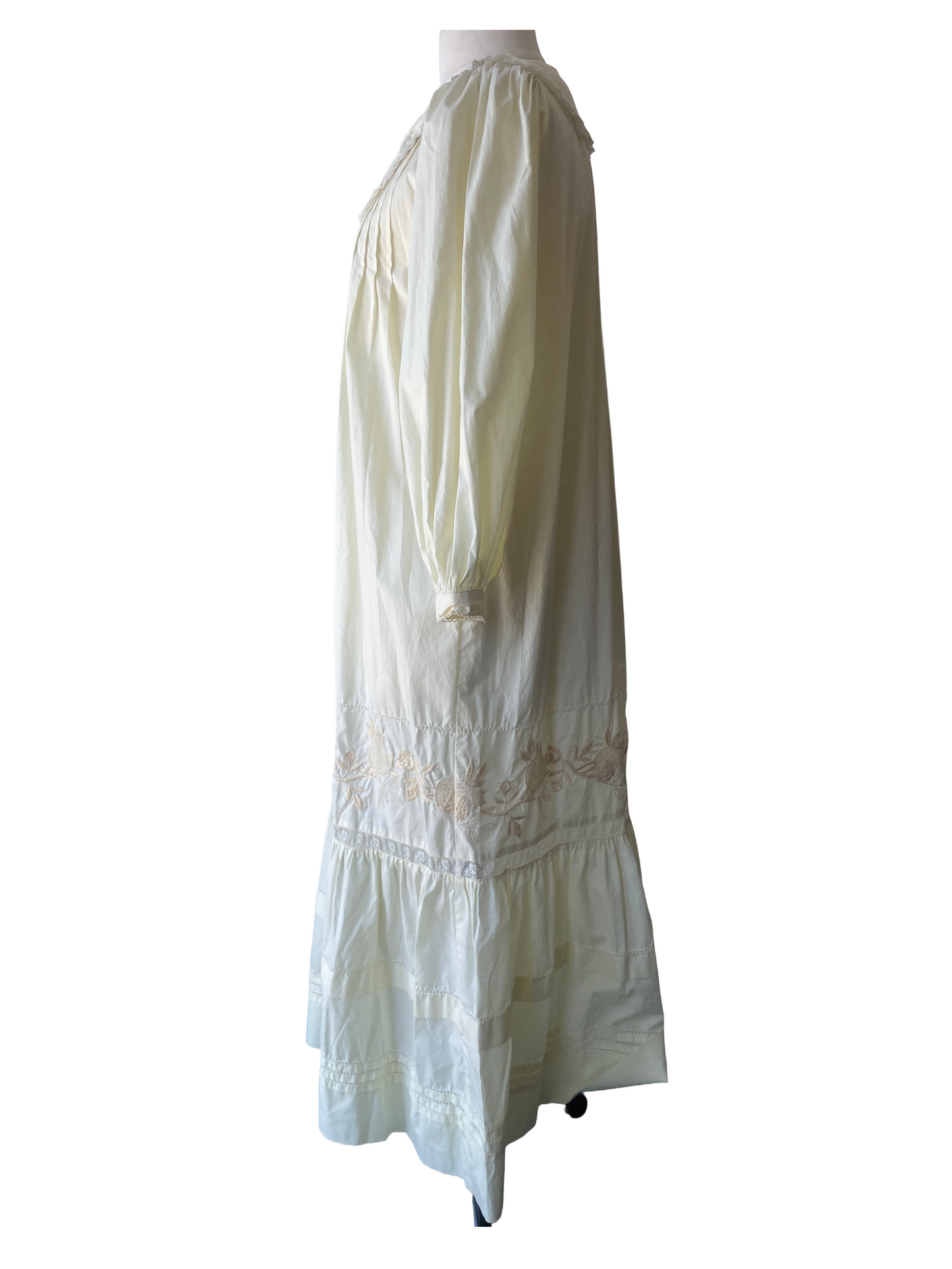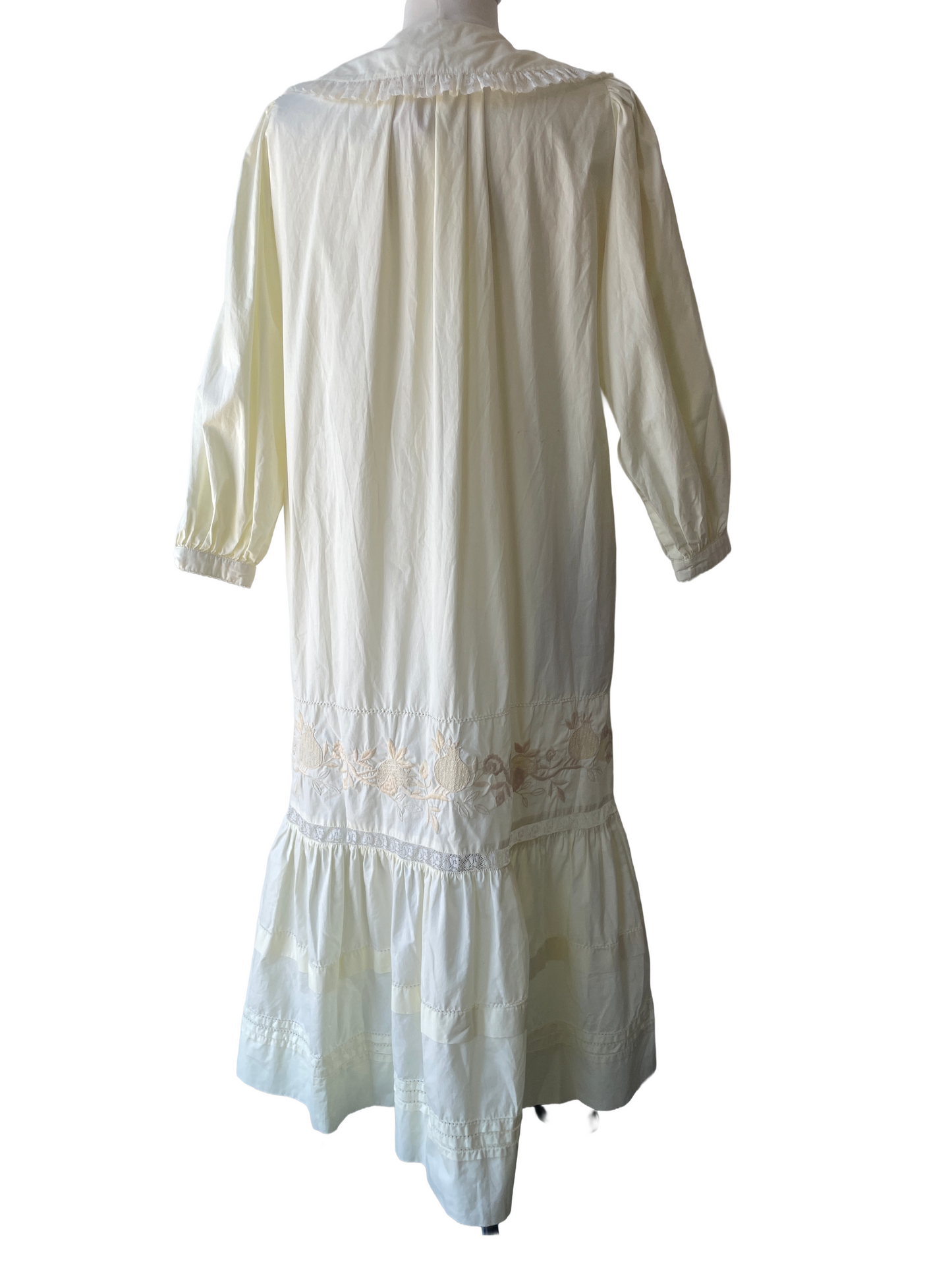 Christy Dawn Yellow Floral Lace Nightgown. The cutest little nightgown in a wonderful buttery yellow color. This piece combines the best of Christy Dawn with lovely embroidered pomegranate details on skirt as well as pin tucked details on front. Not to mention the Peter Pan-style collar also adorned in lace and the same pomegranate embroidery. This piece definitely has a story to tell with some melted lace on the left collar half, a close call or something more dramatic? Dress is in good condition with some minor stains, sold as is.