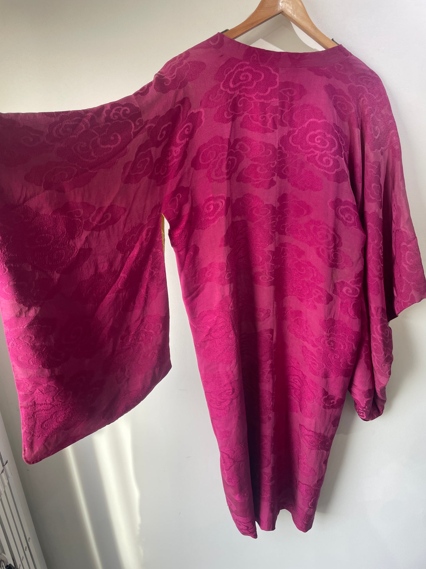 Vintage Magenta Kimono. Gorgeous fabric with subtle swirly cloud pattern stitching, feels like silk. Gold lining with flowy sleeves and buttons down the front. Unmarked size, fits like a Large.