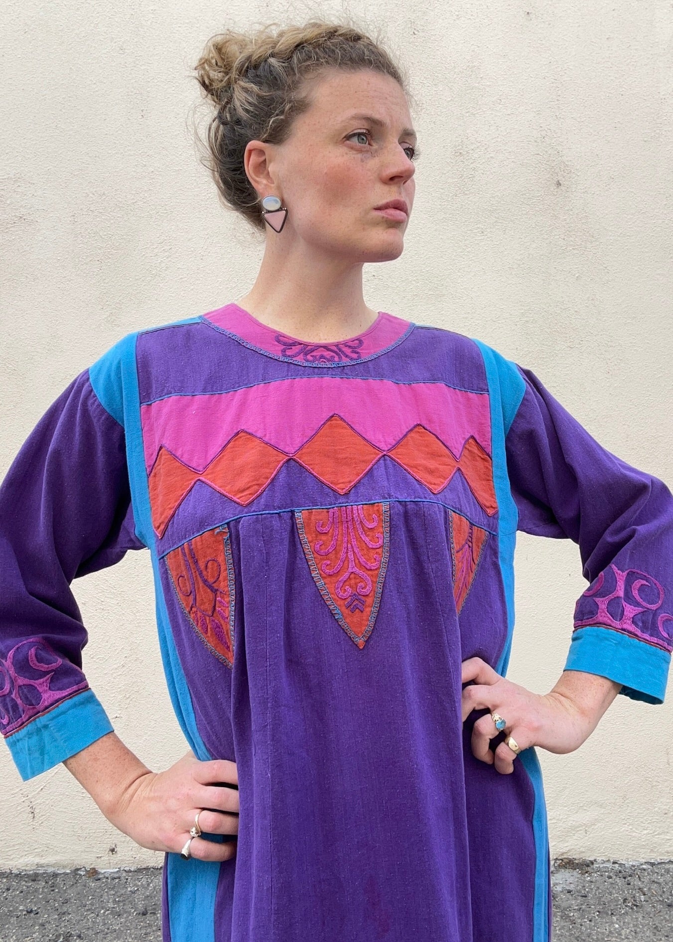 Vintage Josefa Purple Aqua Patch Dress. Great condition. Patched and embroidered maxi house dress with 3/4 sleeves and back zipper closure. 100% cotton, dry clean only. Made in Mexico.