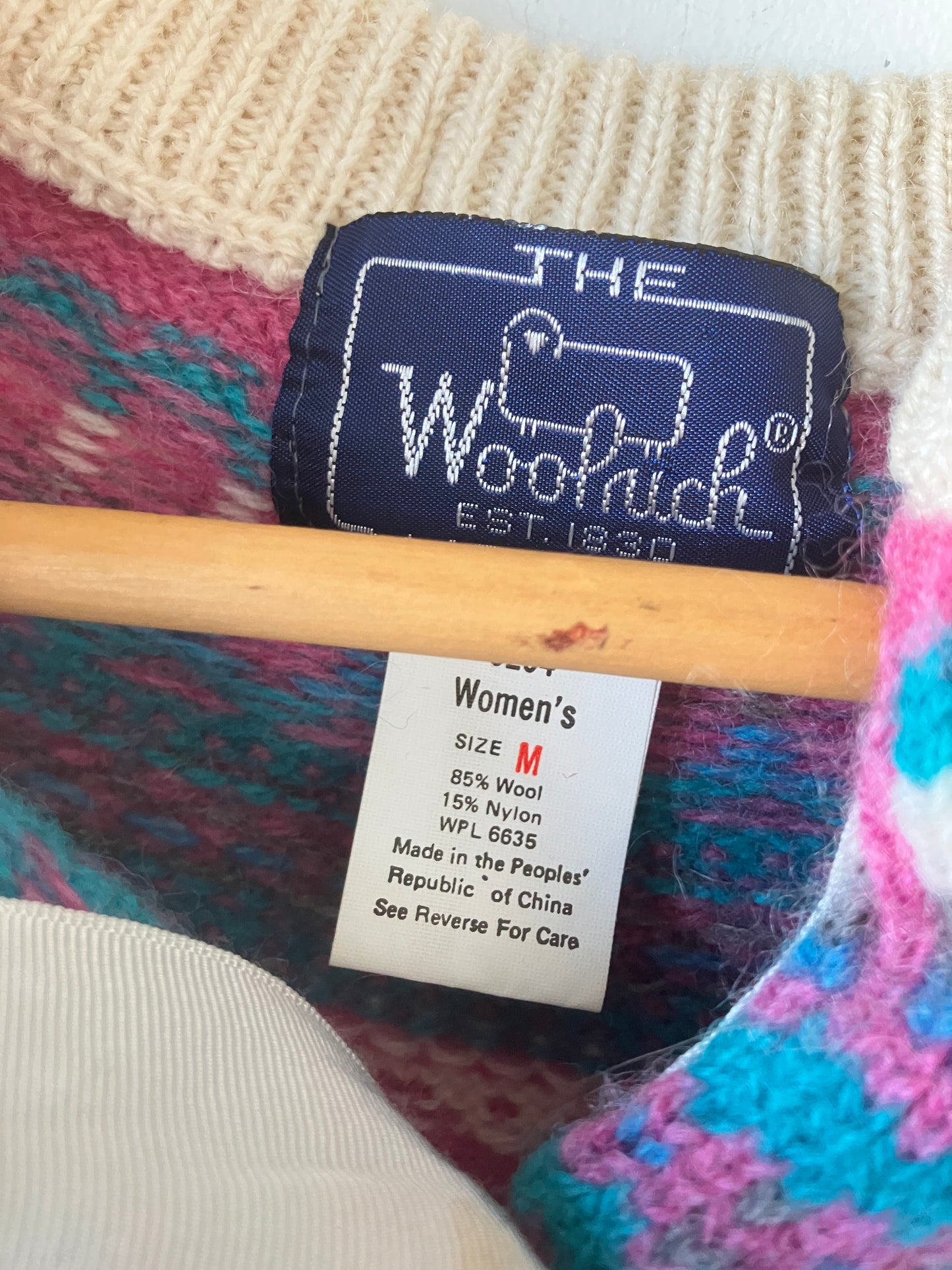 Vintage Woolrich Sweetheart Cardigan Knit in lovely vintage condition. Creamy button up with the most darling all-over heart pattern with traditional tiered coloring down from the shoulders. Taken in at waist and cuffs. SO precious! Some minor wear throughout, not noticeable. Marked size M, but fits many. 85% wool 15% nylon. Dry clean only. Vintage Banana Republic floral button-up looks SO cute paired with, and is still available - sold separately.