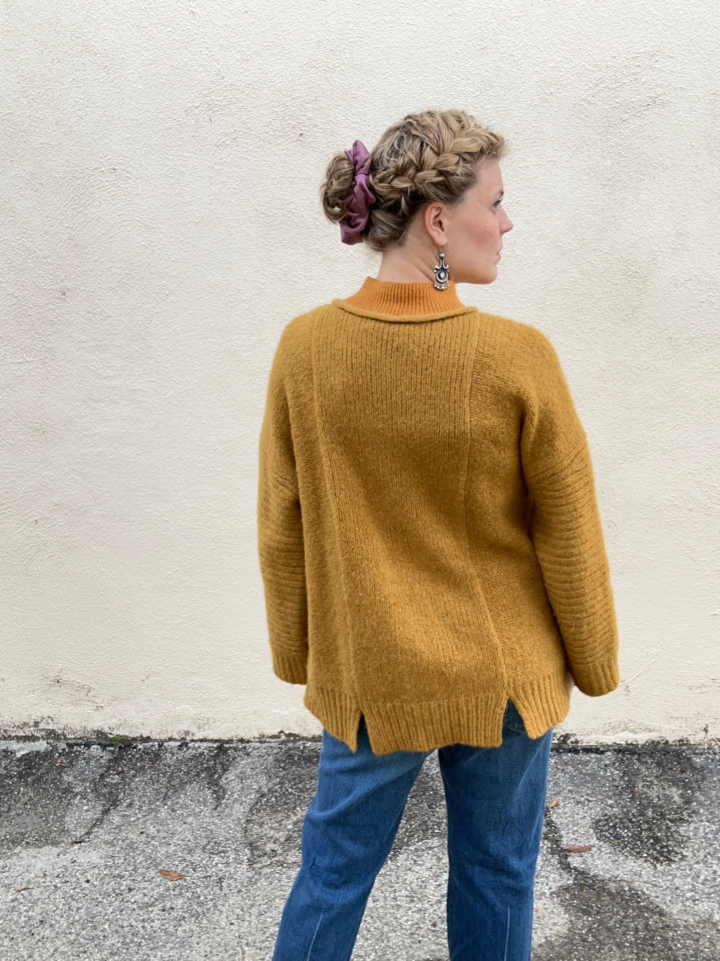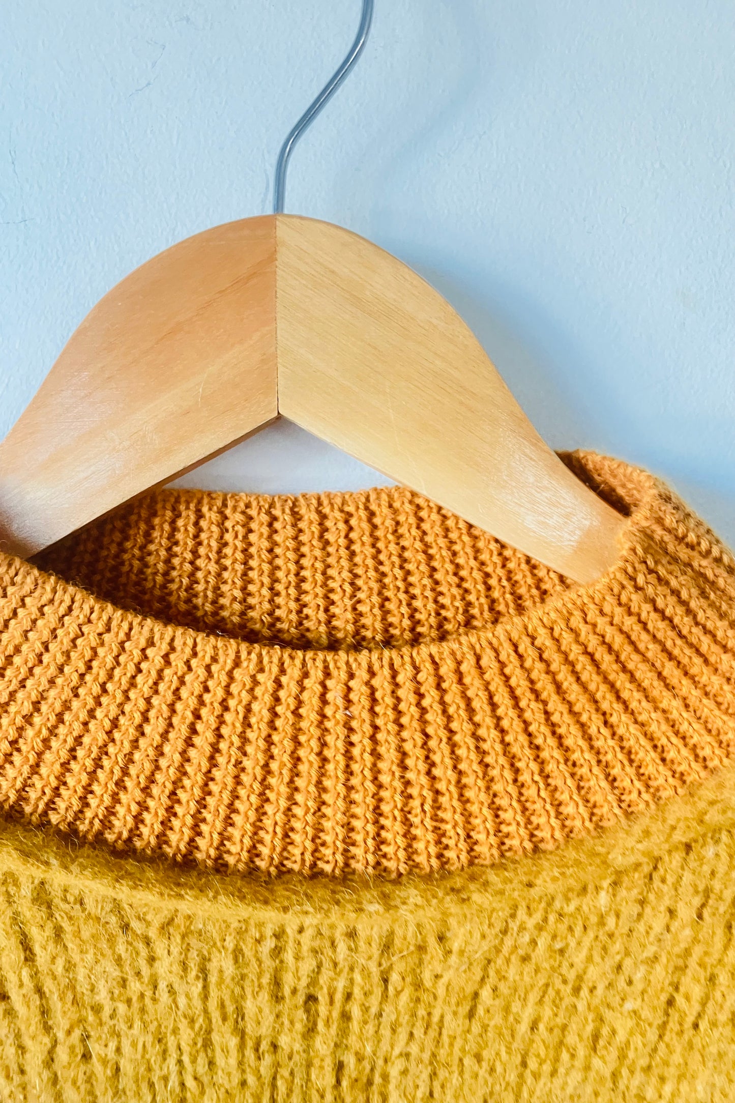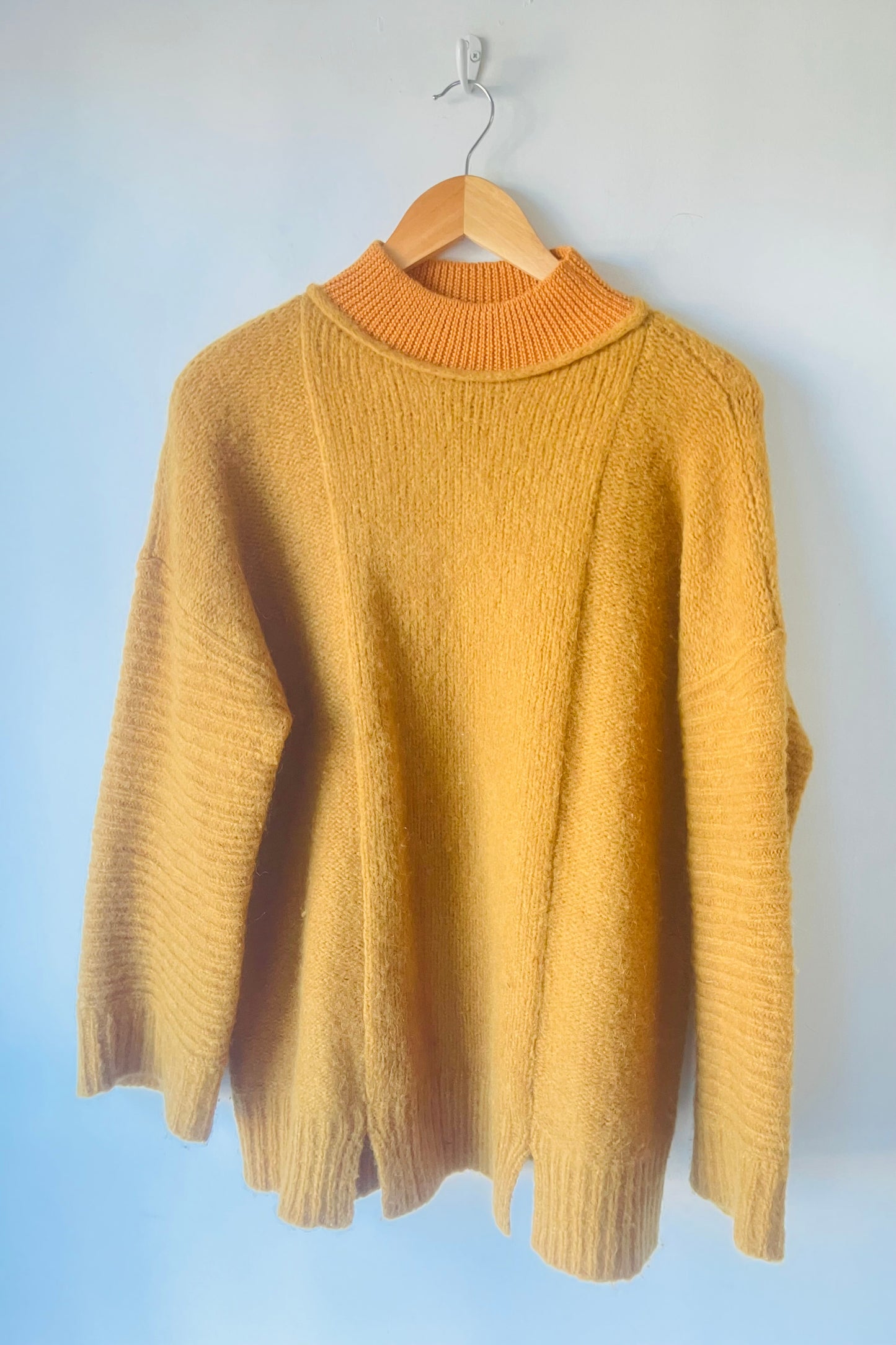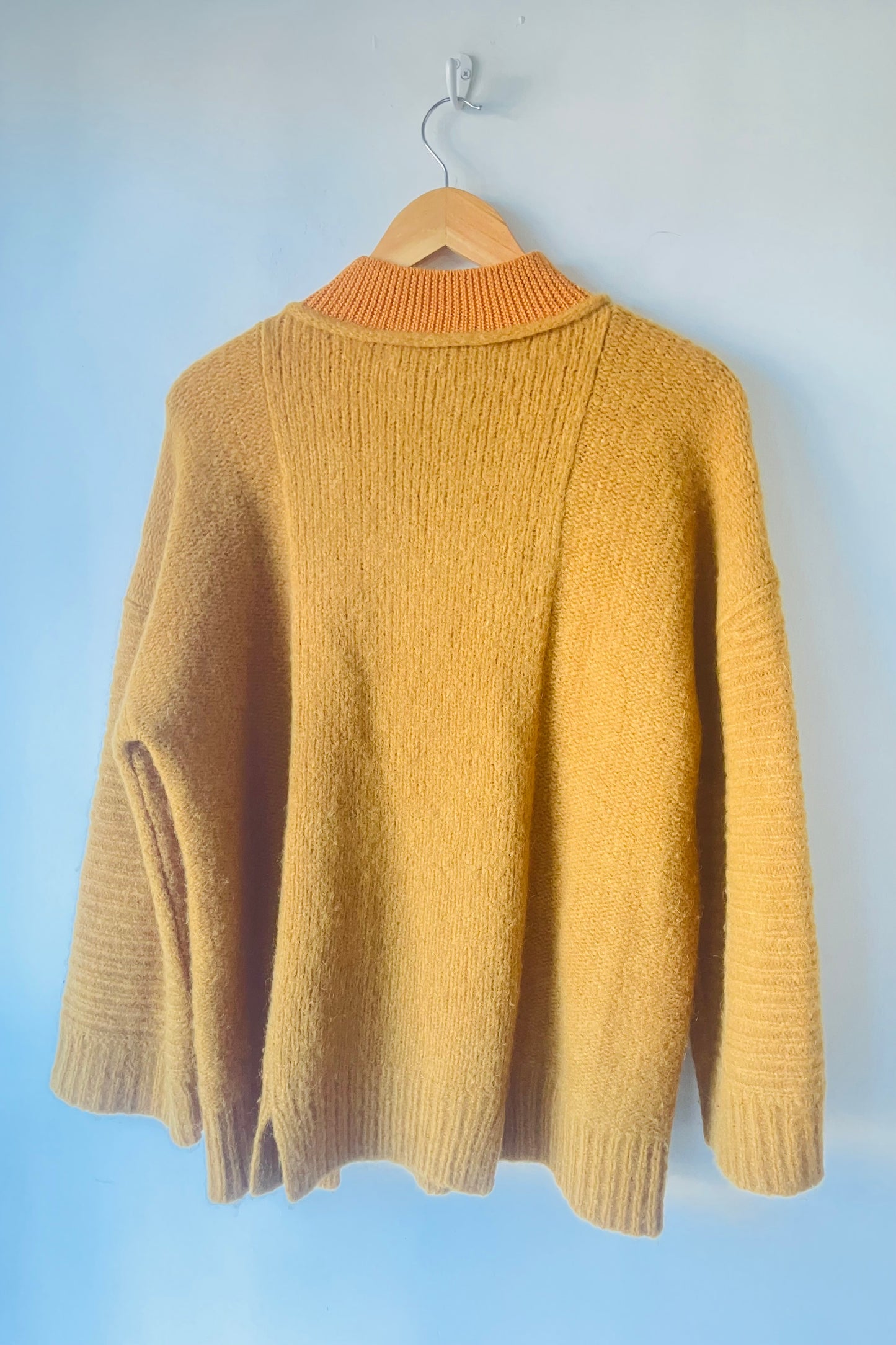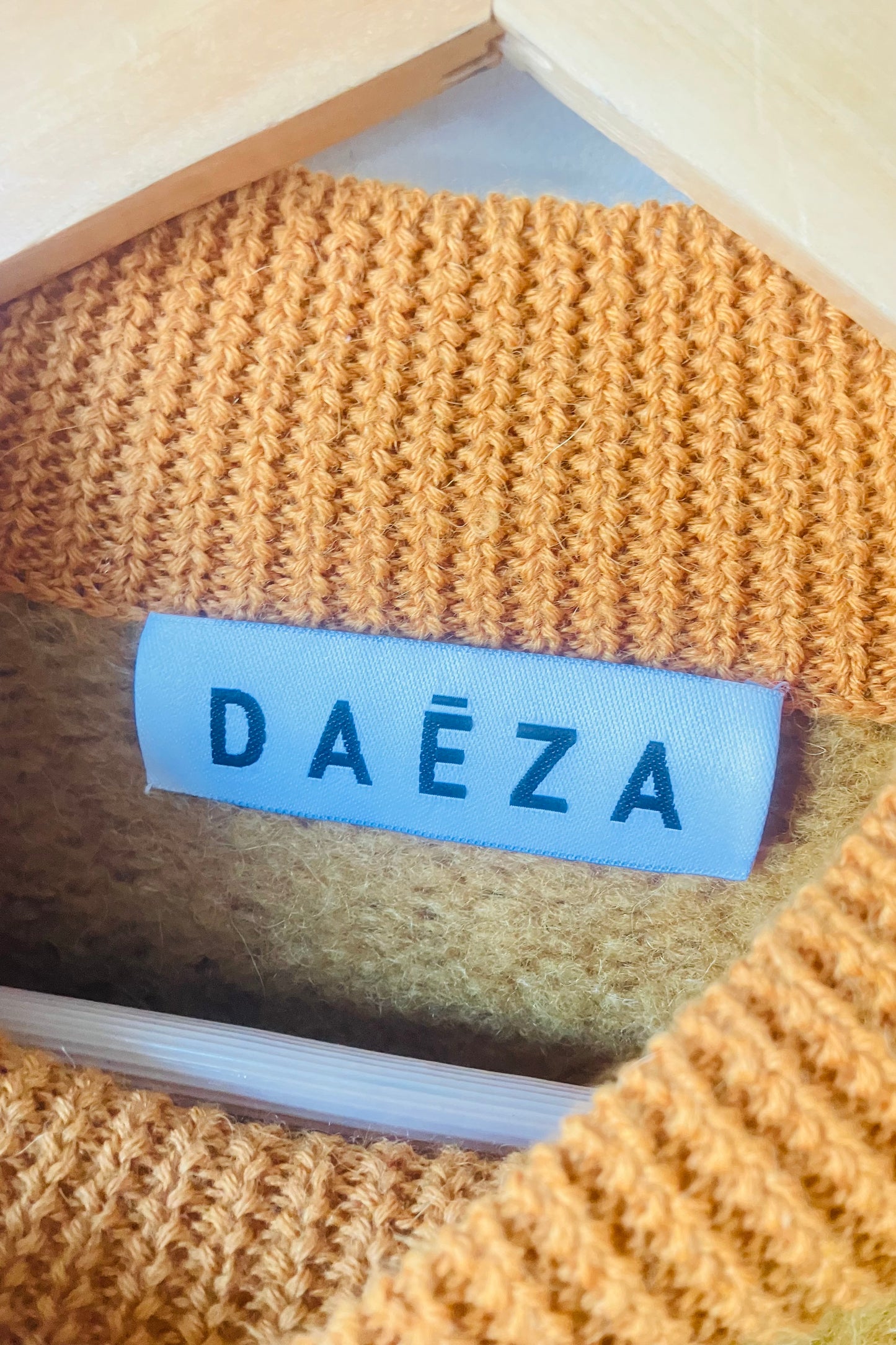 Daeza Mustard Alpaca Sweater in excellent condition. Gorgeous warm sunny tone! Slightly darker shade for the collar. Buttery soft. Marked size S/M. Made in Peru. Dry clean only. 47% baby alpaca, 40% wool, 13% polyamide.