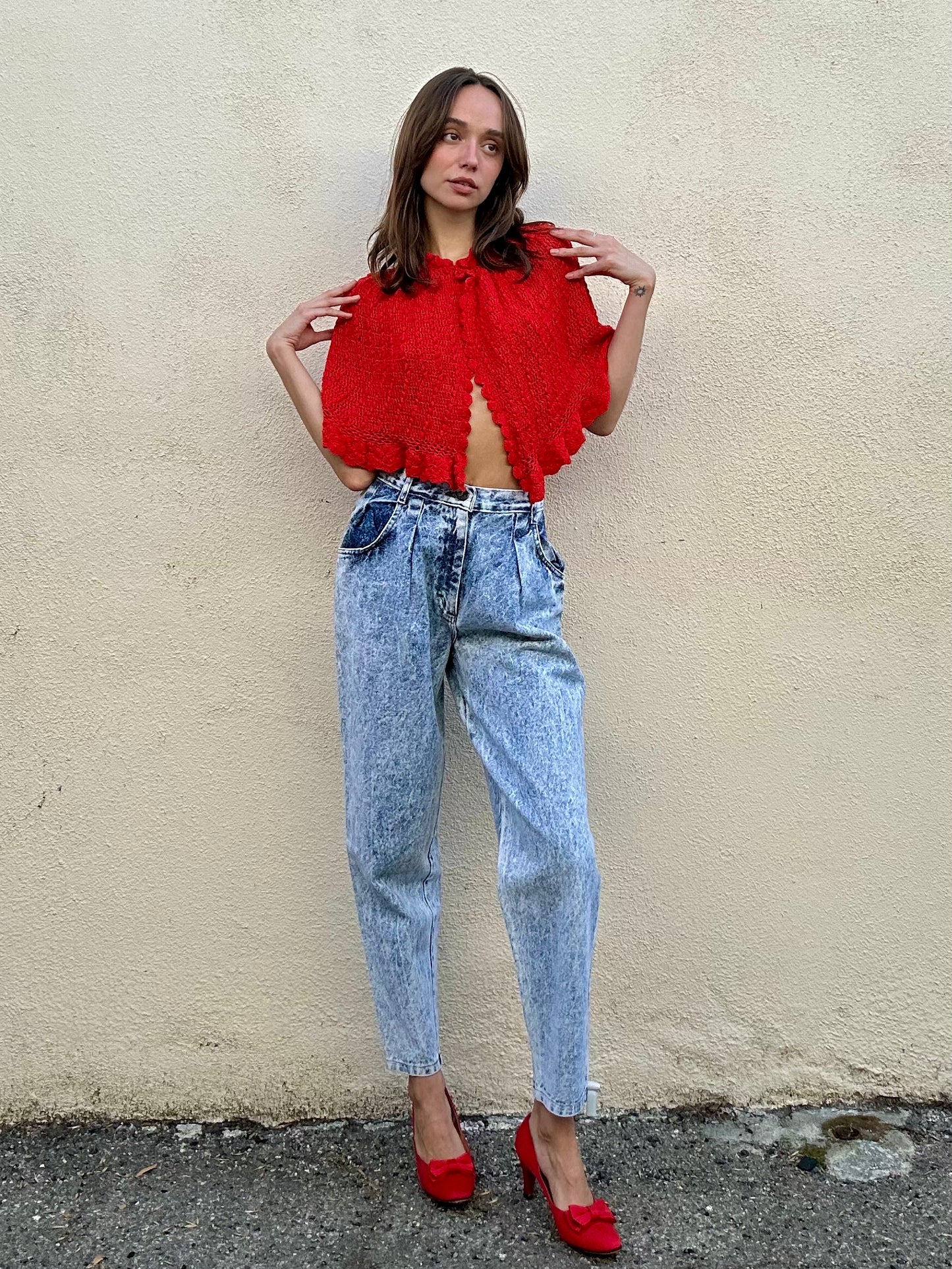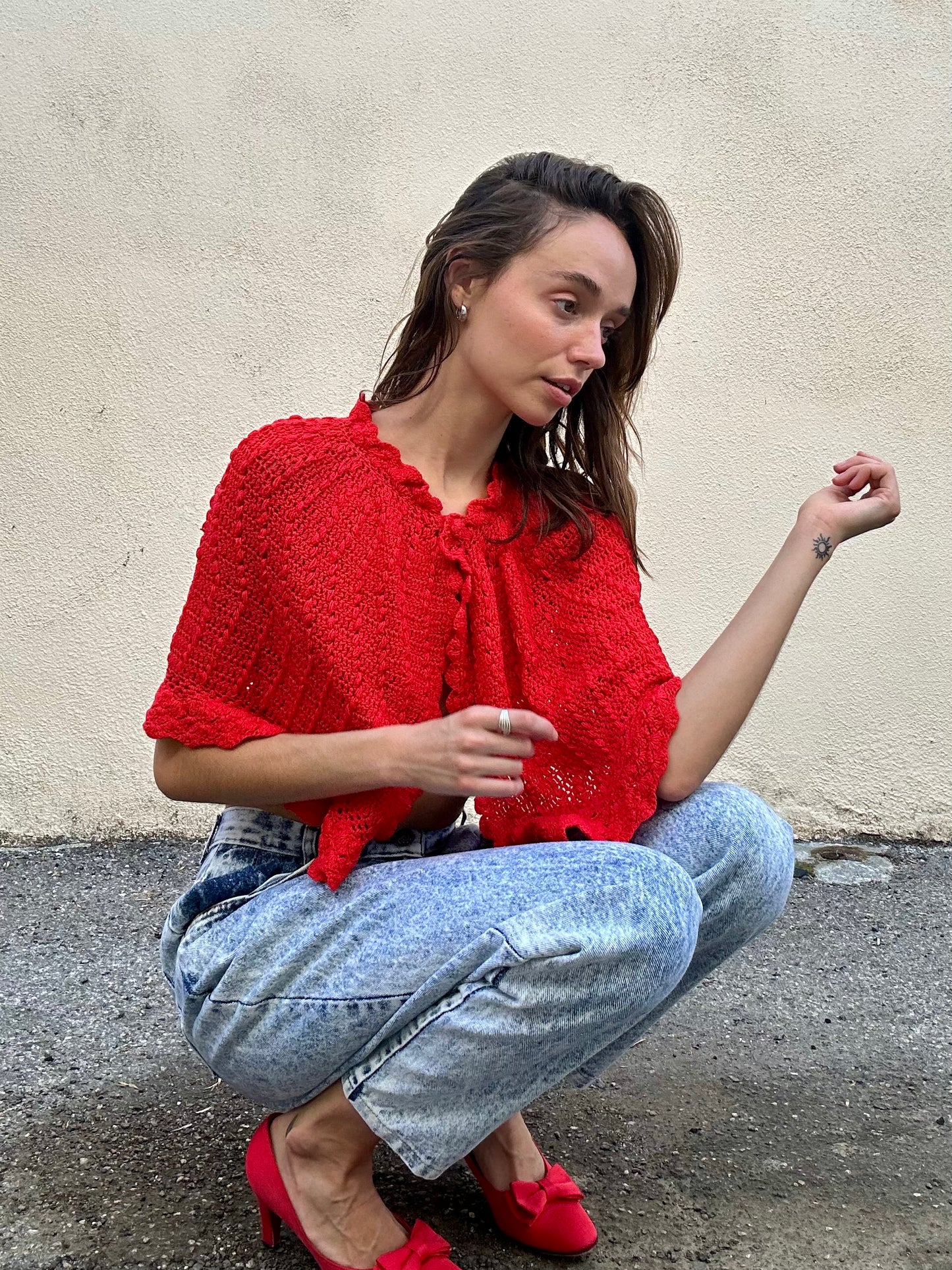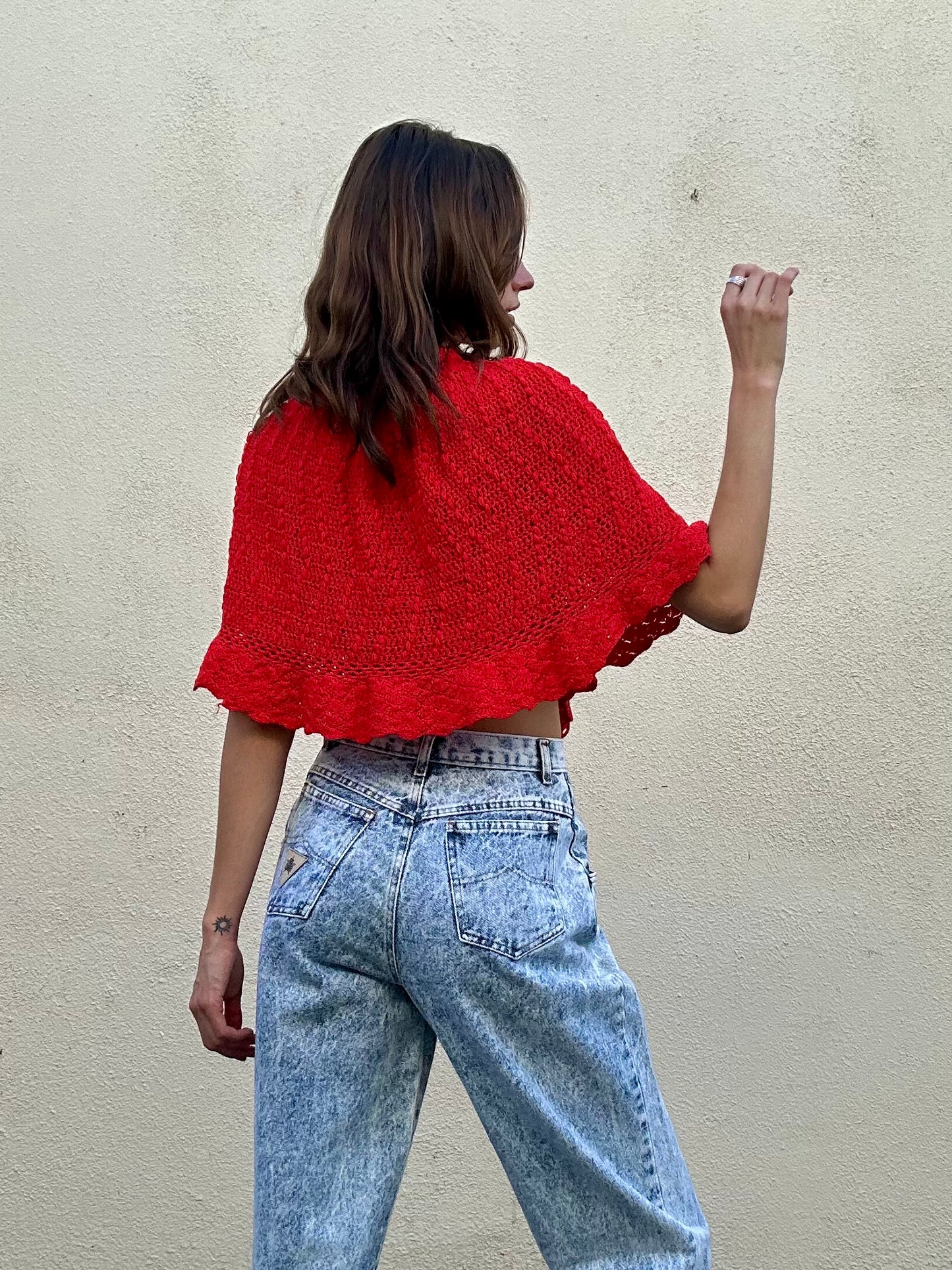 Vintage Red Crochet Capelet. Simply the cutest little red crocheted capelet you ever did see! Little red riding hood realness! Wear it as an additional layer over a little dress, or even on it's own with a bralette (or not...) Button closure at the top but otherwise loose and flowy. Unmarked material, feels like cotton yarn. Unmarked size, fits many due to nature of the garment, best fits a small through medium.