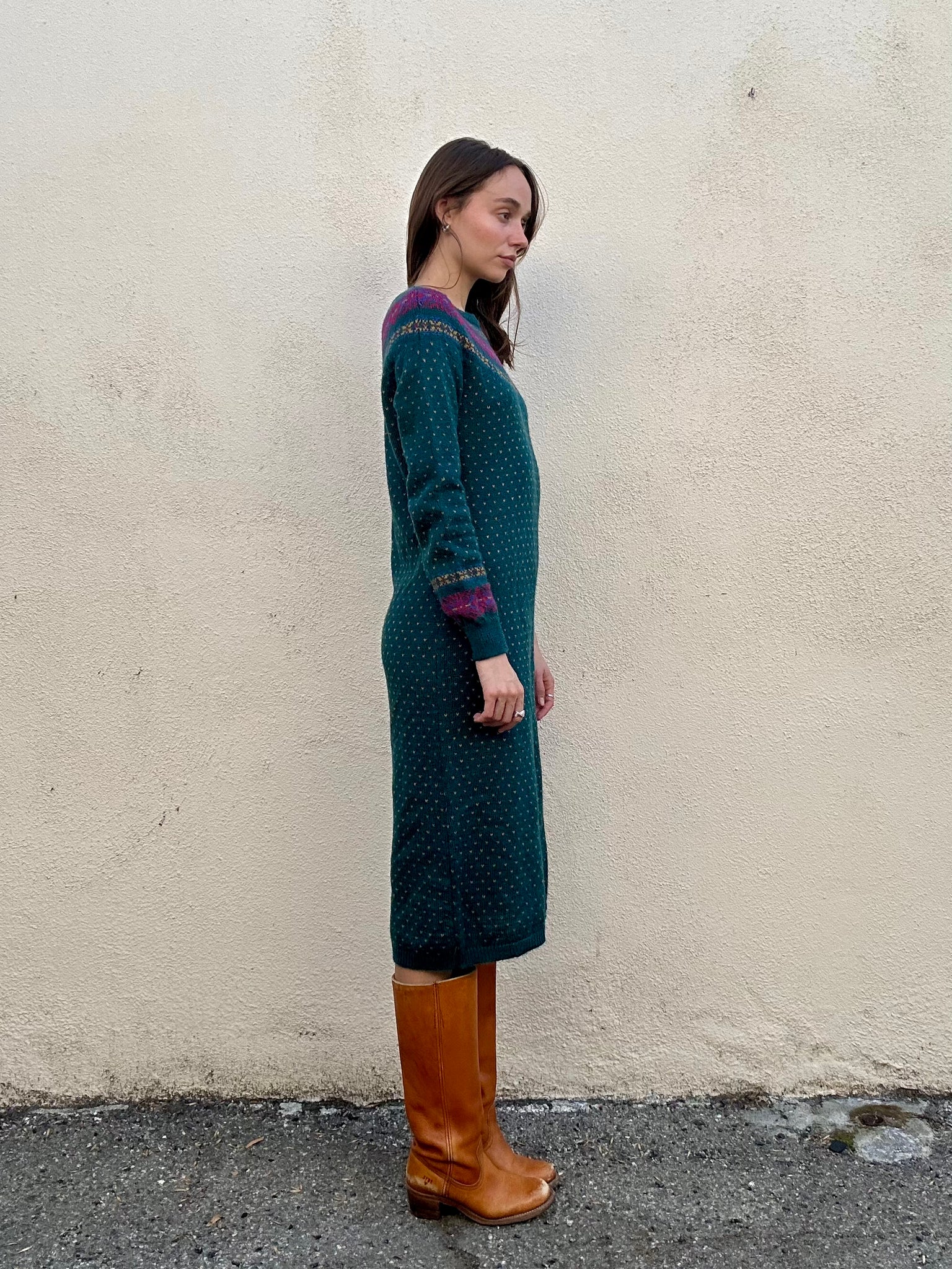 Esprit Plain Jane Green Fair Isle Sweater Dress. Move over, every single other sweater dress out there! This beautiful, deep green knit with multi color fair isle yoke and all over heart motif is gorgeous and unique with an easy silhouette. So good with a great pair of boots! Dress is in very good condition for age but has a small snag on front left armpit area as well as a minor defect in knit front hip area (see photos).