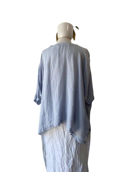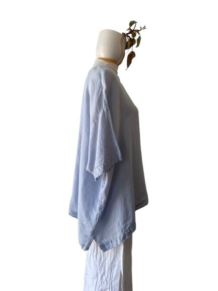 Eskandar Baby Blue Wide Linen Top. A lovely linen blouse in a beautiful pale blue color. Simple and elegant in design, comfortable and breathable linen fabric. Linen is soft to the touch and not scratchy. 100% linen. Made in England. In very good condition, no notable flaws. Unmarked size would best fit M-L, please refer to measurements.