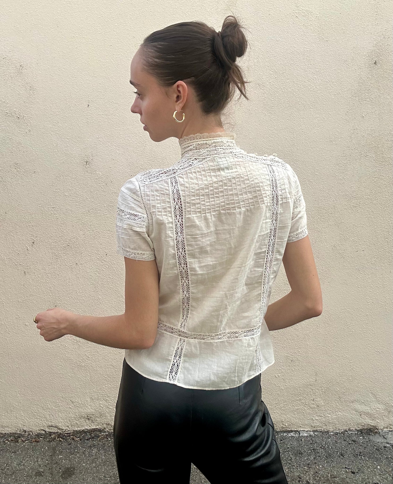 This no label cream lacy top is just darling. With a high lacy neck, gorgeous lace detail down the bodice. and on the sleeves, everything about this top says dainty and delicate. This top has a button closure for the neck and a zipper on the bodice, and is made from 100% cotton.