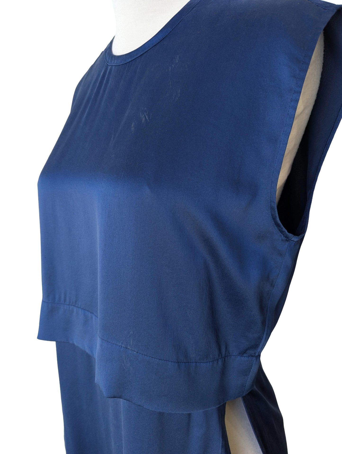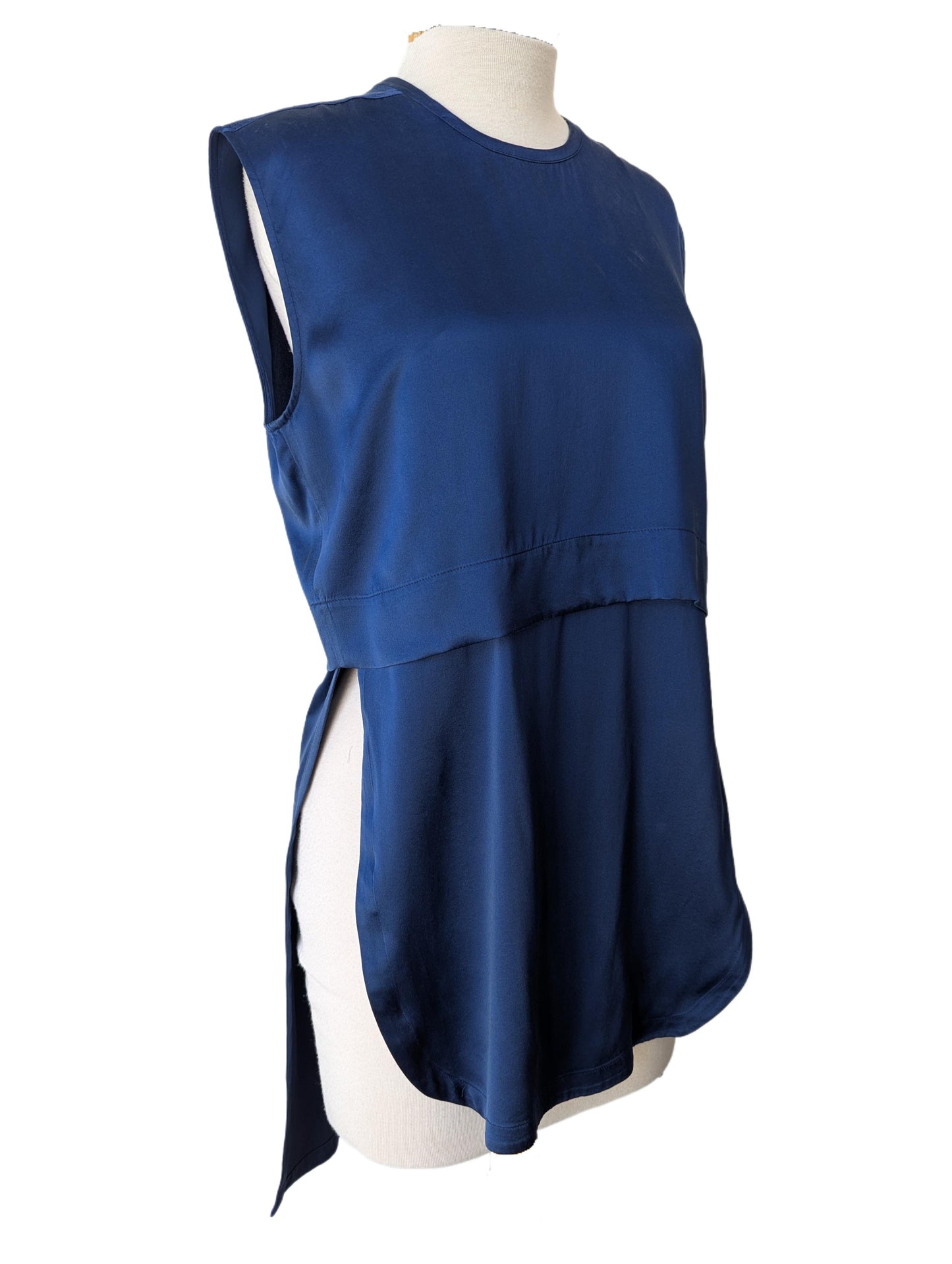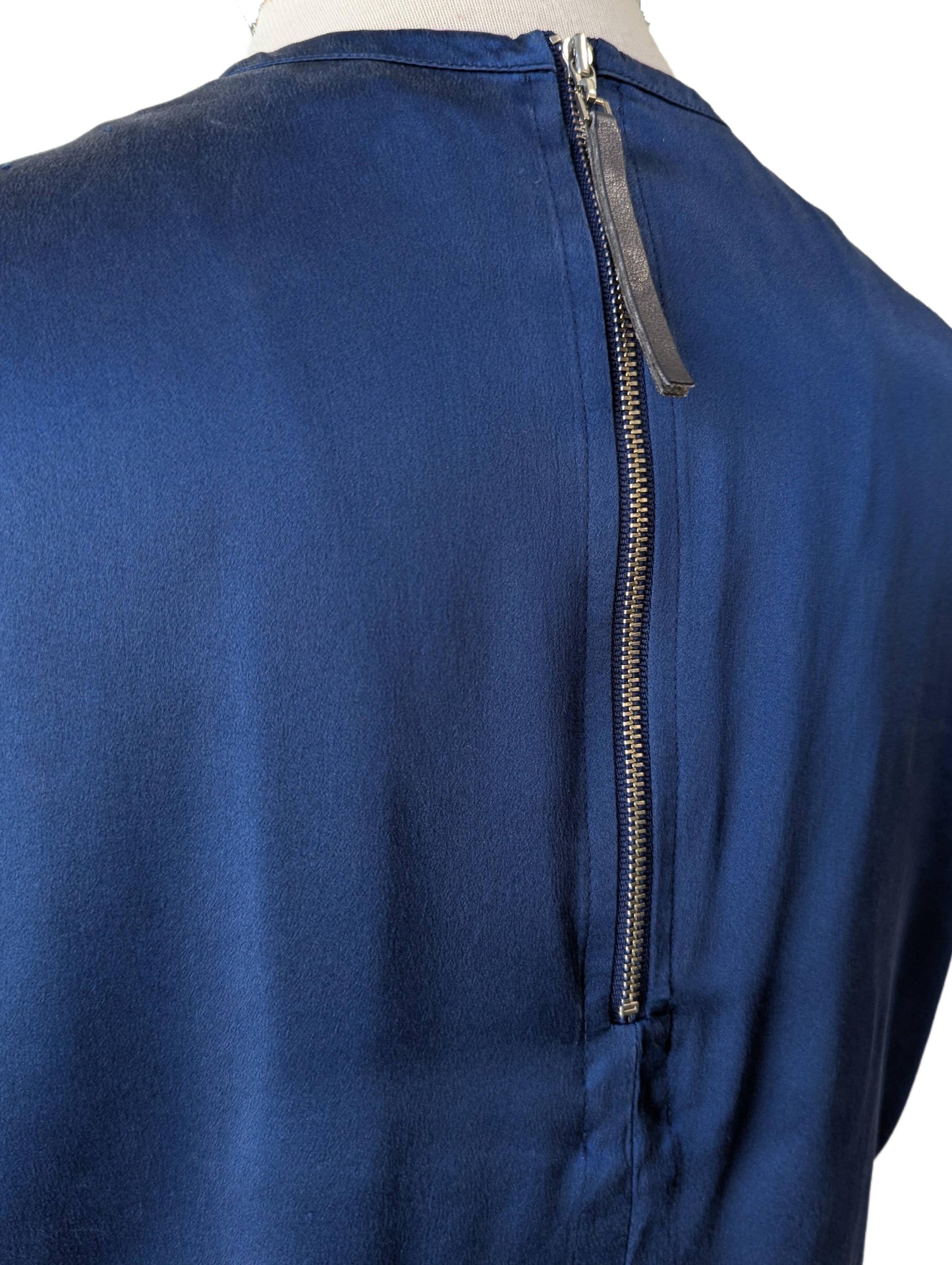 Channel your inner Greek goddess in this Helmut Lang silk top. Liquid charmeuse and a tunic-style cut nod to classical chiton shapes, while the layered front panel and long side slits create fluid, modern movement. A clean neckline, rounded hem corners, and exposed back zipper with a long leather pull keep the look sharp. It’s part sculpture, part draped poetry, and yes, there’s a touch of discoloration, but consider it the kind of patina any true artifact earns over time. Top is sold as-is and has some minor discolorations (pictured).