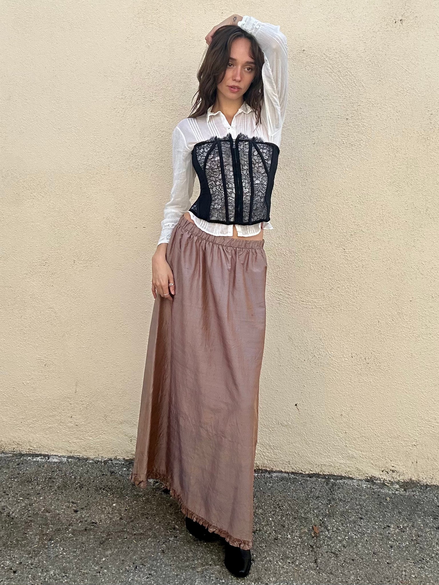 YSL Yves SAINT LAURENT Lace Bustier Top. Black lace and chiffon mixed bustier top with center front zipper closure. Scalloped edge lace trims the top edge. Has some pulling along the side seams at boning. No marked content, feels like silk mix. No marked size, fits XS/S best. Made in France.