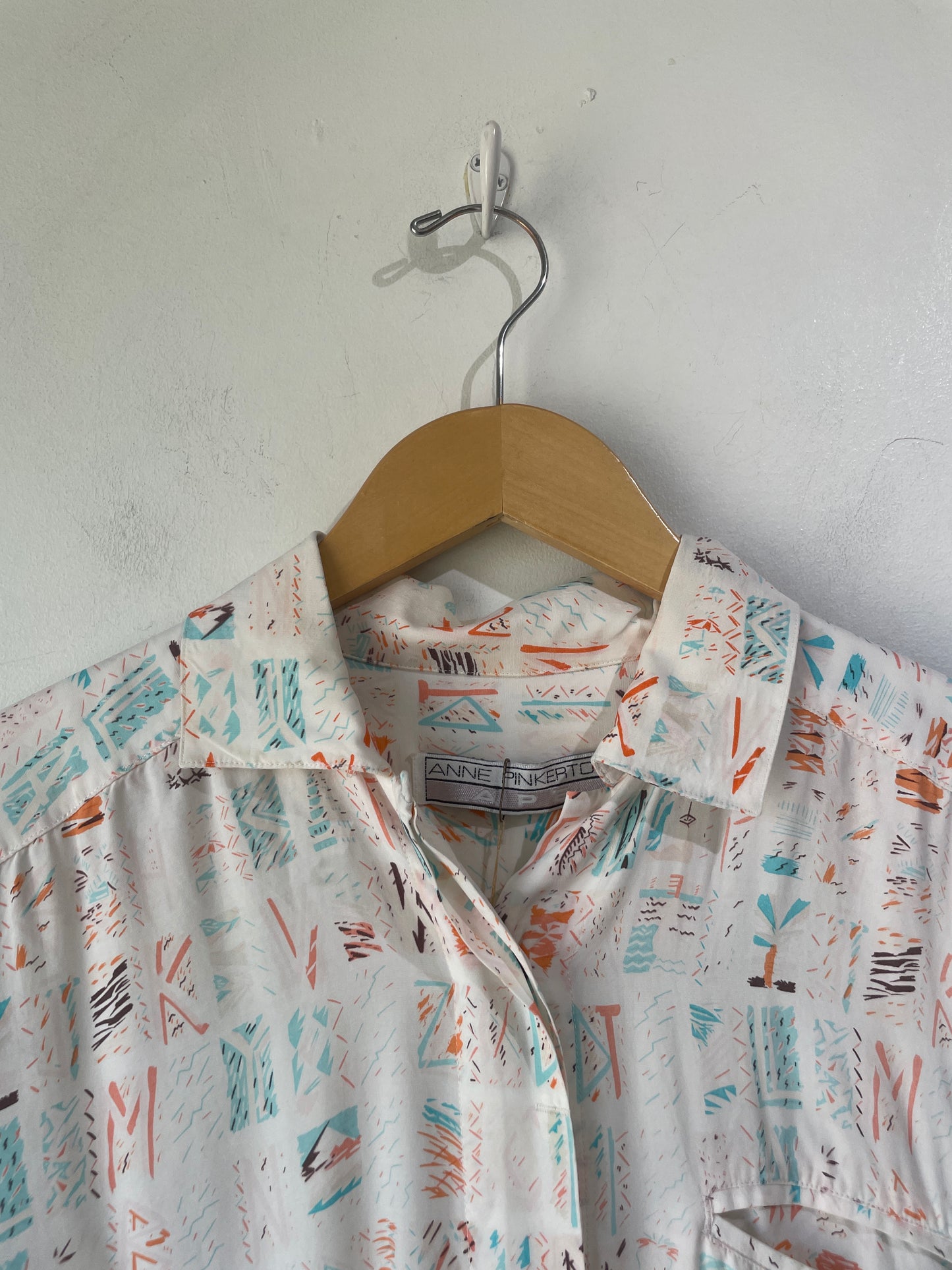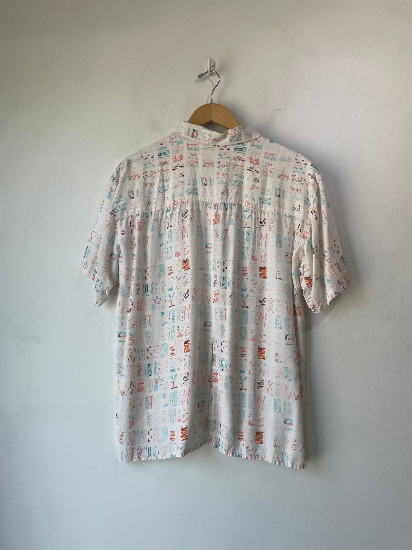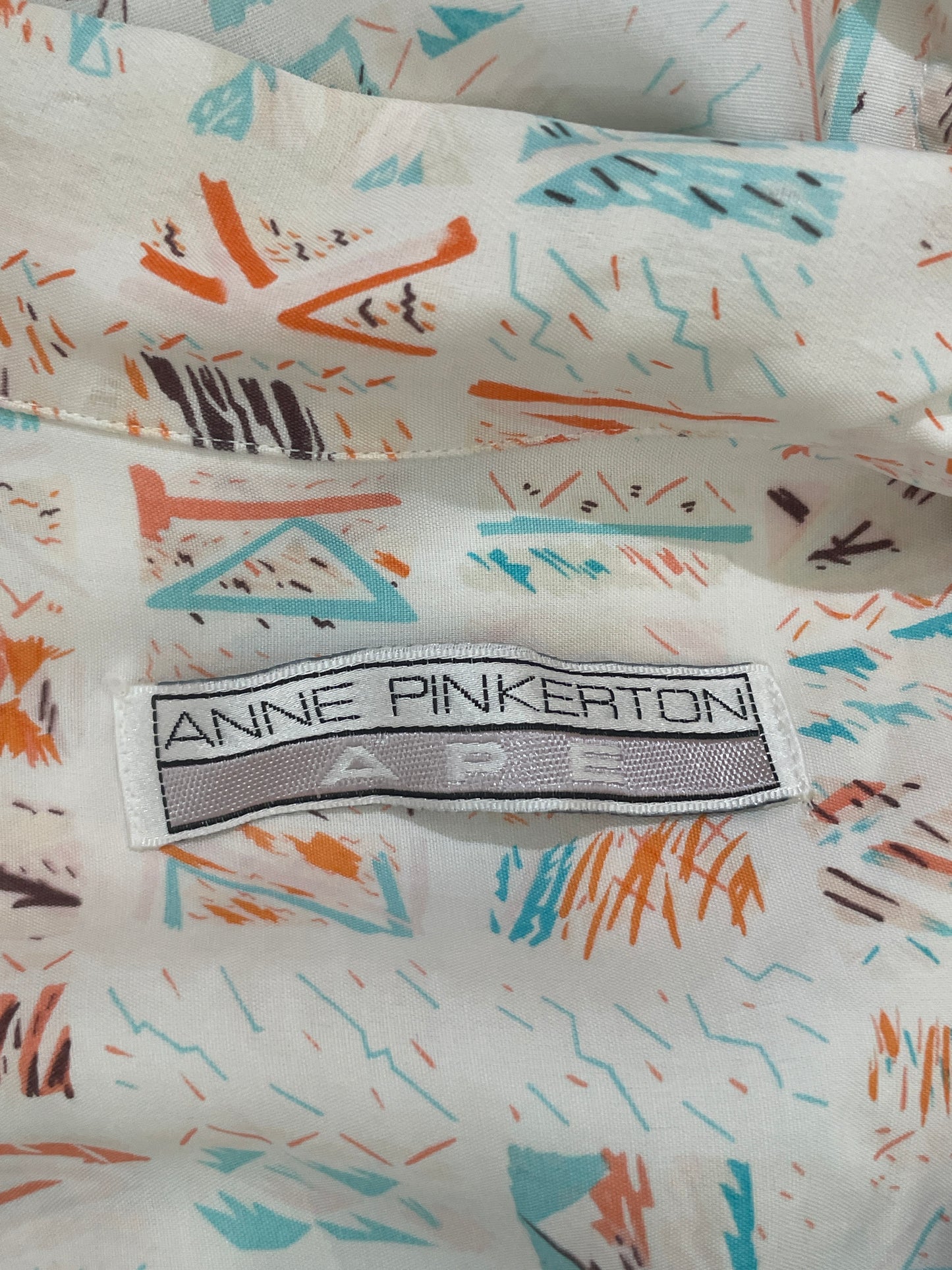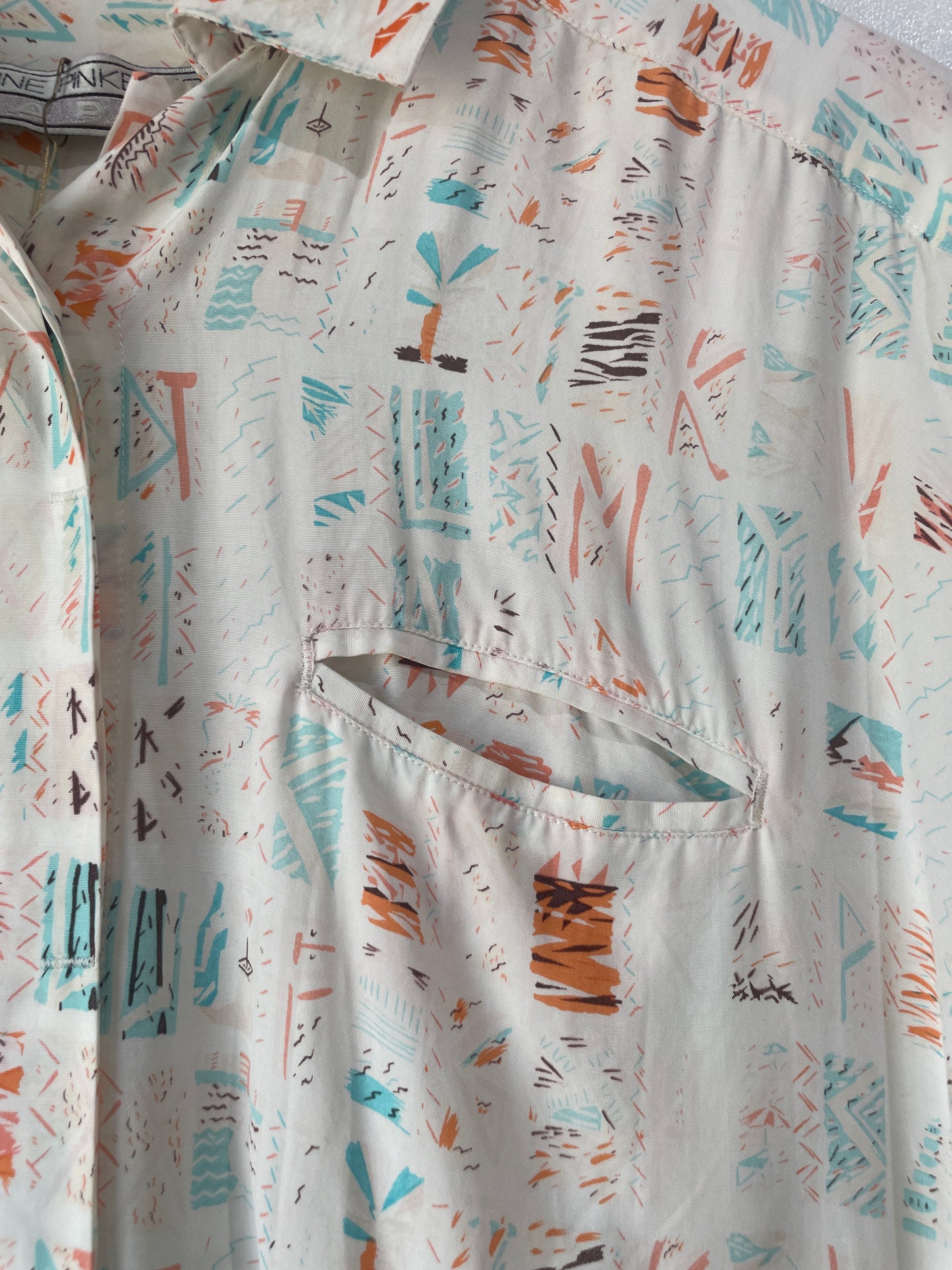 Anne Pinkerton Orange Blue Geometric Hawaiian Shirt. A beautifully patterned shirt in an eye-catching tropical print. Features a double welt pocket on front and spread collar detail. Very comfortable and breathable material. 100% rayon. Made in Hong Kong. In very good condition. Marked size M, please refer to measurements.