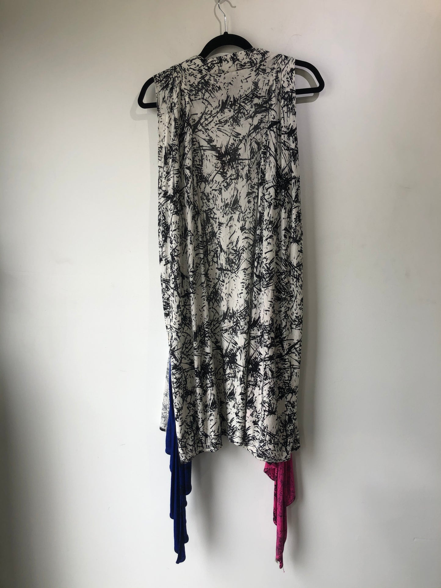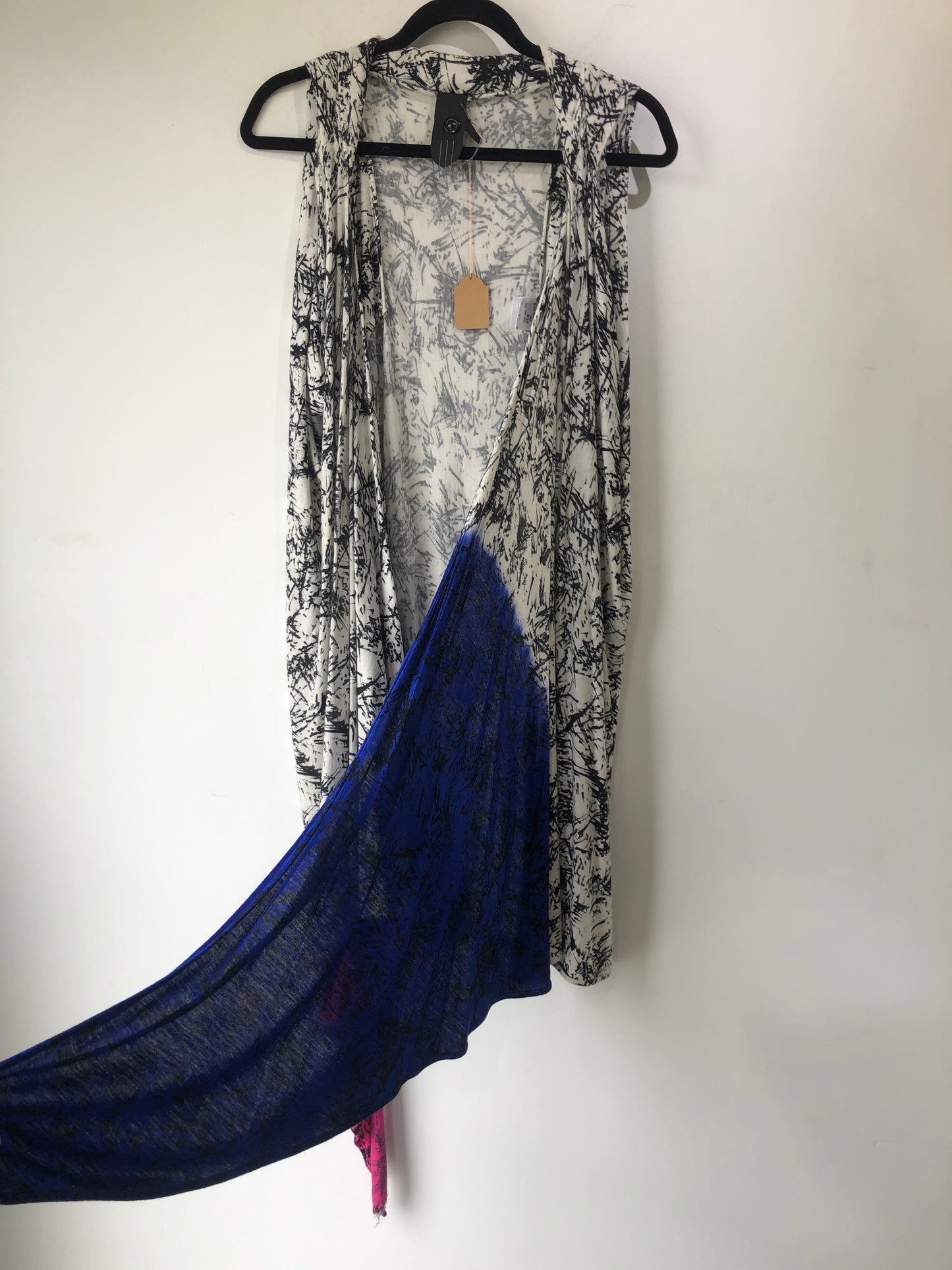 Bernard Wilhelm Long Vest. Printed jersey knit open front vest with contrast dip dye at front. 80% Rayon 20% wool knit. Made in Japan.