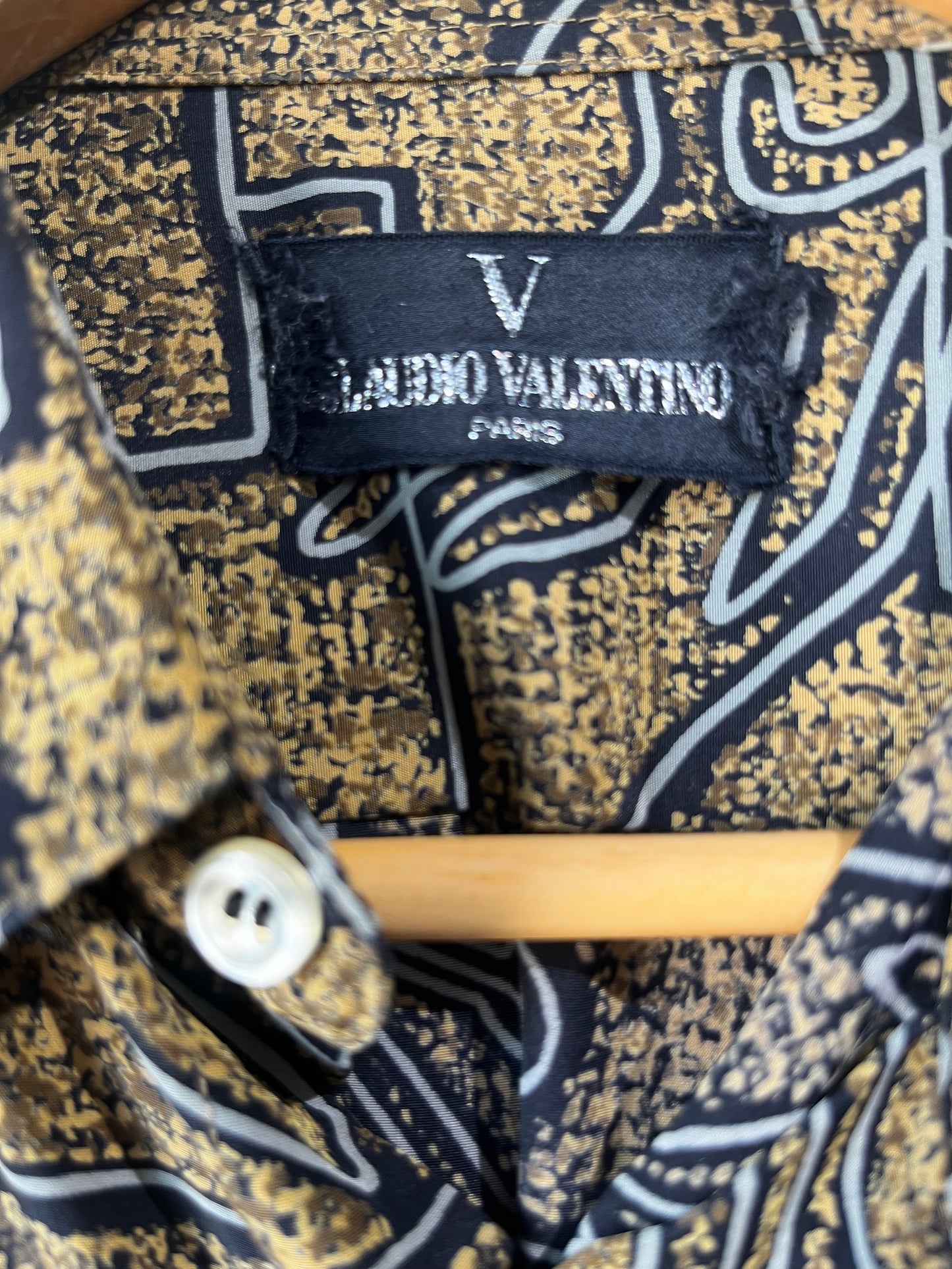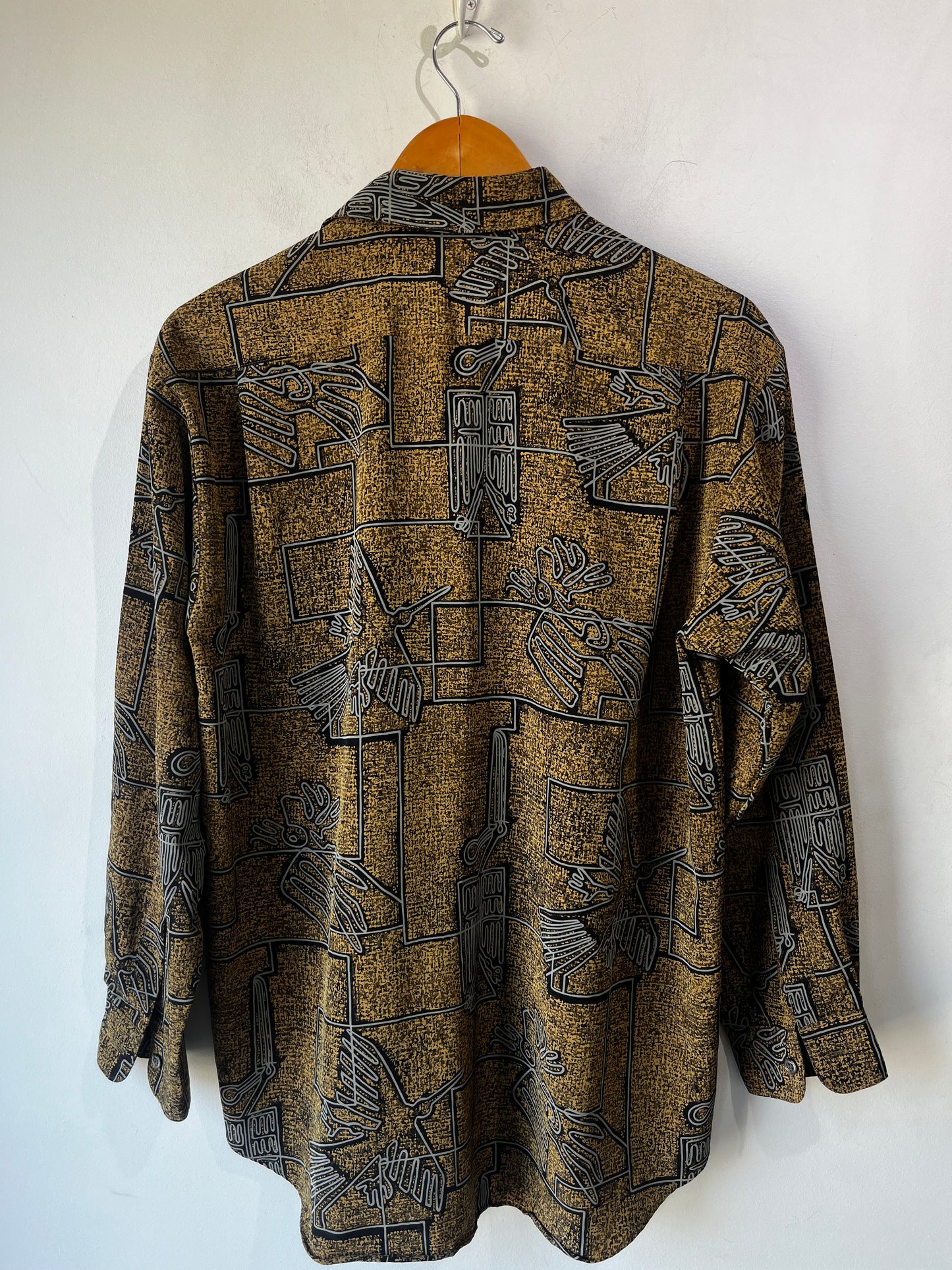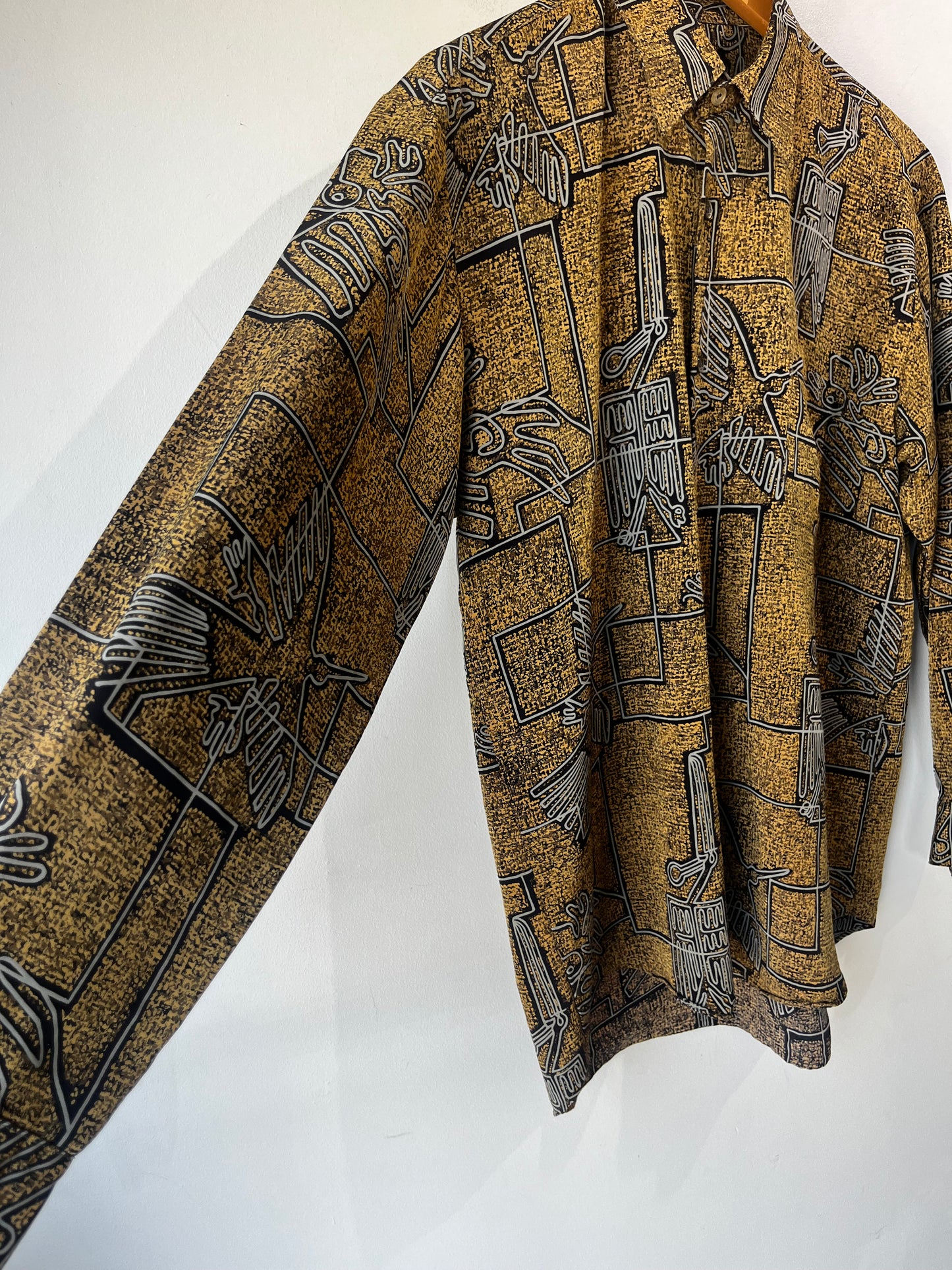 Claudio Valentino Abstract Print Men's Shirt. Turn up the volume with this funky fun print shirt! An olive abstract basketweave print serves as the background to a large scale Mayan inspired graphic print. Shirt has a pocket on the left chest and features a dropped rear hemline for maximum untucked style! Garment is in excellent condition and is free of stains, tears and defects.