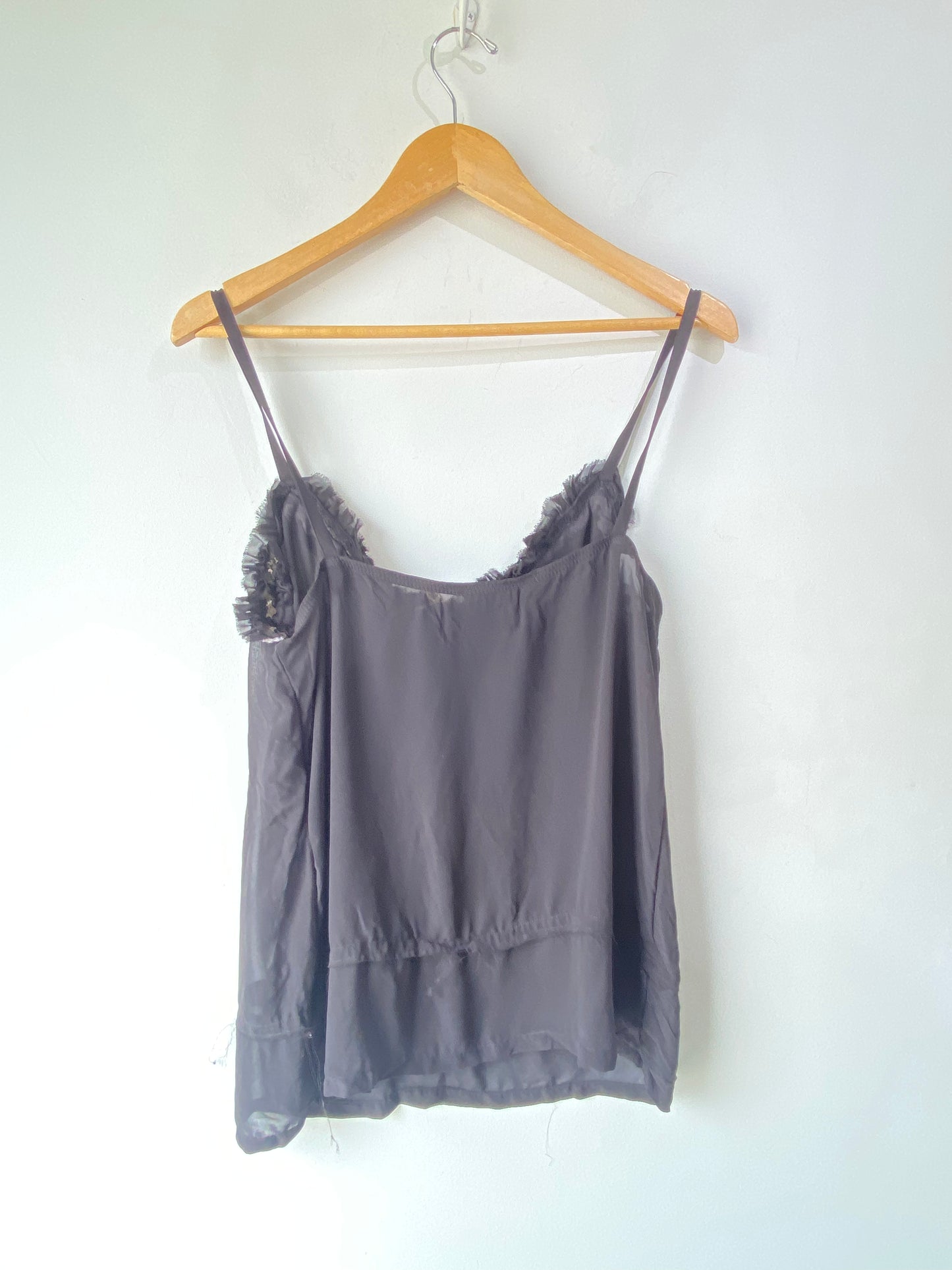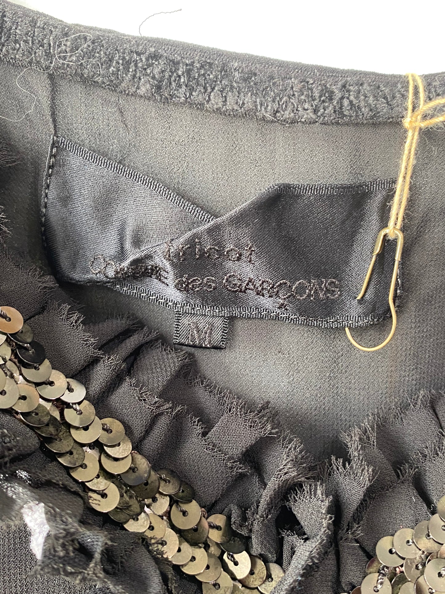 Comme des Garcons 2008 Black Sequin Cami! A sheer top that features black sequins along the collar and has spaghetti straps. 100% polyester. Dry Clean Only. Made in Japan. Marked a size medium. In excellent condition!
