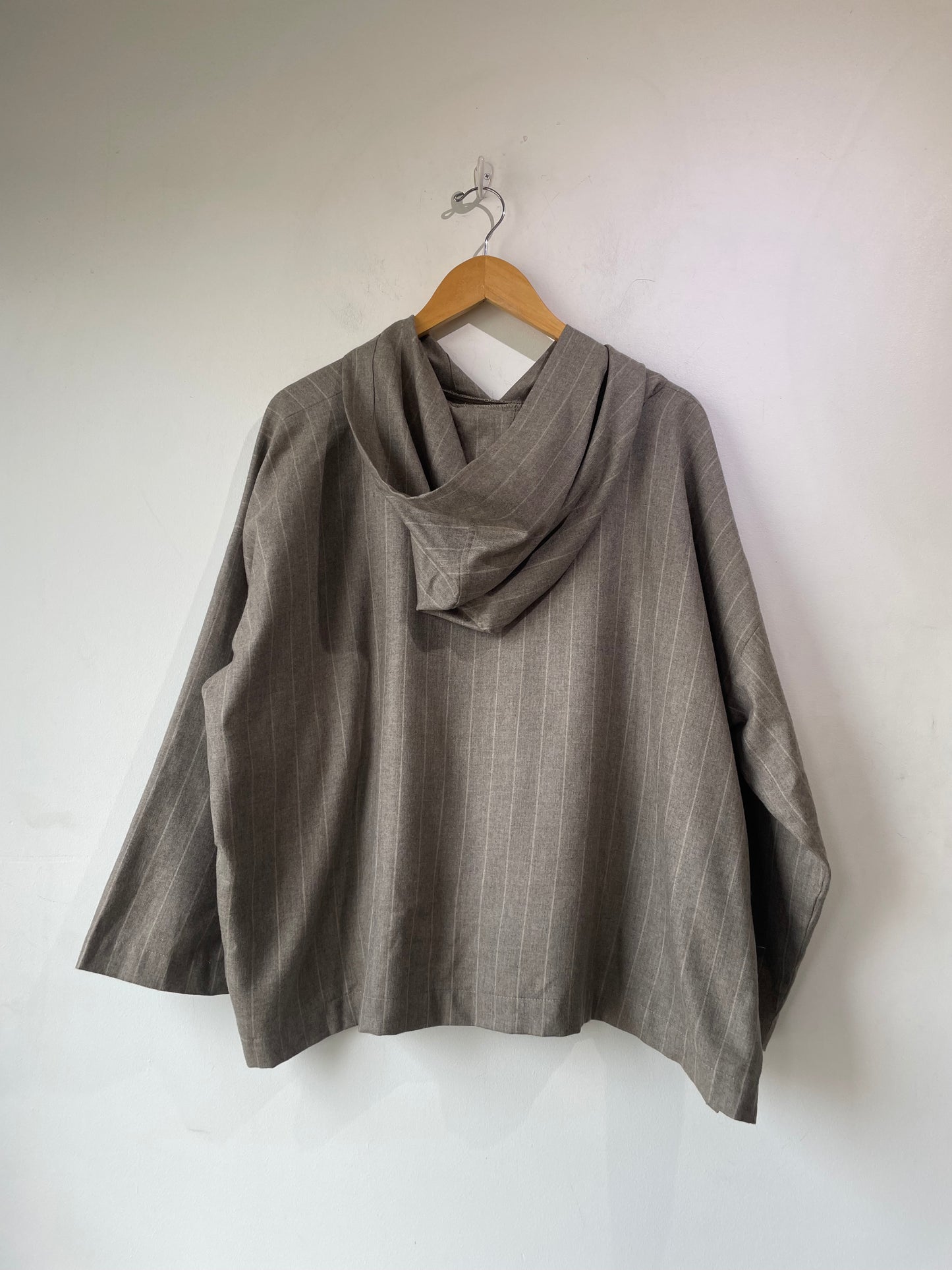 Eskandar Light Brown Striped Hooded Cashmere Top. A beautiful brown/gray striped top. Features hood and luxurious cashmere/silk blend fabric. For Neiman Marcus. In good condition with the exception of a repair on the front, pls see photos. Made in England. 93% cashmere 7% silk. Tagged size 0, fits oversized so could fit S-L, please refer to measurements.