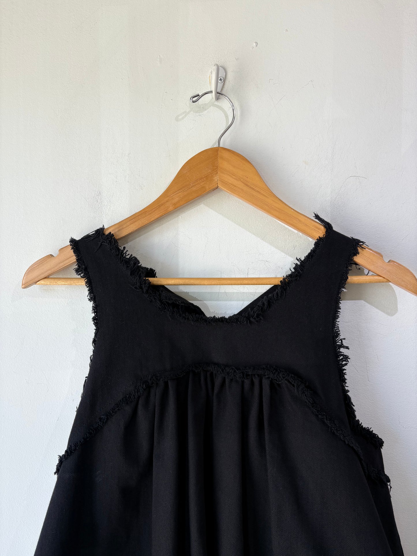 This playful Italian designer black tank top features a chic cutout back that adds a flirty twist. Crafted from soft cotton, it boasts frayed raw edges for an effortlessly cool vibe. The shorter front and longer, rounded back create a fun, dynamic silhouette perfect for layering or wearing solo on sunny days.