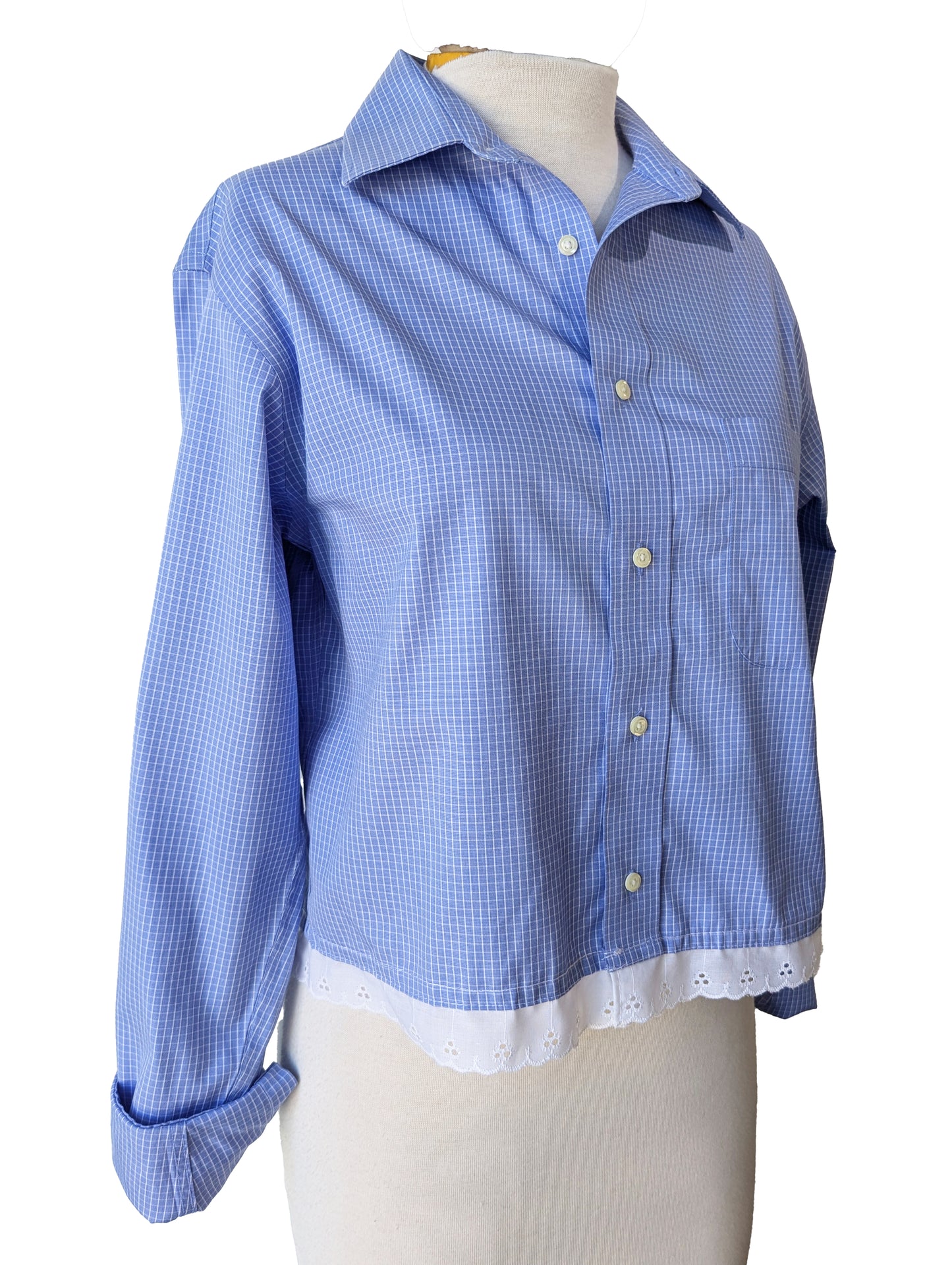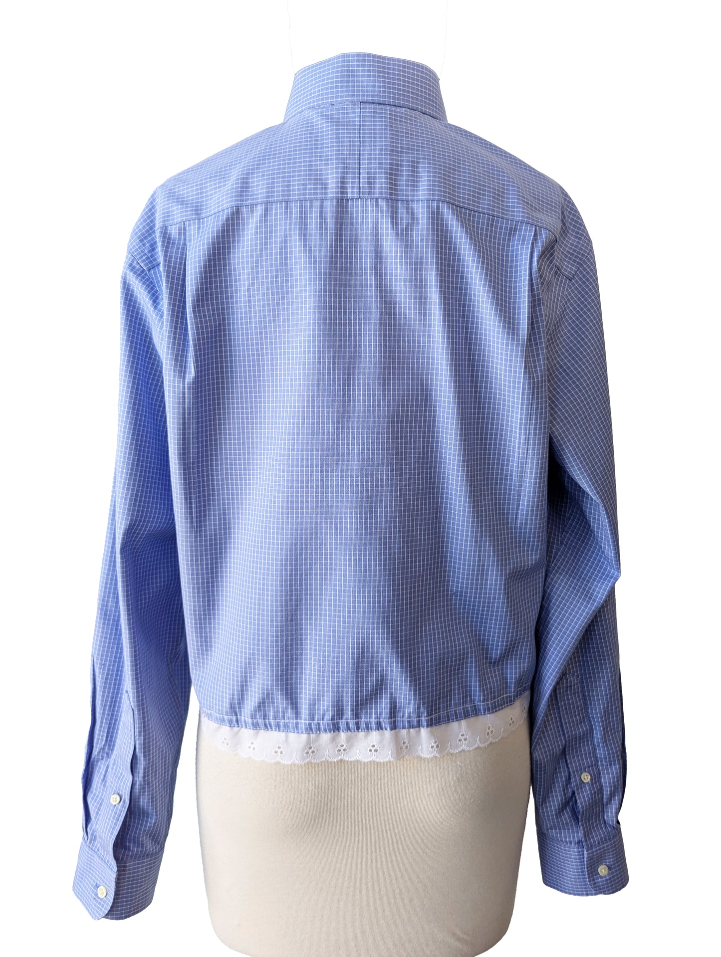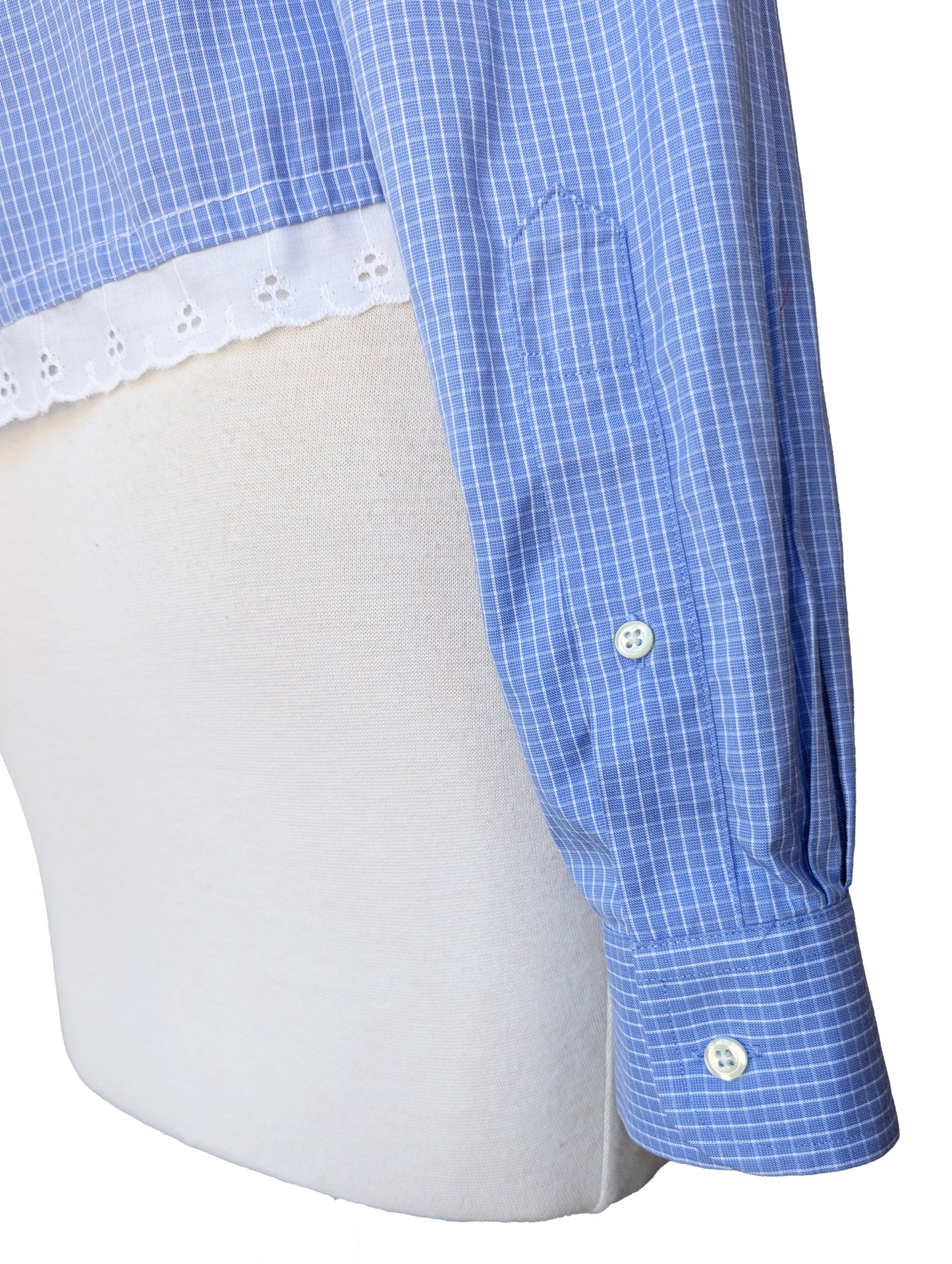 Jos. A. Bank Blue & White Grid Pattern Shirt with Lace Detail upcycled by Wishful Sinful Vintage in Los Angeles -- a power shirt with a playful edge.