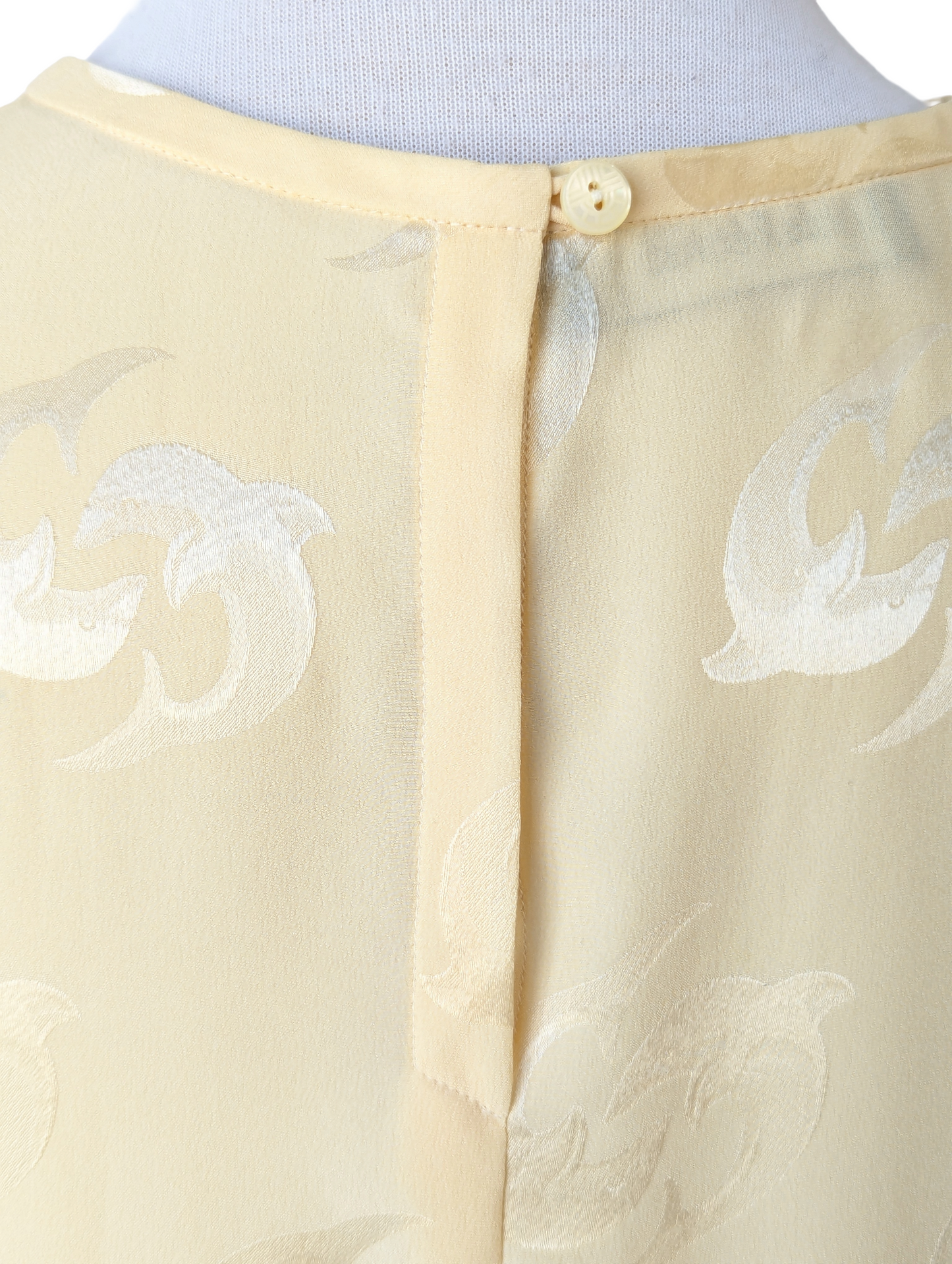 Light and airy, this Louis Féraud silk top is summer elegance with a splash of fun. The buttery yellow jacquard pattern of paired dolphins adds a whimsical, beach-day twist to its flowy shape. A breezy drape keeps it effortless, while the back opening with a single button offers an easy, graceful finish. Perfect for catching both sunshine and compliments. Top is in excellent condition and is free of notable flaws.