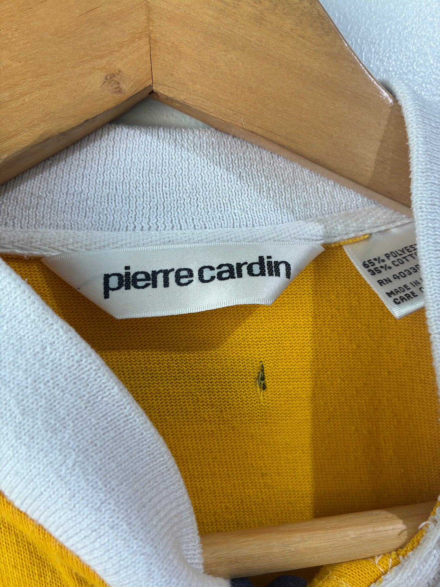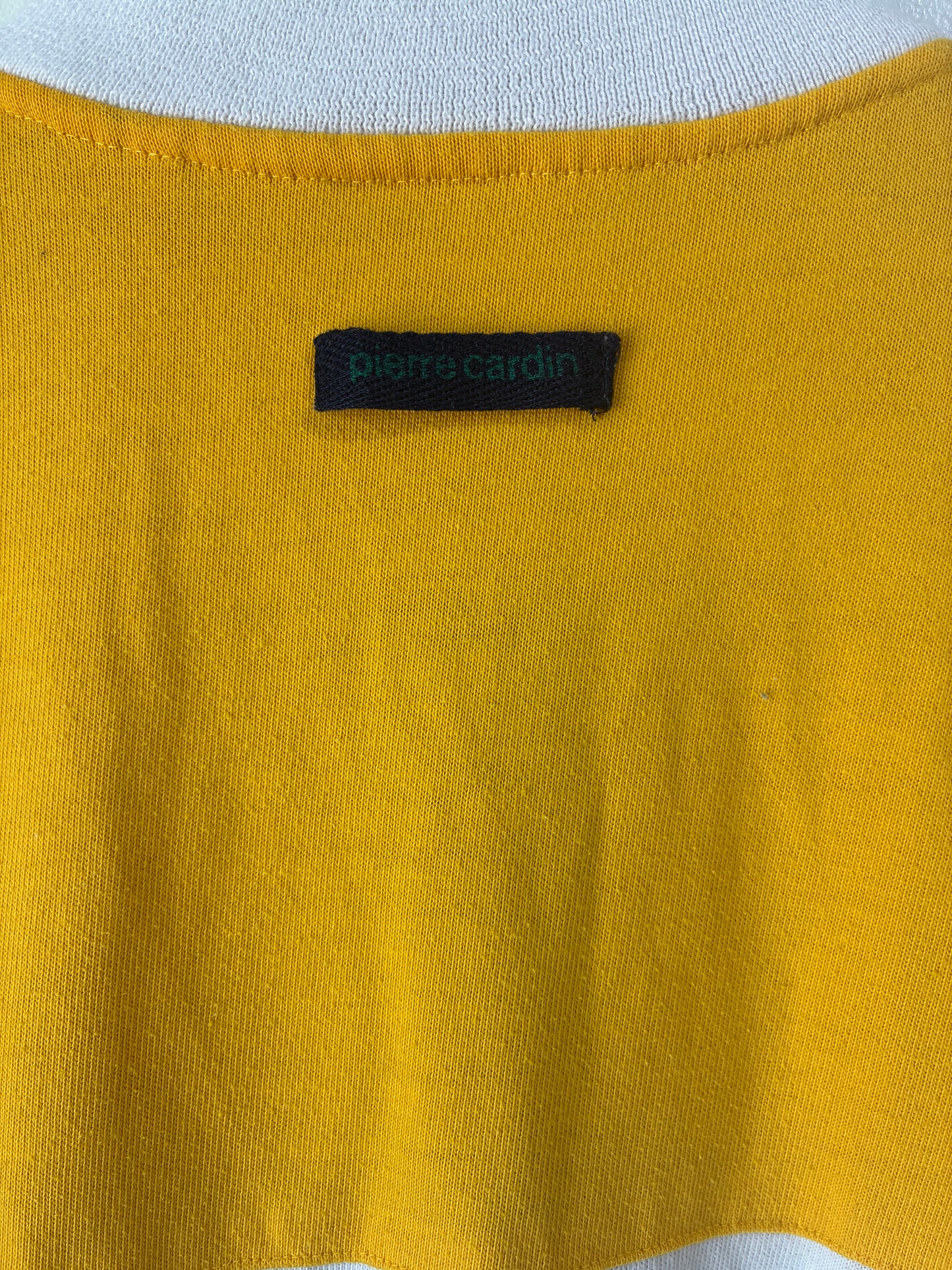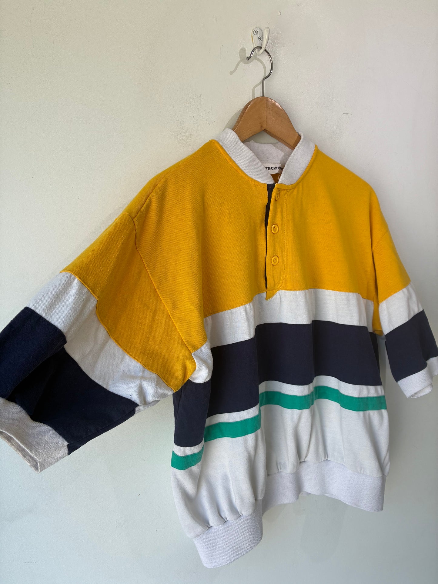 Pierre Cardin Yellow, Blue and White Short Sleeve Sweatshirt. A super fun throwback, this short sleeve henley neck sweatshirt from Pierre Cardin features bright and sunny color block stripes and a banded waist for that retro, slouchy fit. So good!!! Sweatshirt is in very good pre-loved condition and is free of stains, tears and defects.