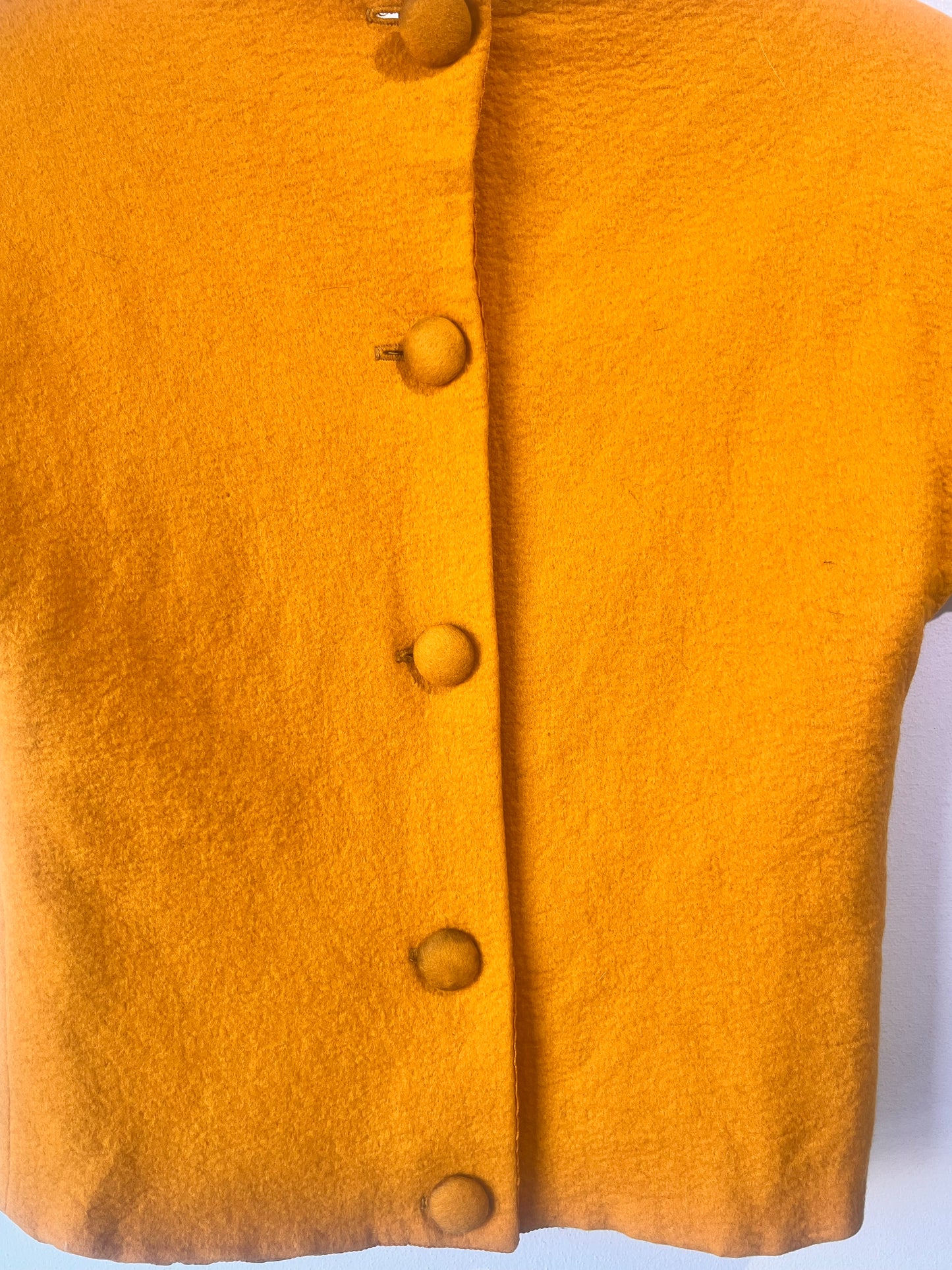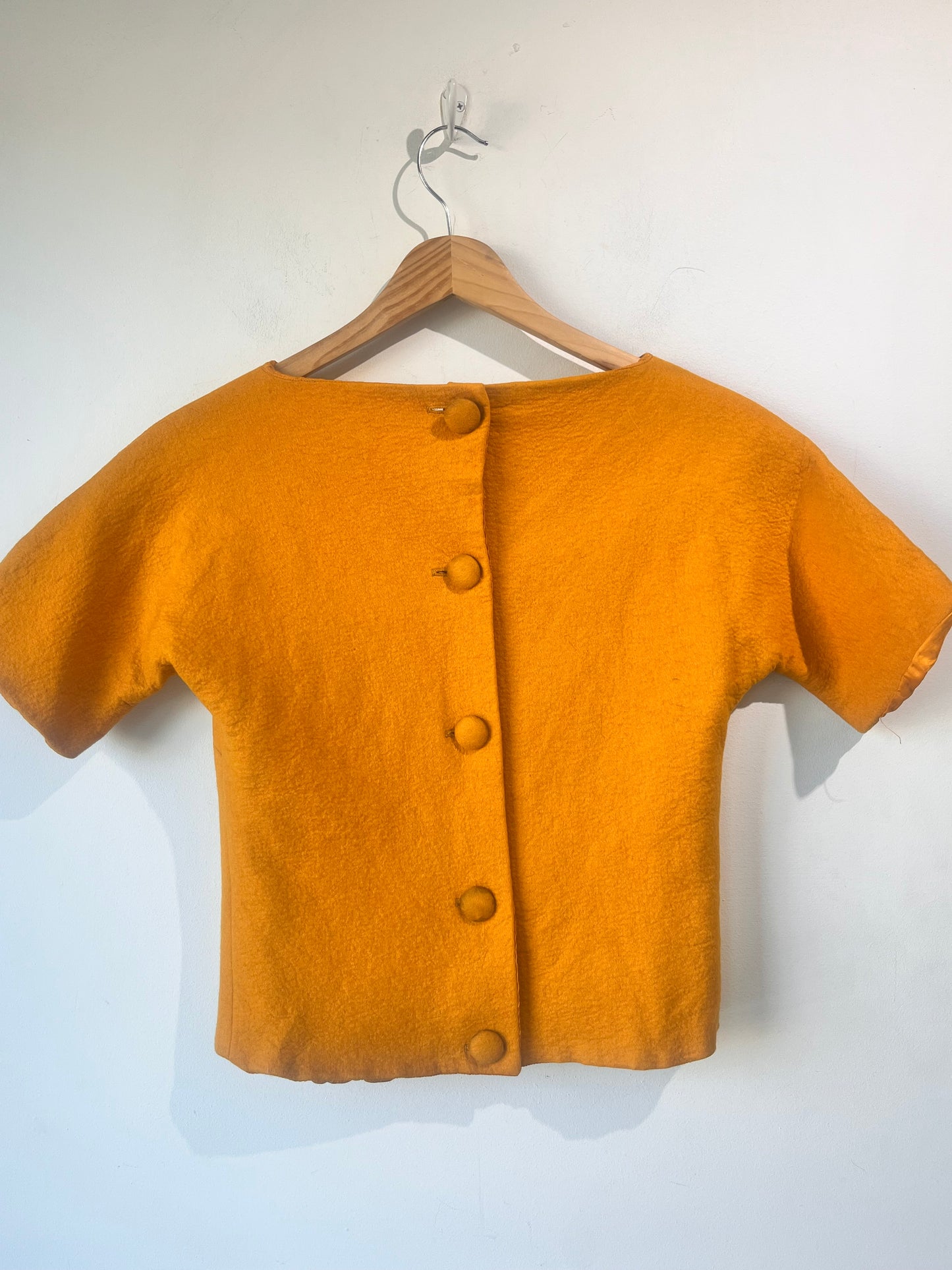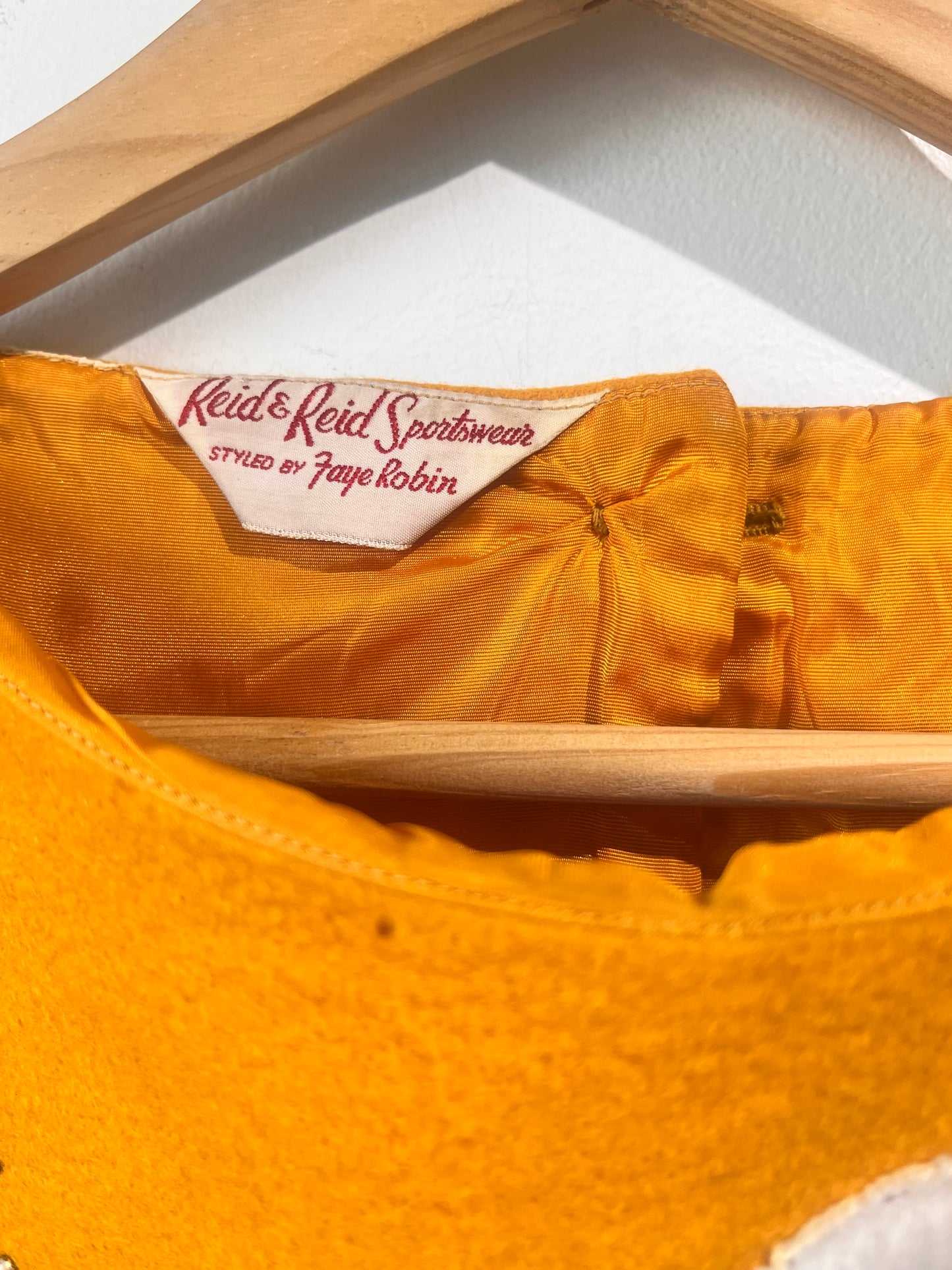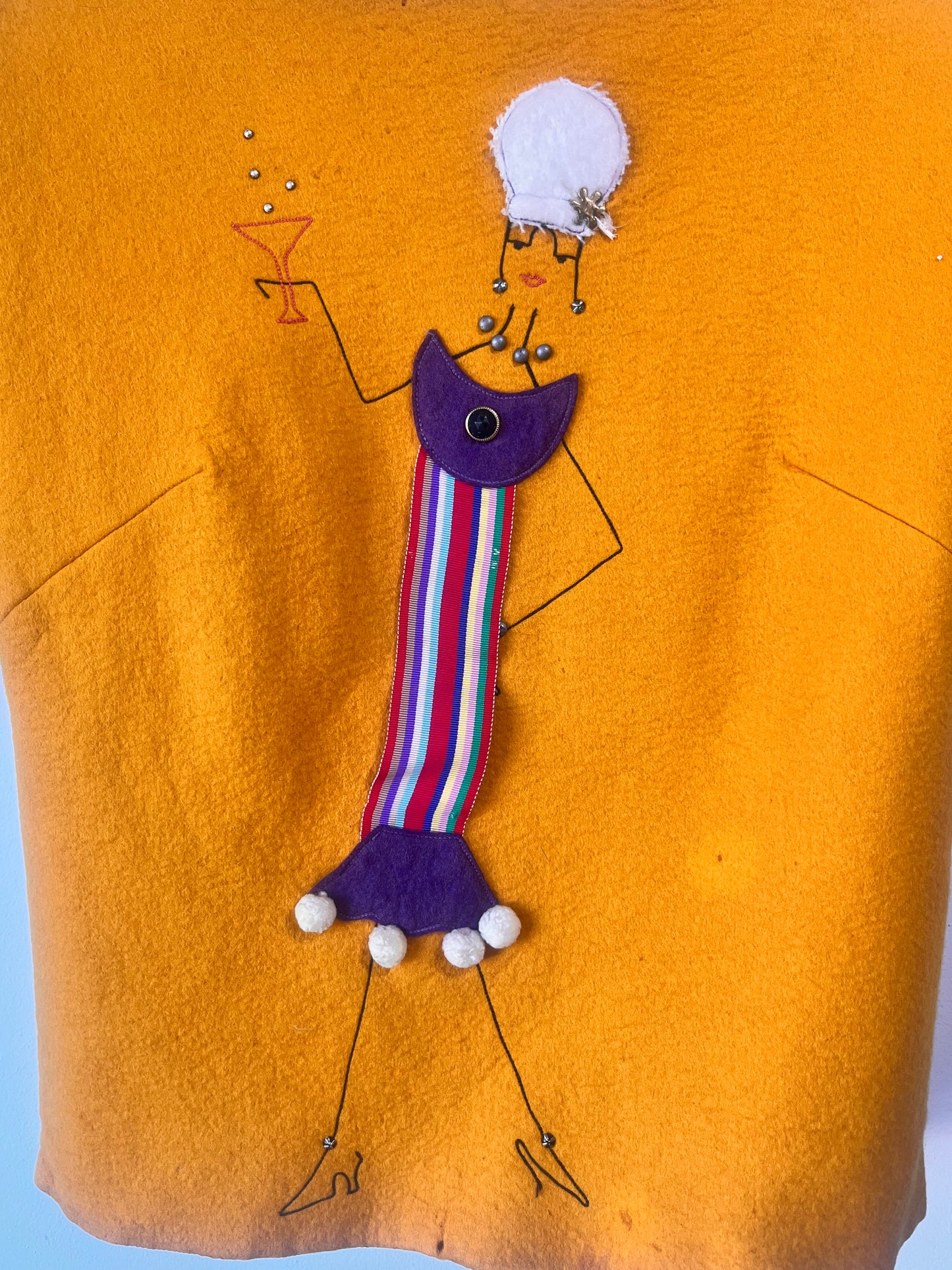 Reid & Reid Vintage Appliqué Champagne Shirt. Holy moly, this little lady is absolutely fabulous! Featuring an appliqué, embroidery and rainbow striped grosgrain ribbon lady enjoying a glass of bubbles to the fullest marigold yellow wool flannel. A boat neckline, short sleeve and button back finishes this darling top! Fully lined in tonal acetate. Sold As-Is, she shows some signs of her age and has a few small moth holes above the front hem and buttons have some discoloration (see photos). That said, this piece is a real prize!
