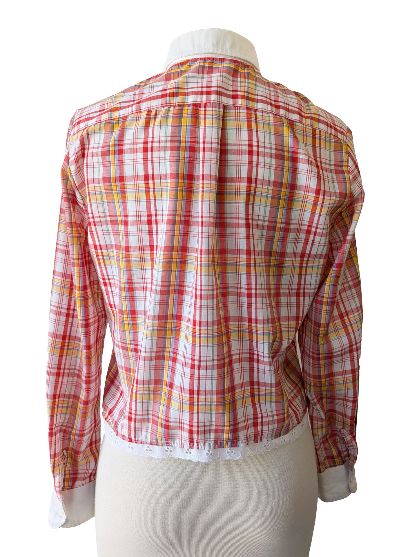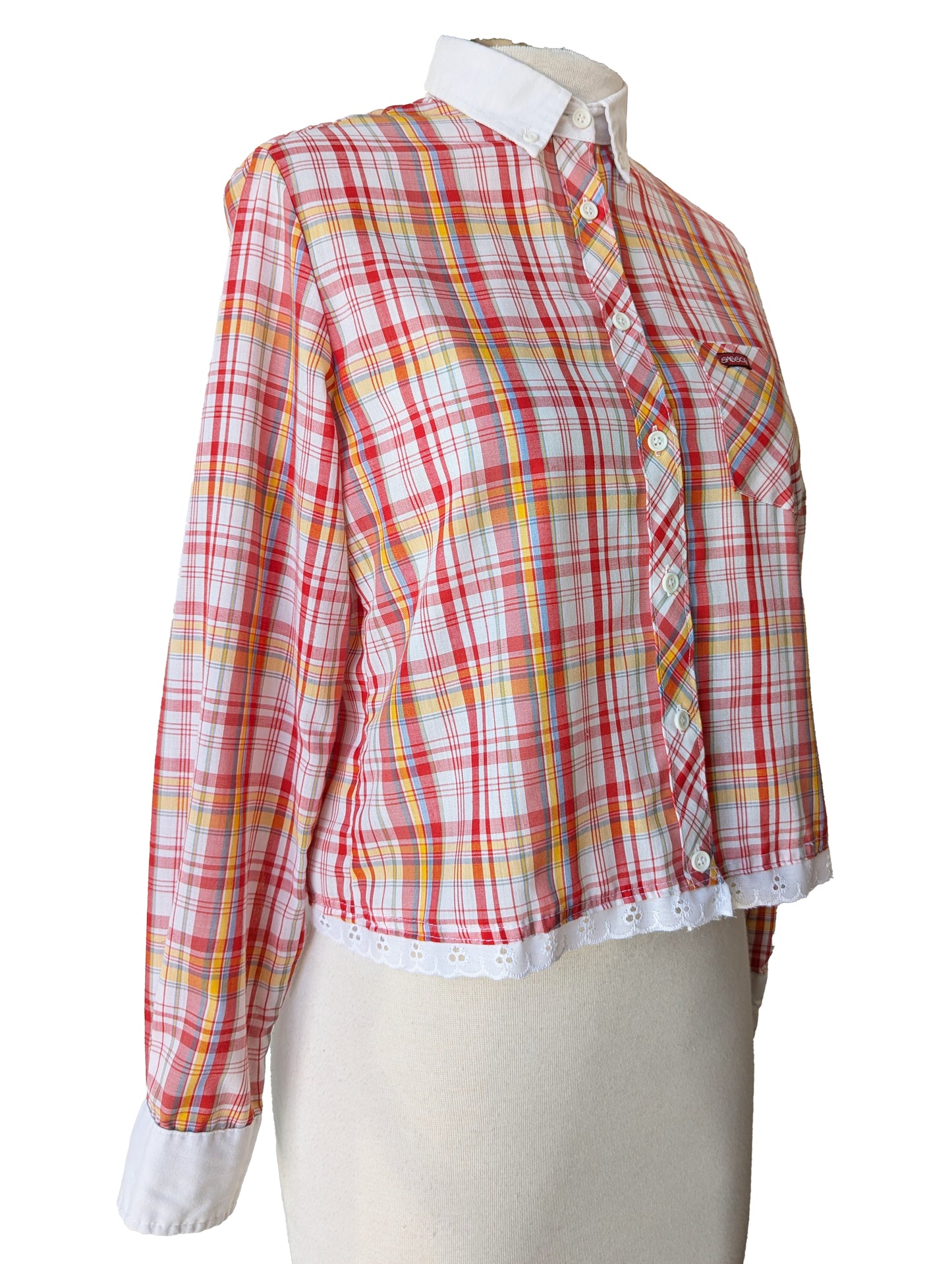 Bright Sasson plaid brings the cheer, while relaxed tailoring keeps this button-down laid-back. Cropped short and finished with a lace hem, it turns casual into something a little more playful. A crisp white collar and cuffs nod to classic shirting, while the vibrant colors and unexpected finish make it clear this one’s not sticking to the rules. Shirt is in excellent condition and is free of notable flaws.