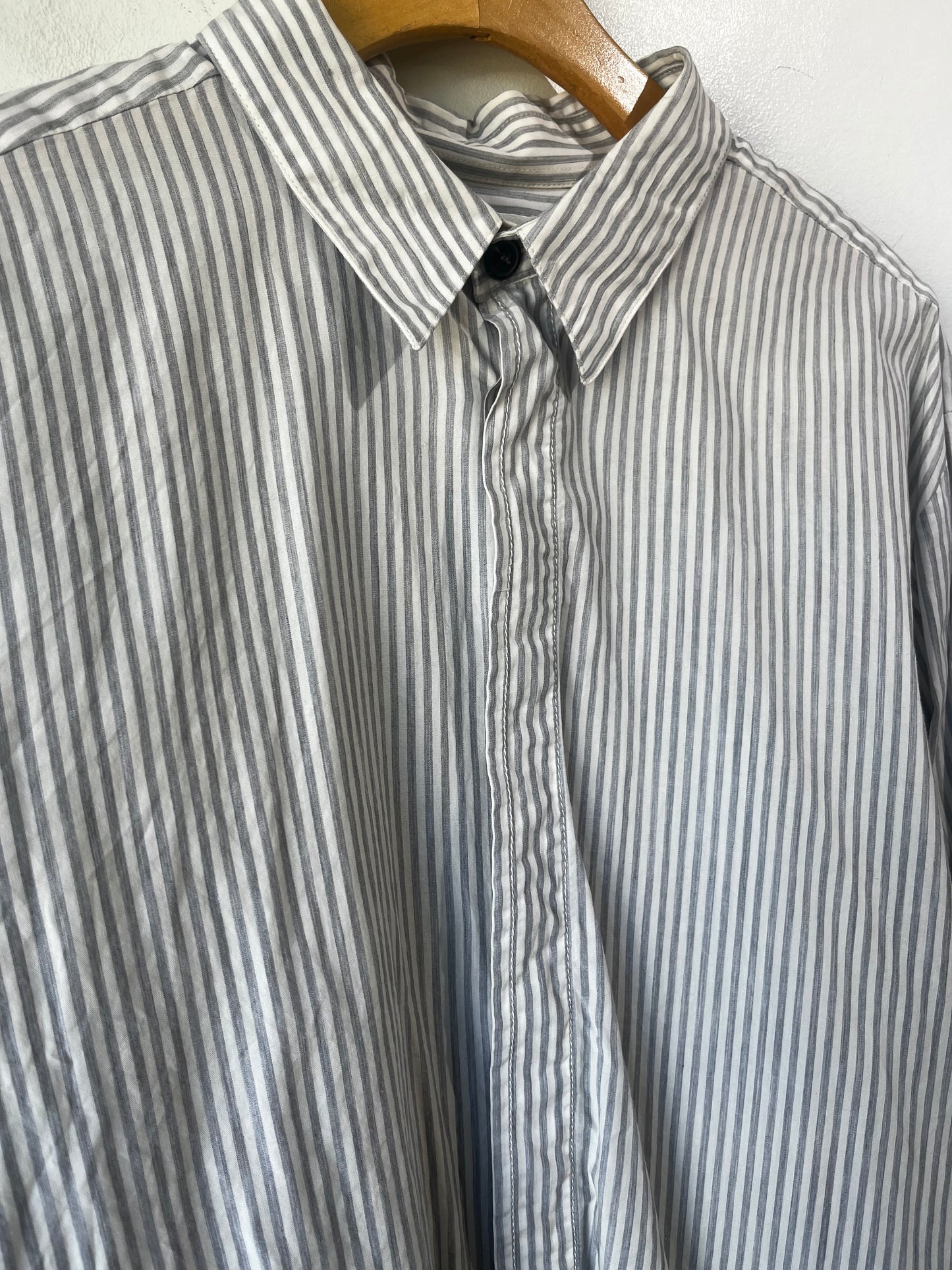 Stephen Schneider Grey and White Stripe Men's Shirt. Look and feel your best in this very handsome cotton button-front shirt featuring alternating grey and white bar pinstripes and a hidden placket. Shirt is in excellent condition and is free of stains, tears and defects.