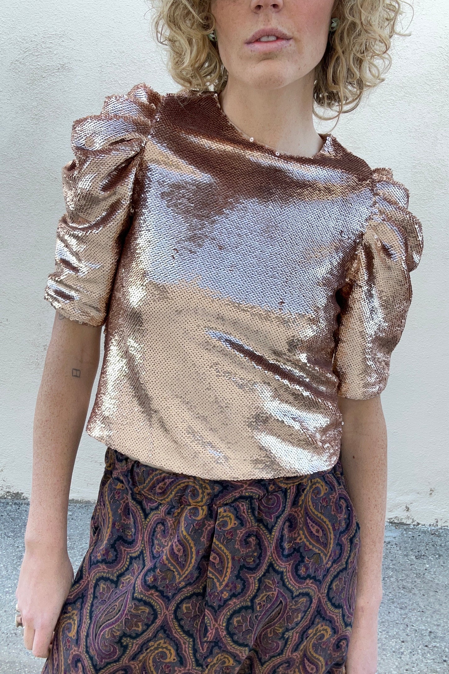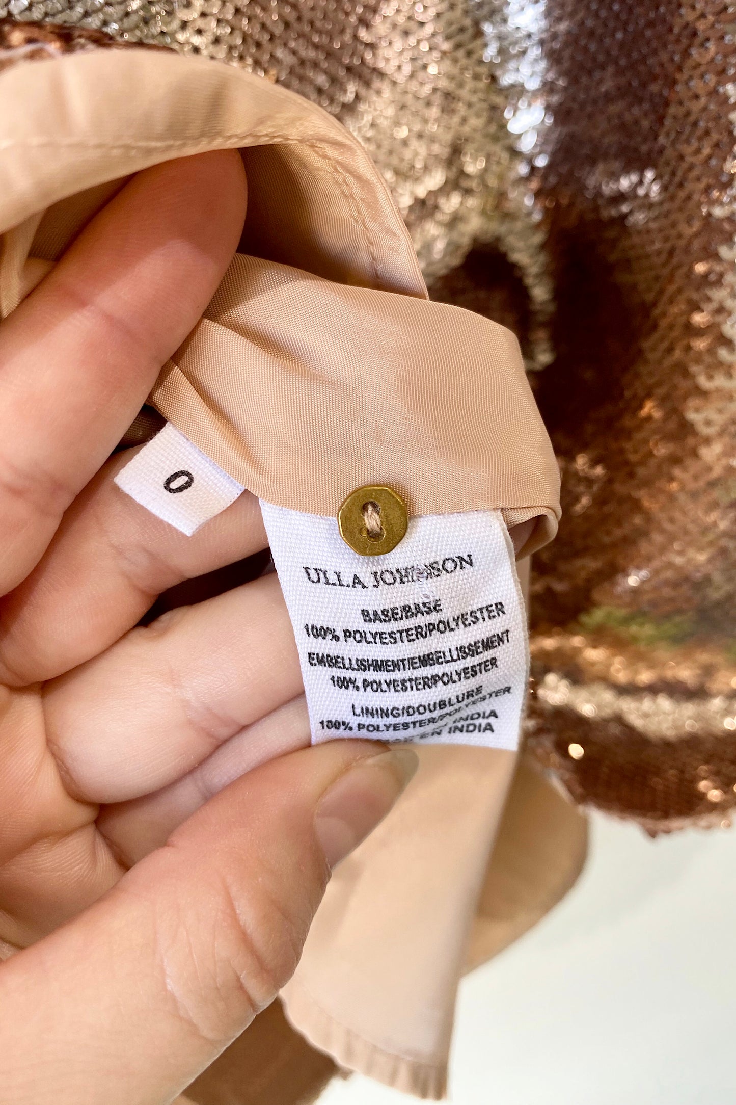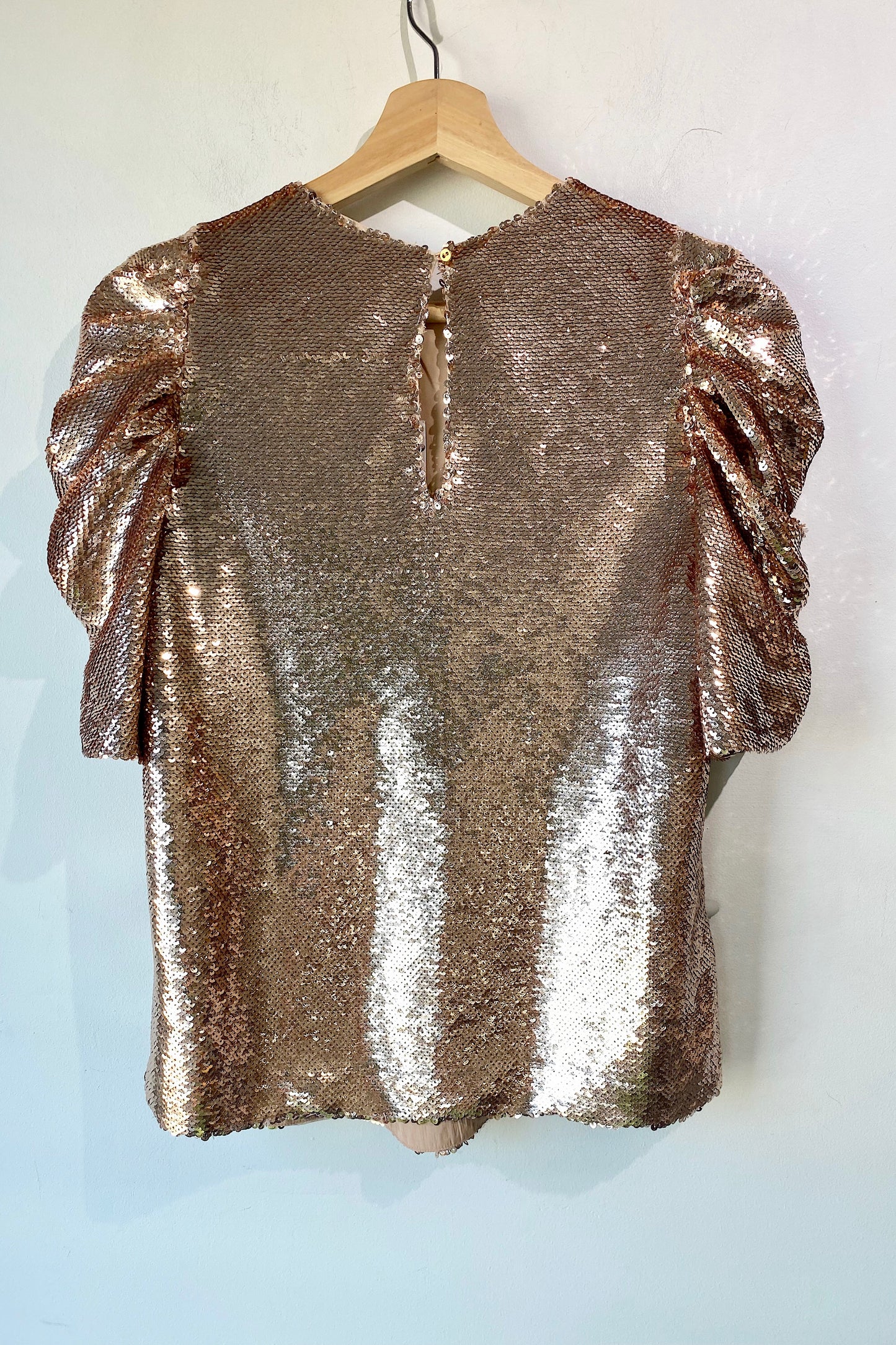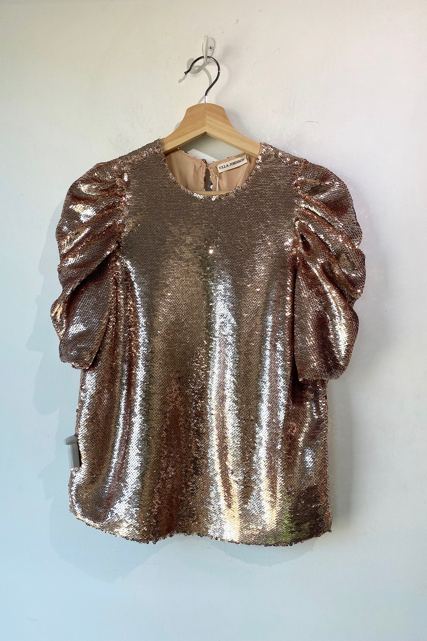 Ulla Johnson Blush Sequin Blouse. New with tags. Blush shiny sequin top with shirted puff sleeves and back keyhole with button closure. 100% polyester, dry clean only. Marked as size 0. Handmade in India.