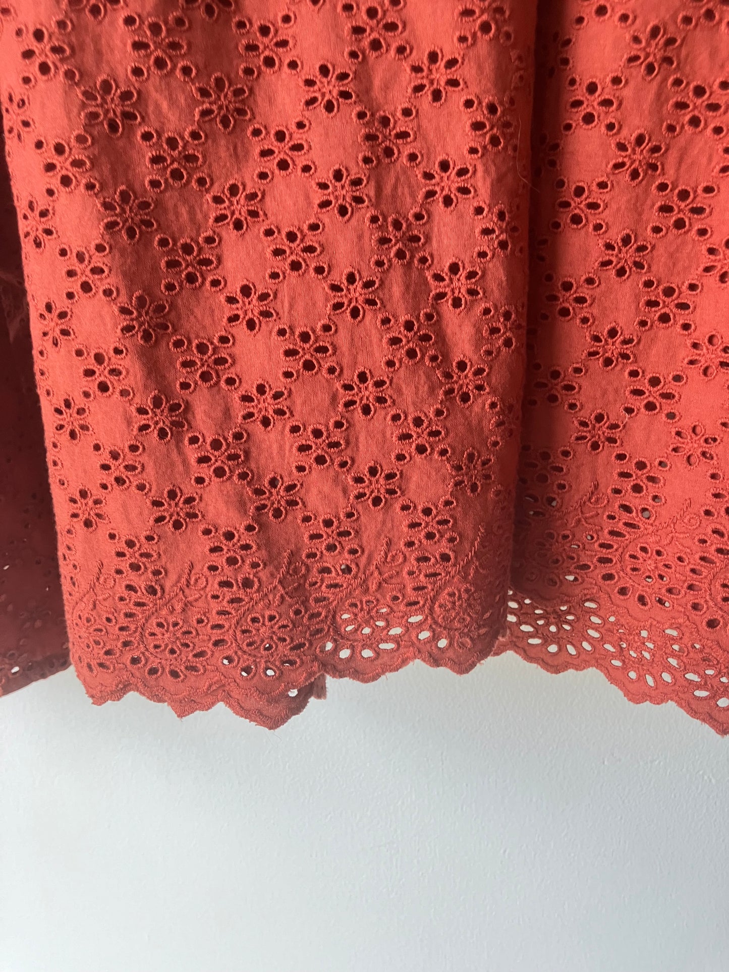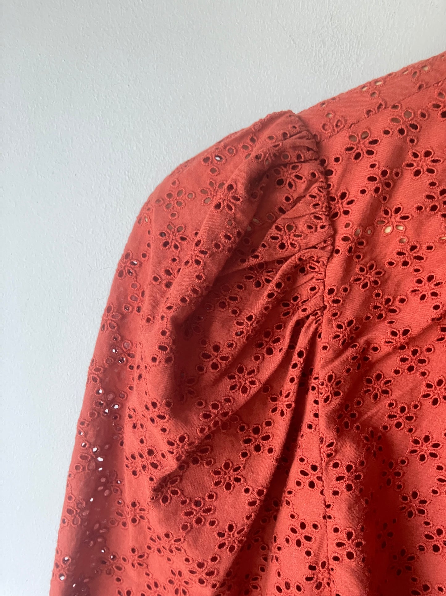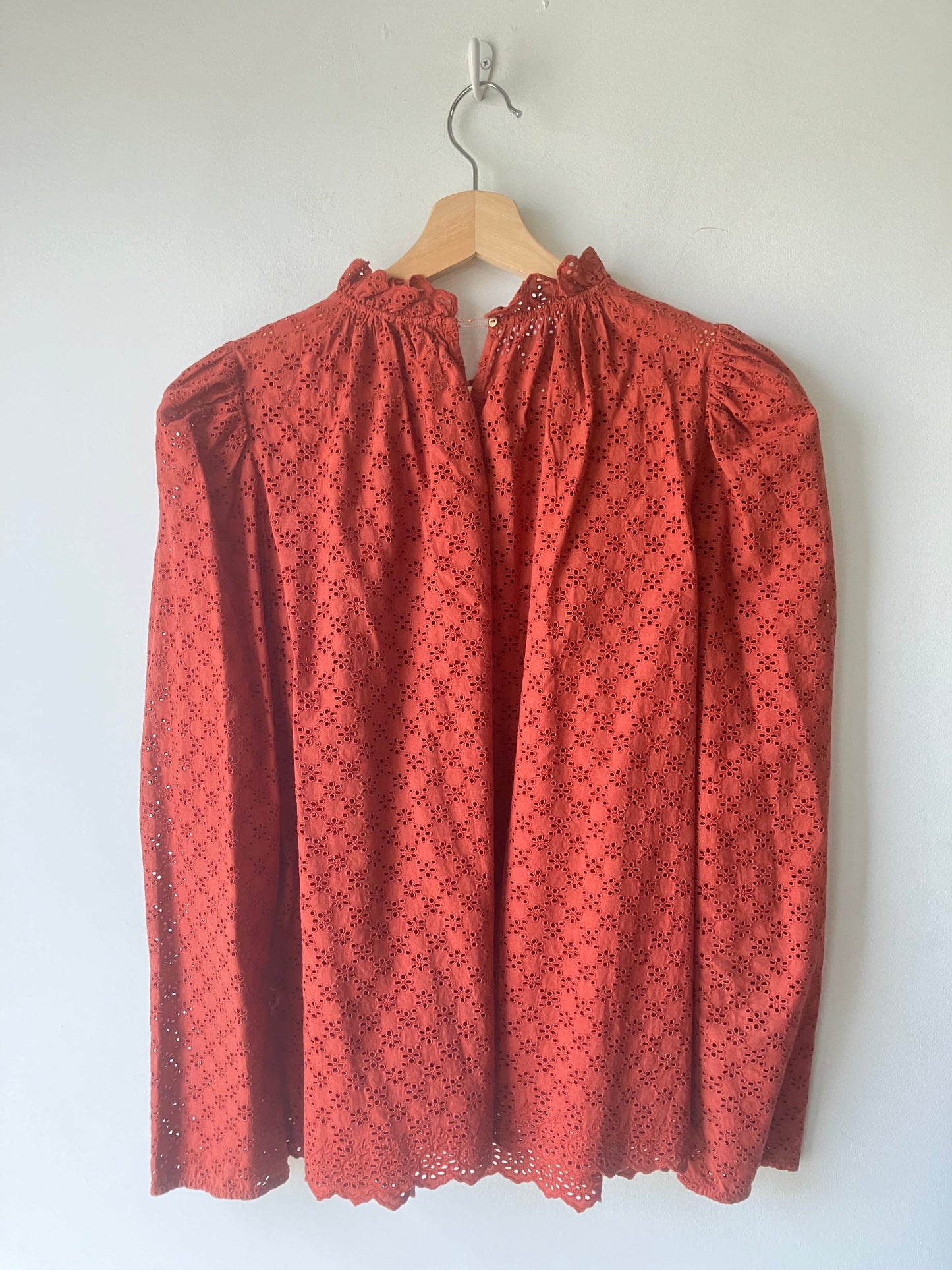 Ulla Johnson Rust Eyelet Top. Marked size 8. Adorable puff sleeves, ruffle collar and eyelet cut floral pattern. Long sleeves cuteness. 100% cotton. Machine wash cold with like colors. Displaying some wear at the back closure, great overall condition. Fits M best.