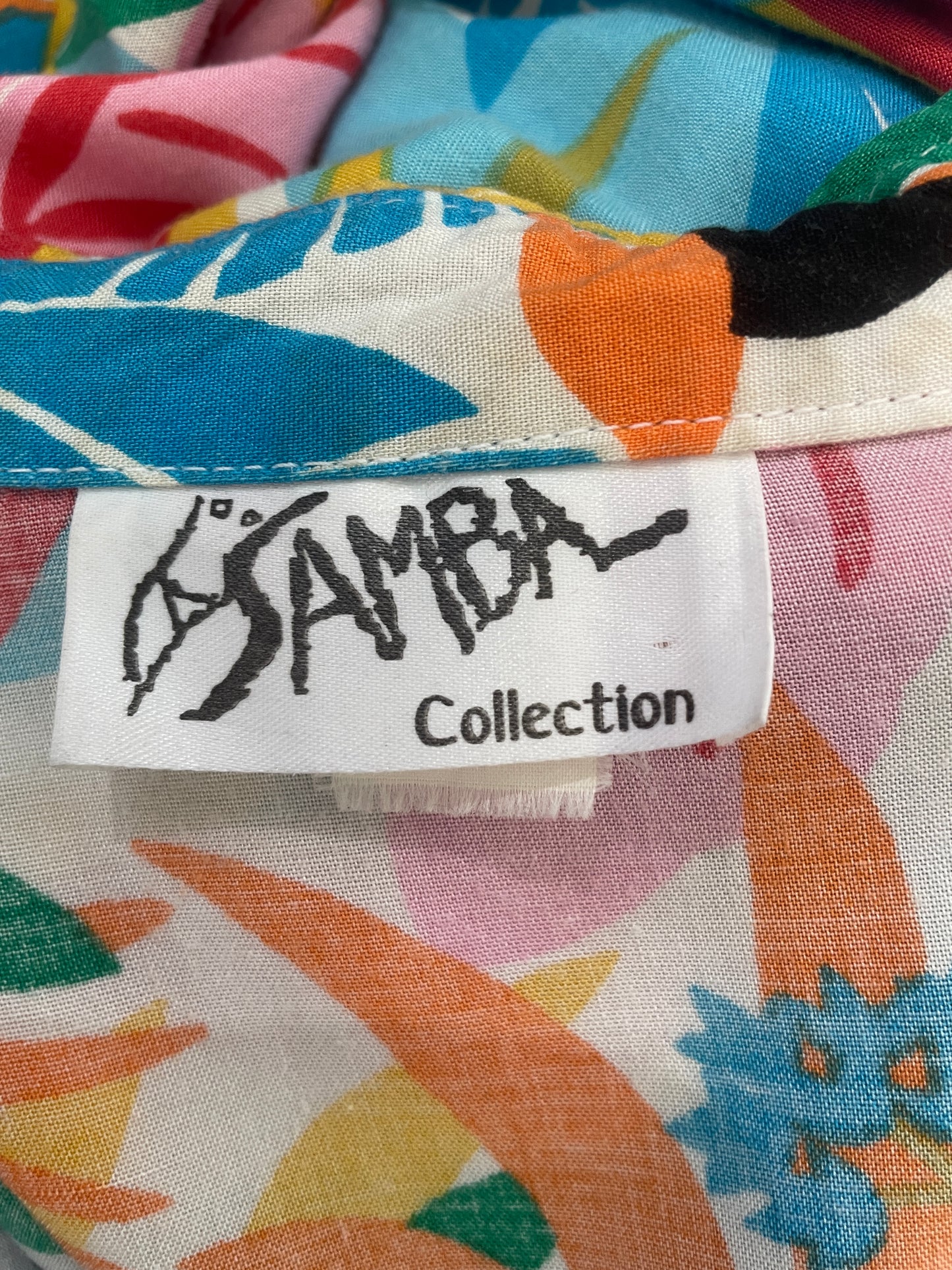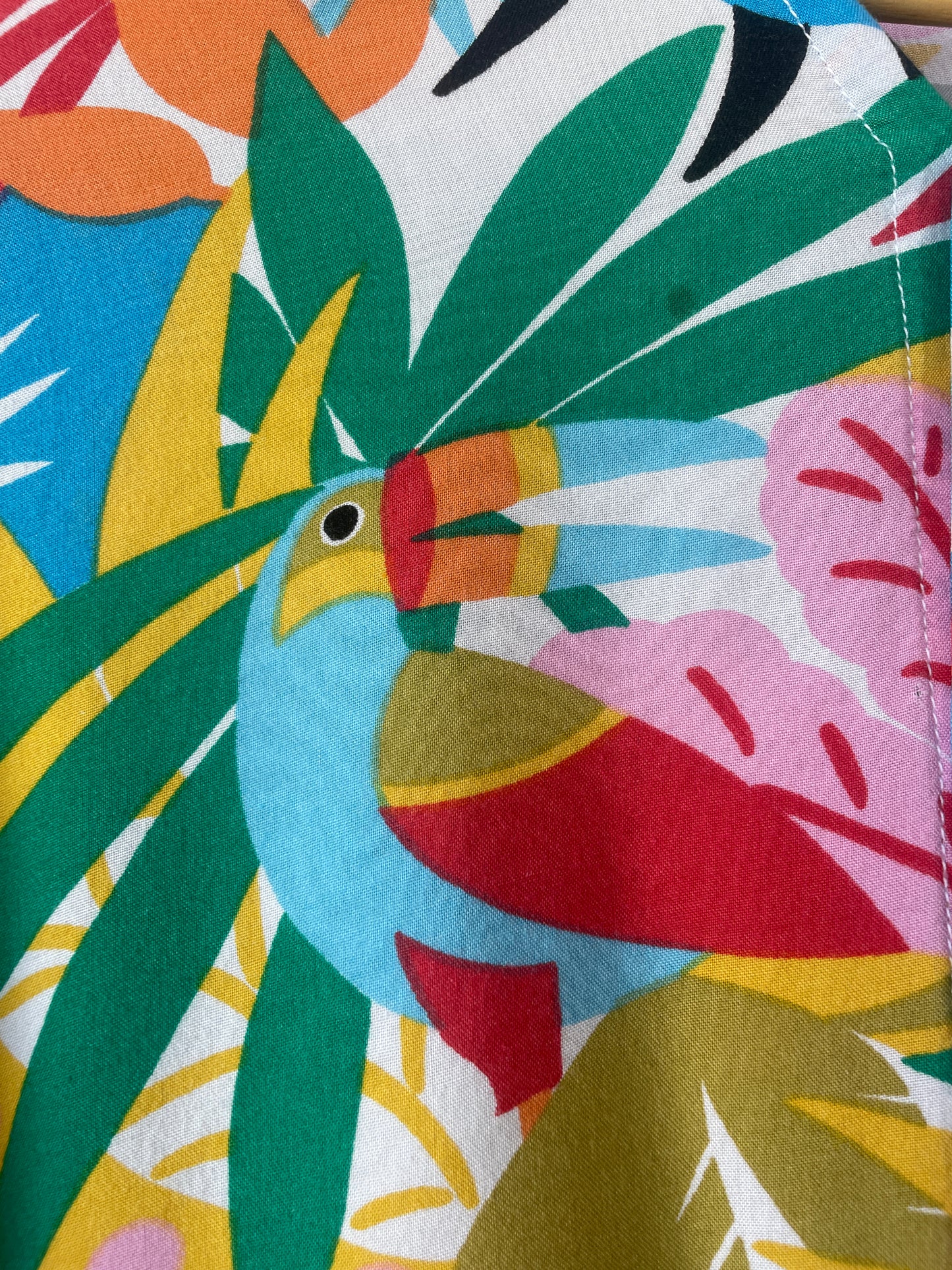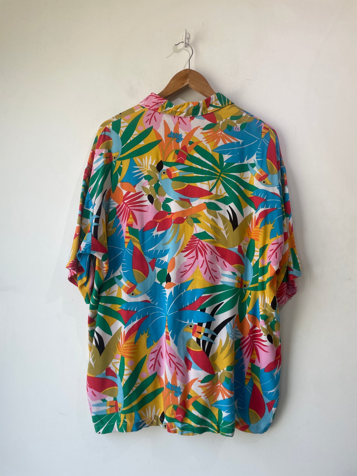Vintage 80's Samba Toucans Print Shirt. Wonderfully loud and tropical! This fun and funky shirt is sure to make a statement with its bright toucan allover print. Summer vibes in shirt form! In good vintage condition, one small hole on front near button. Unmarked materials, likely rayon or rayon blend. Unmarked size, would best fit L size, please refer to measurements.