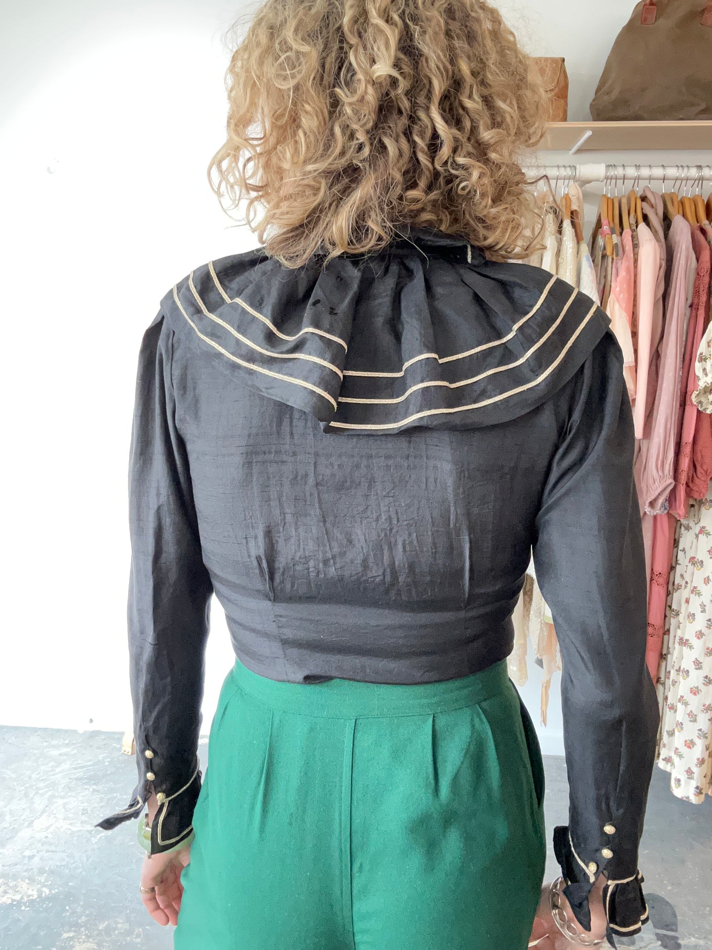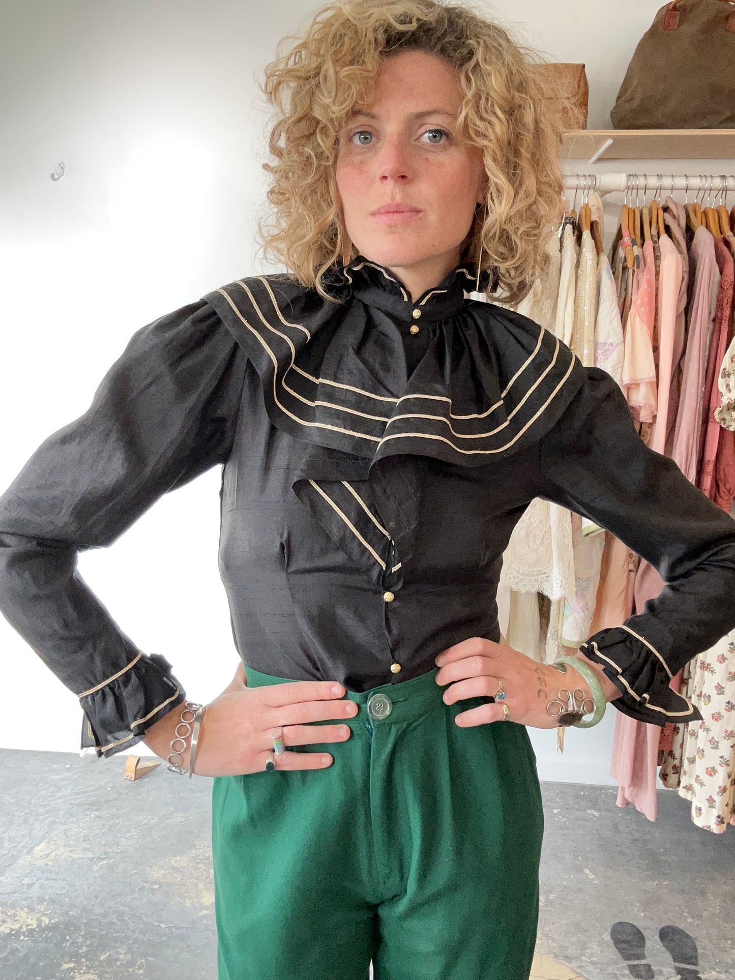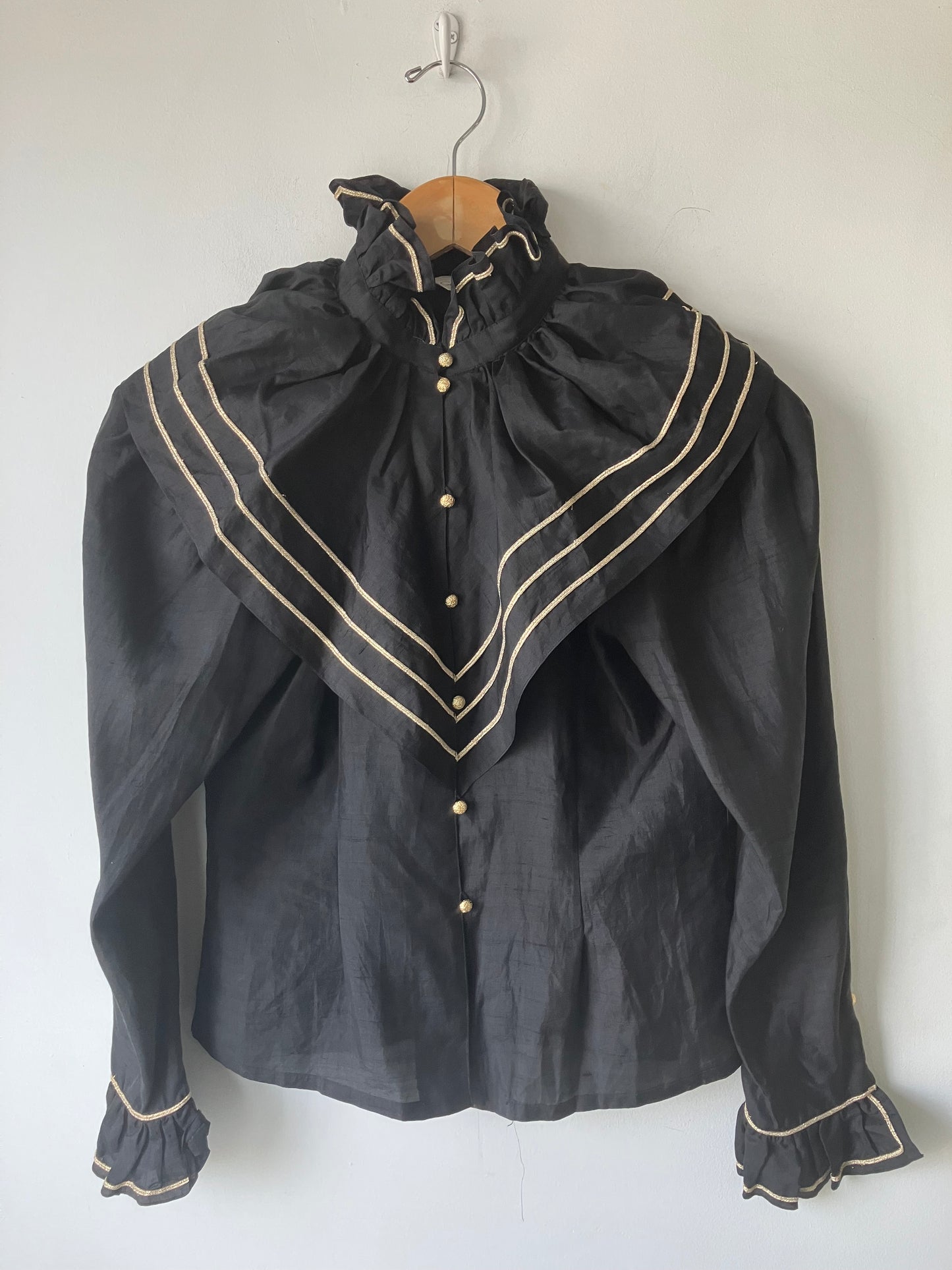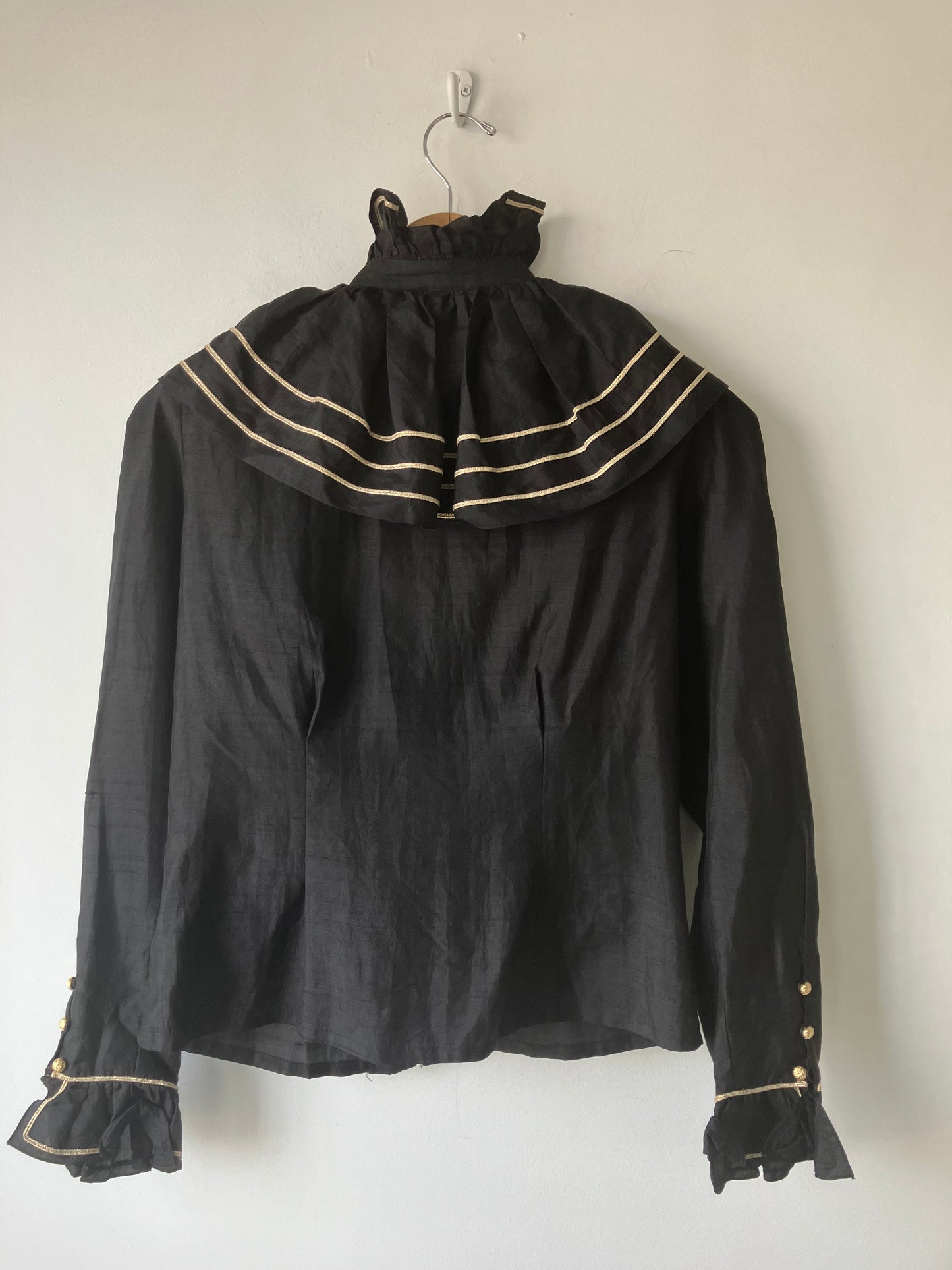 Vintage Genet Amant Black Ruffle Silk Blouse with Gold Piping