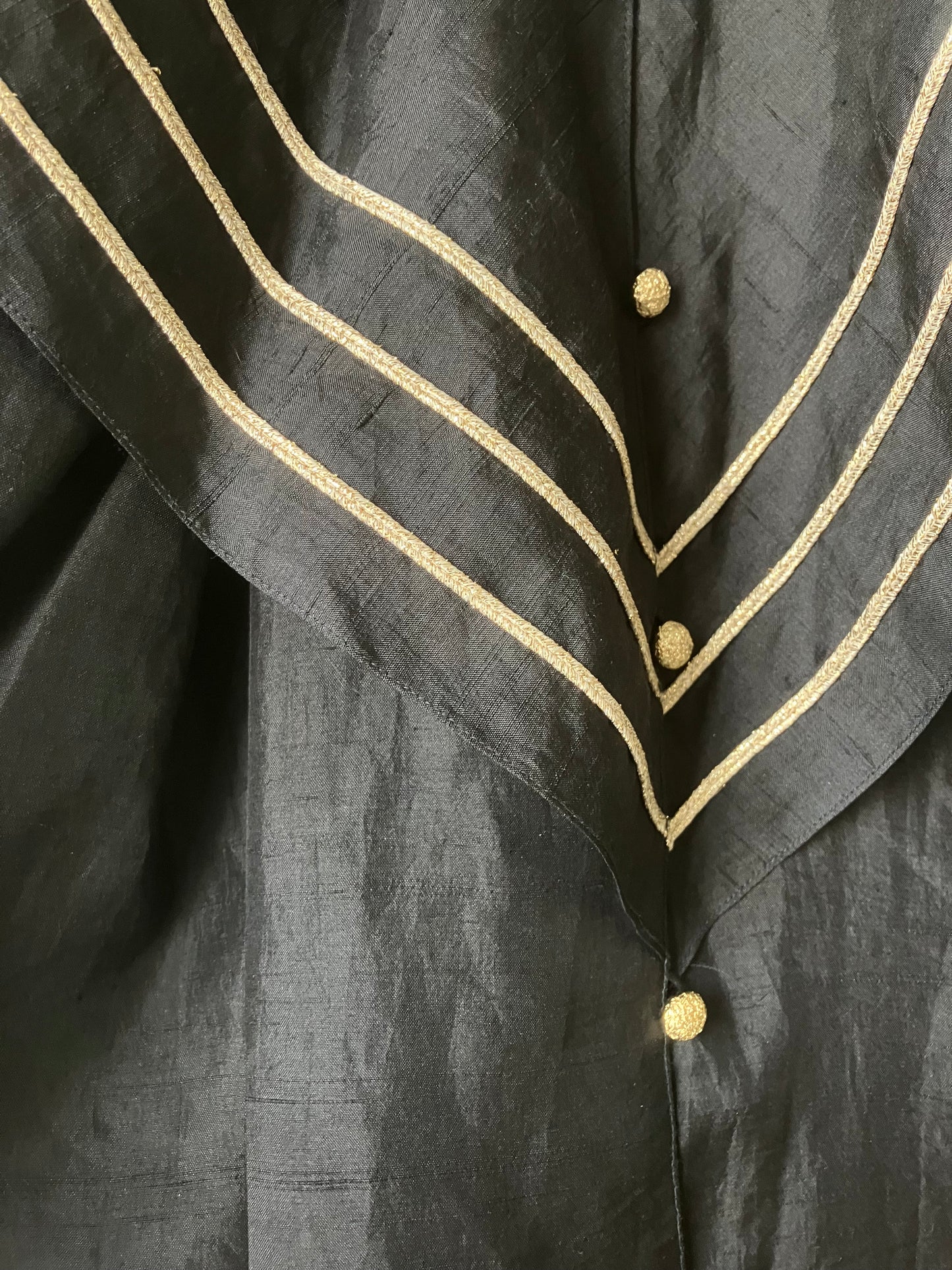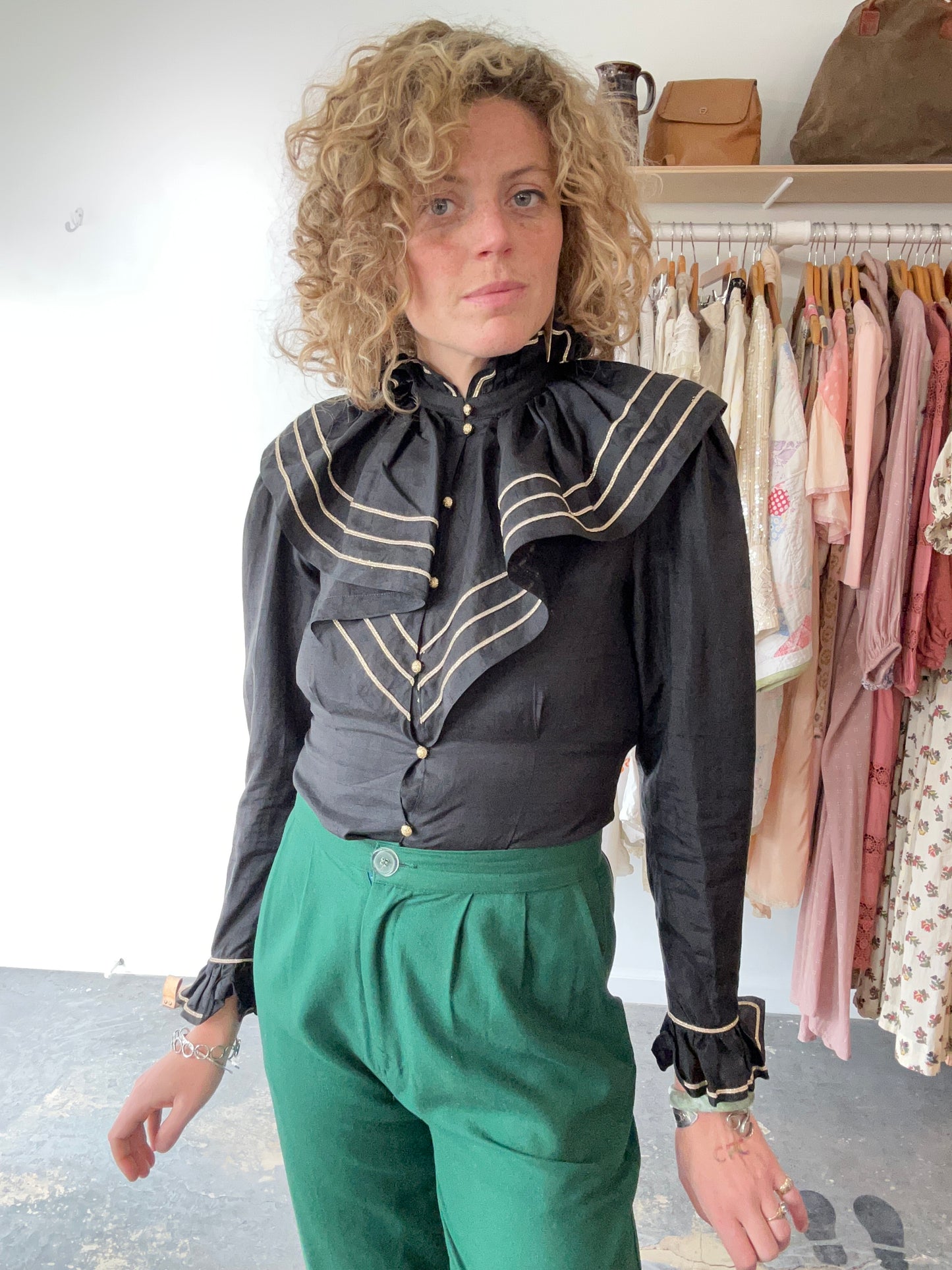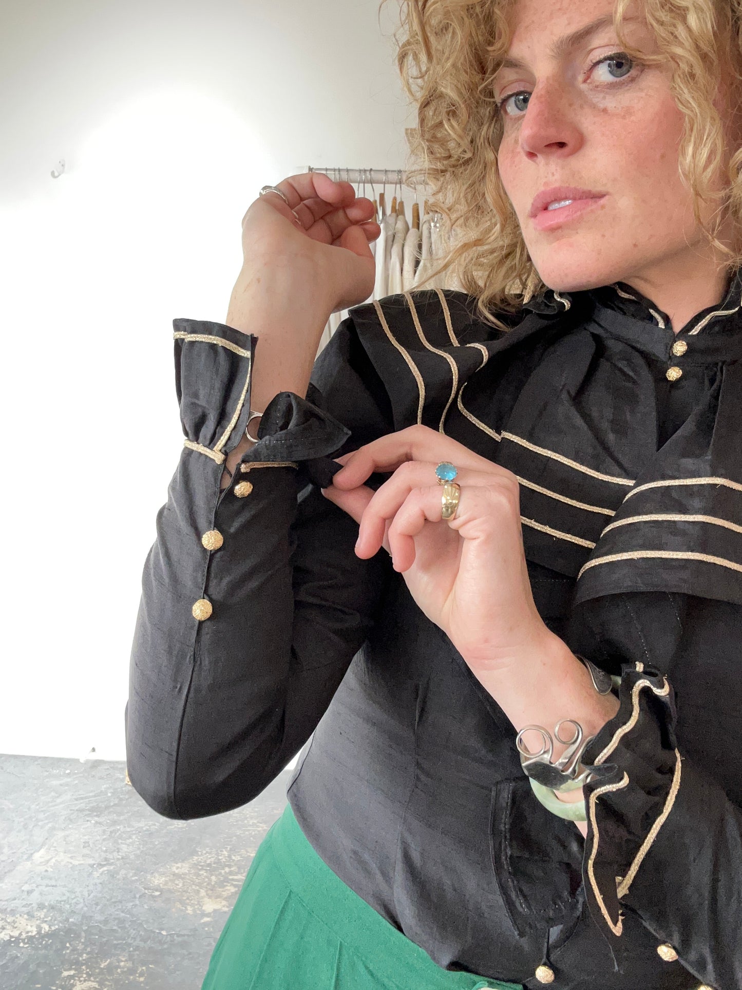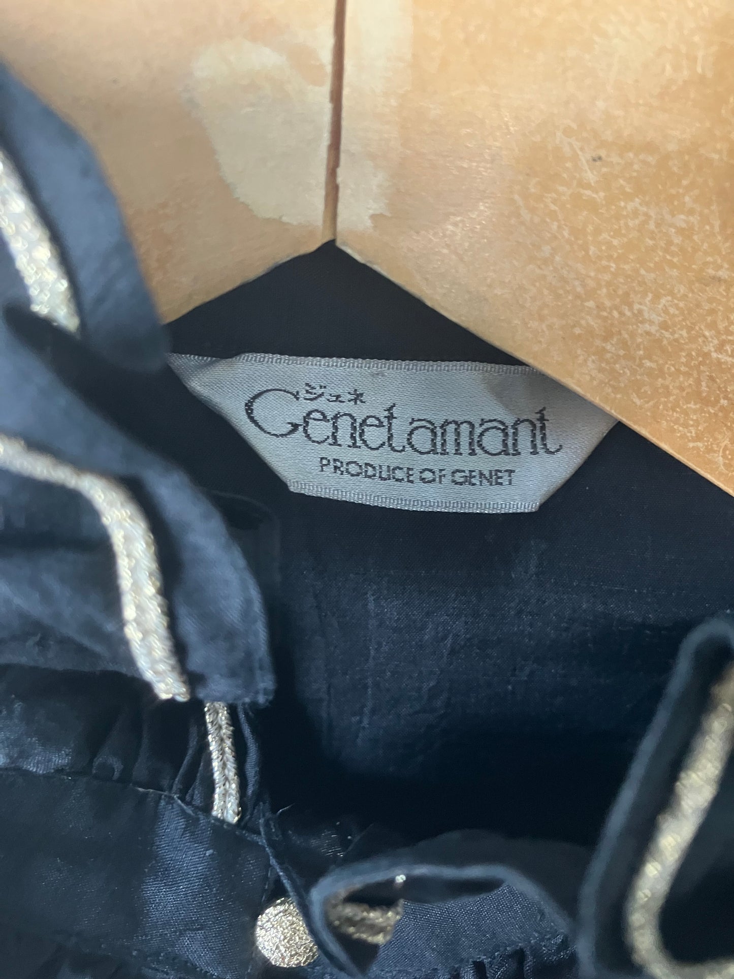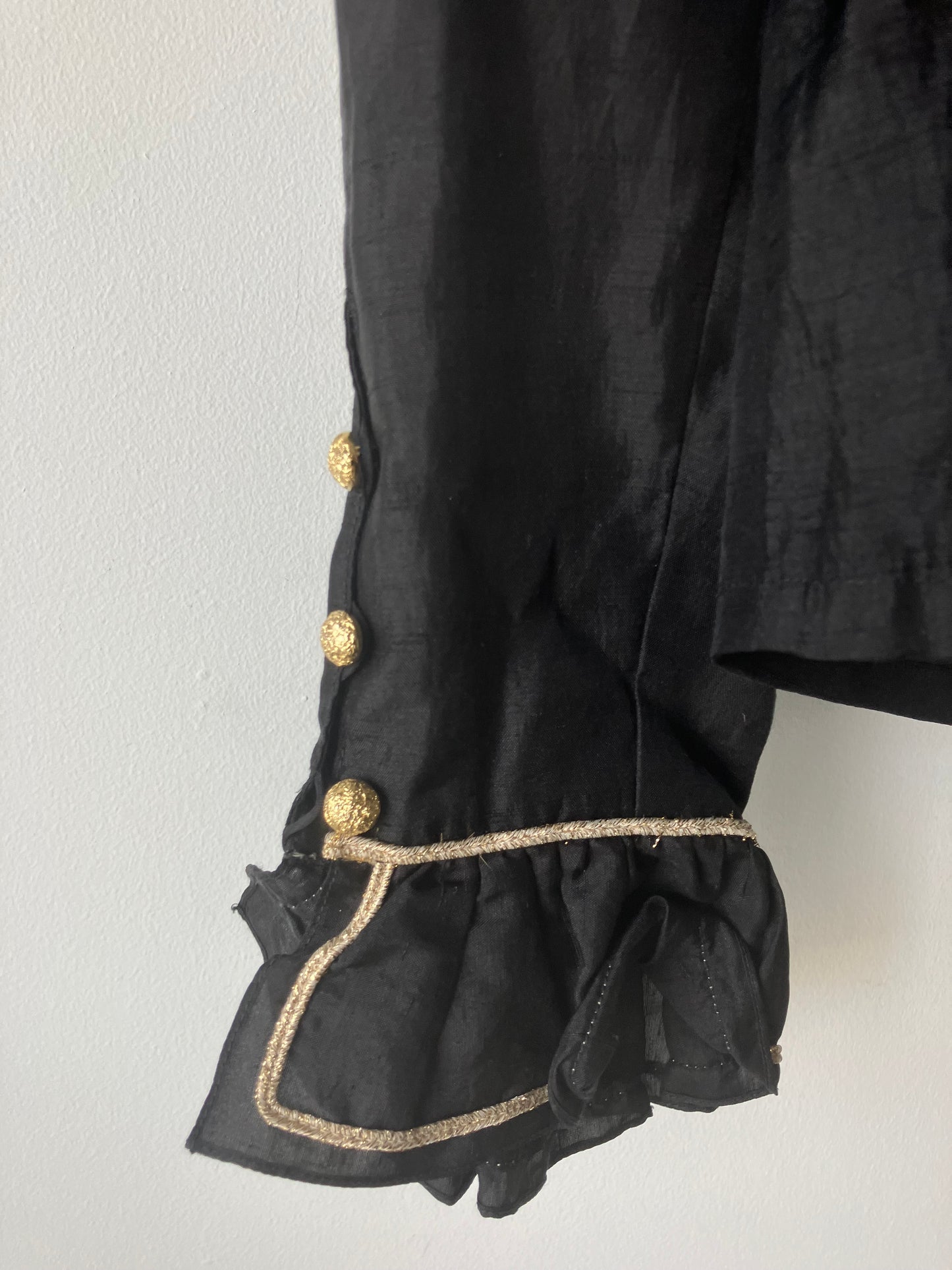Vintage Genet Amant Black Ruffle Silk Blouse with Gold Piping