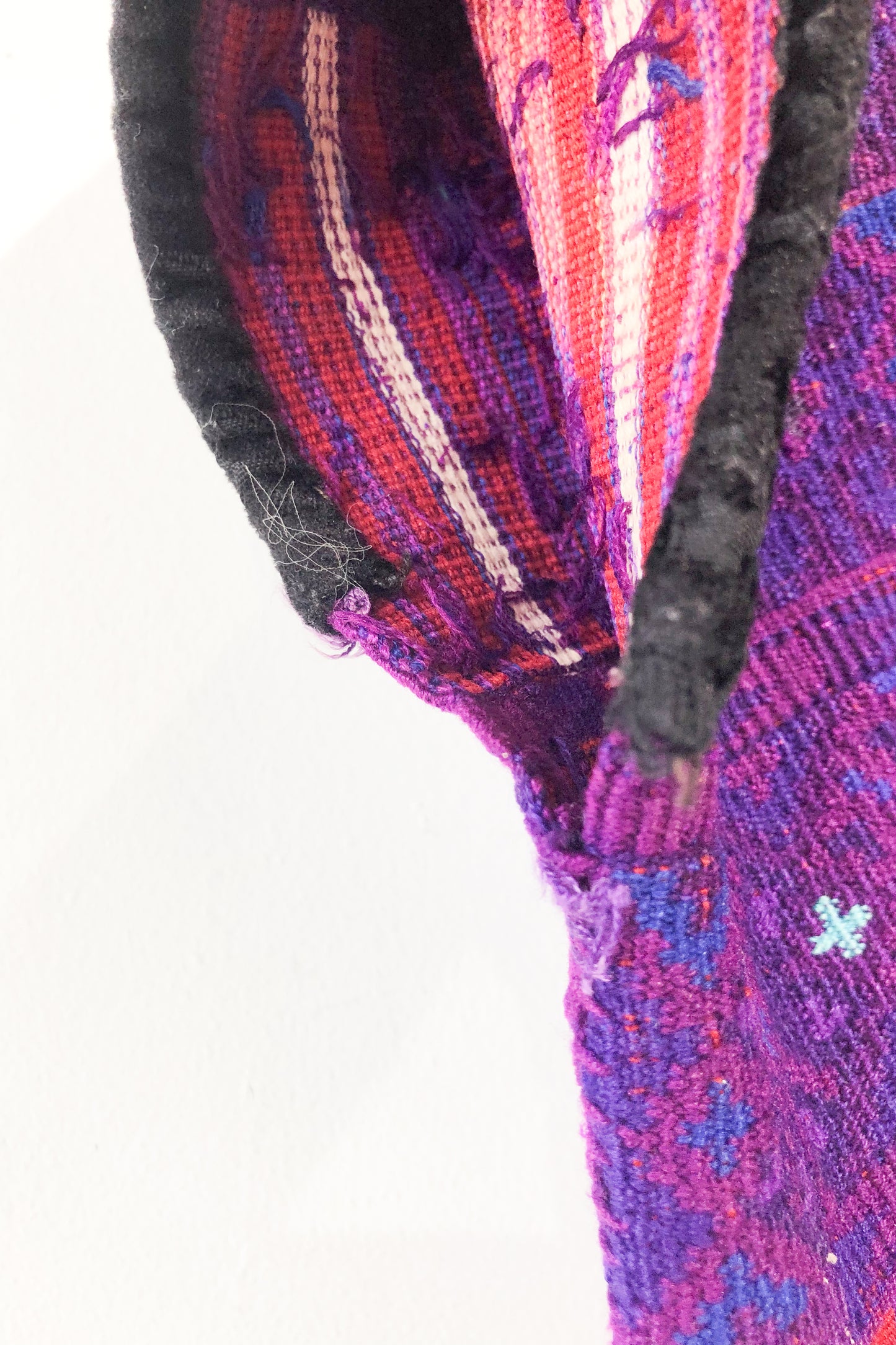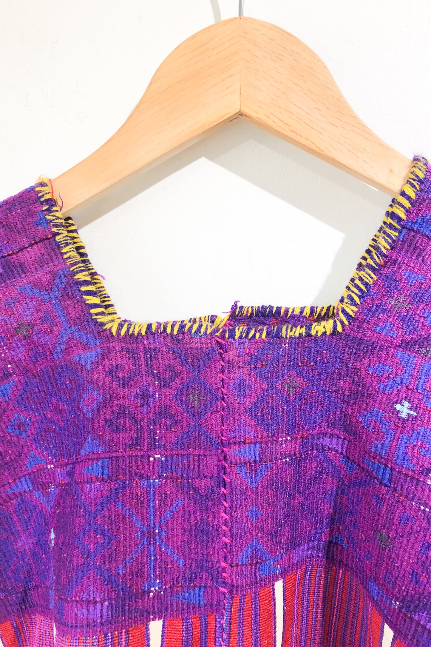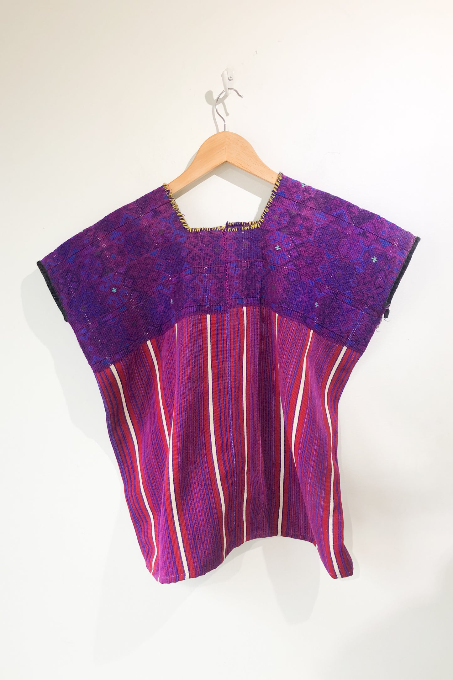 Vintage Red and Purple Huipil Striped Top. Purple yoke square neck top with red stripe bottom and contrast yellow stitching at the neckline. Black velvet trim at sleeve openings. Has some distressing along seams and at one armhole, see photos. No marked content, feels like a cotton blend woven. No marked size, fits XS/S *with notably small armhole.