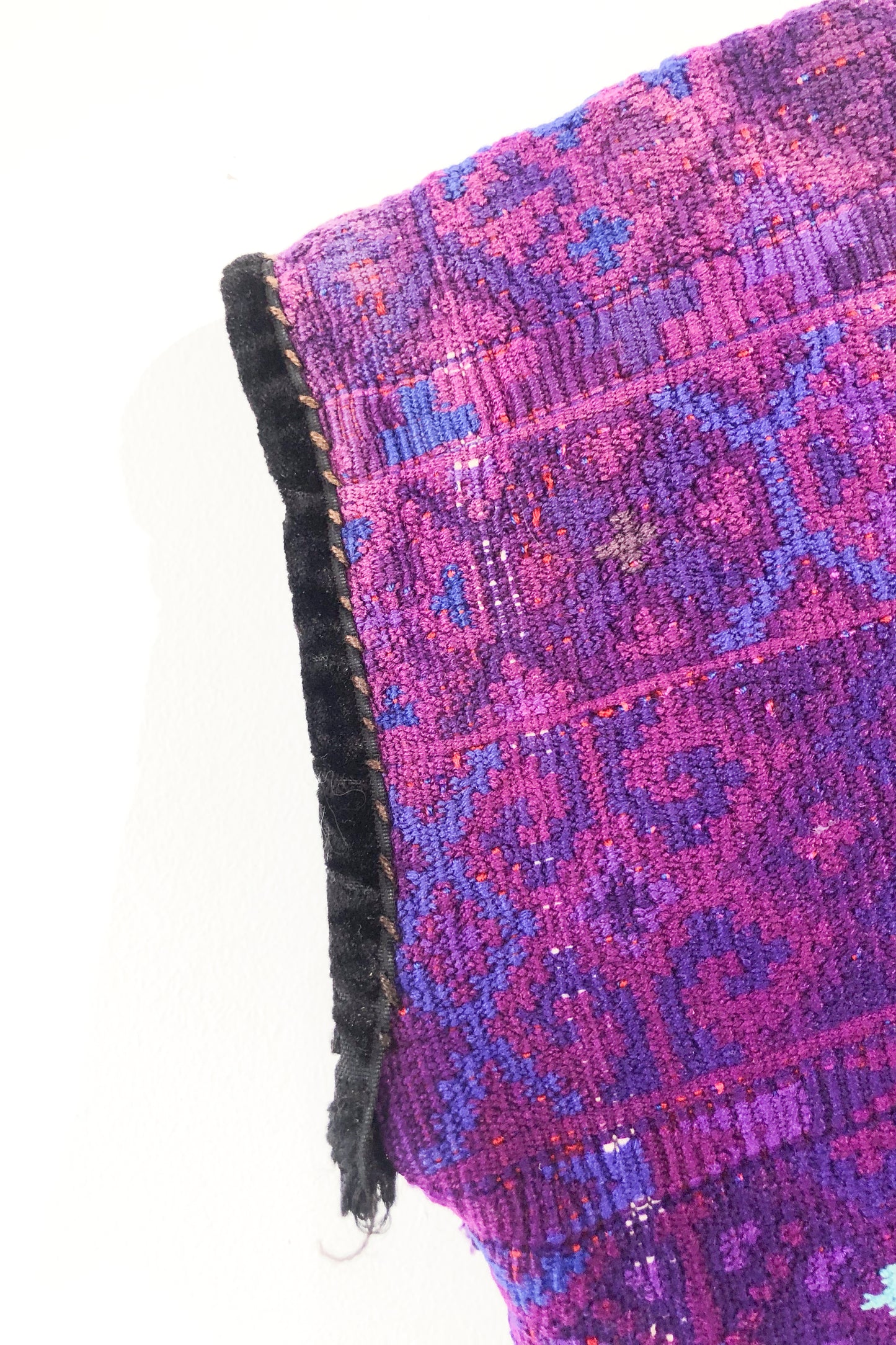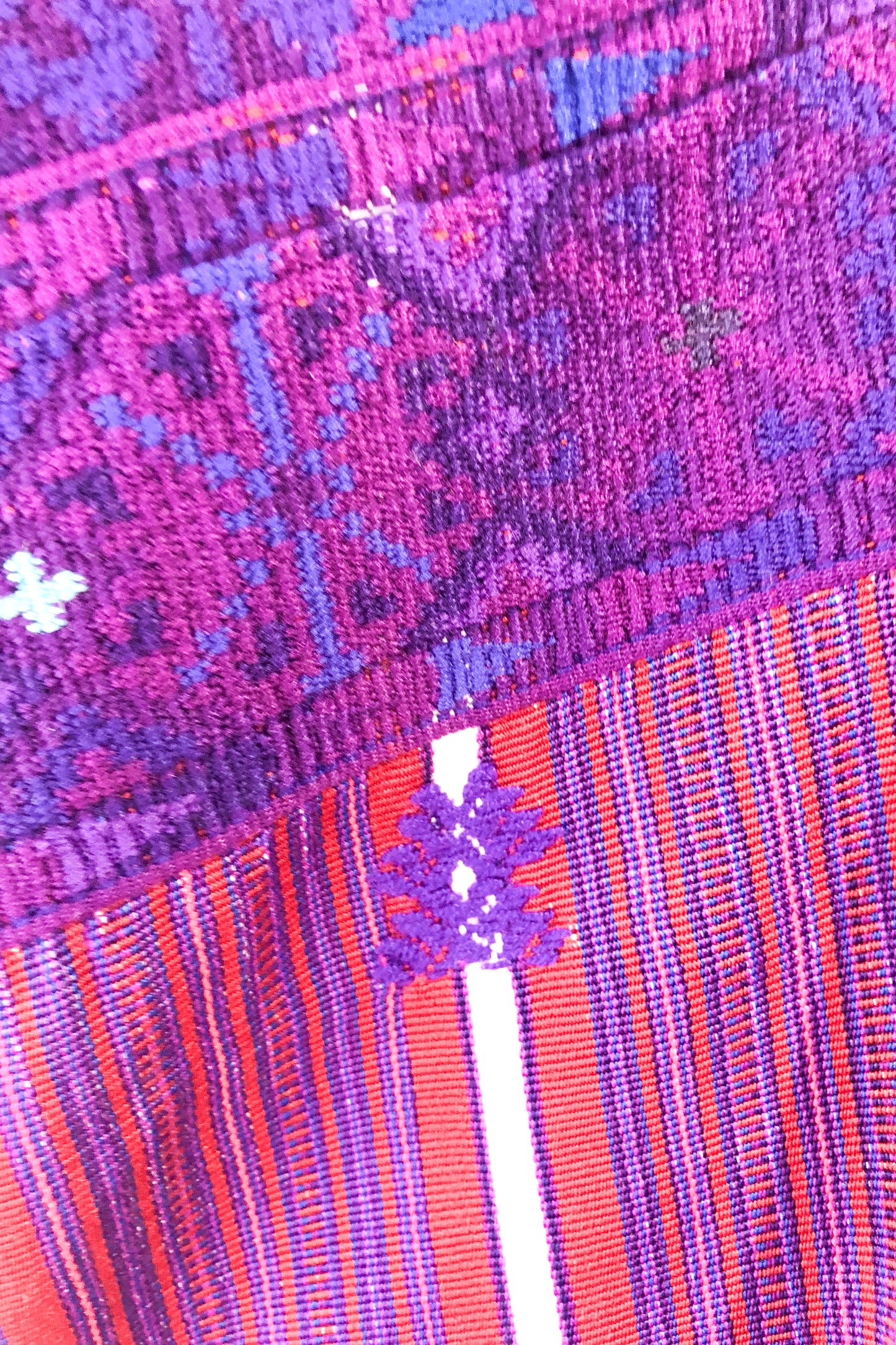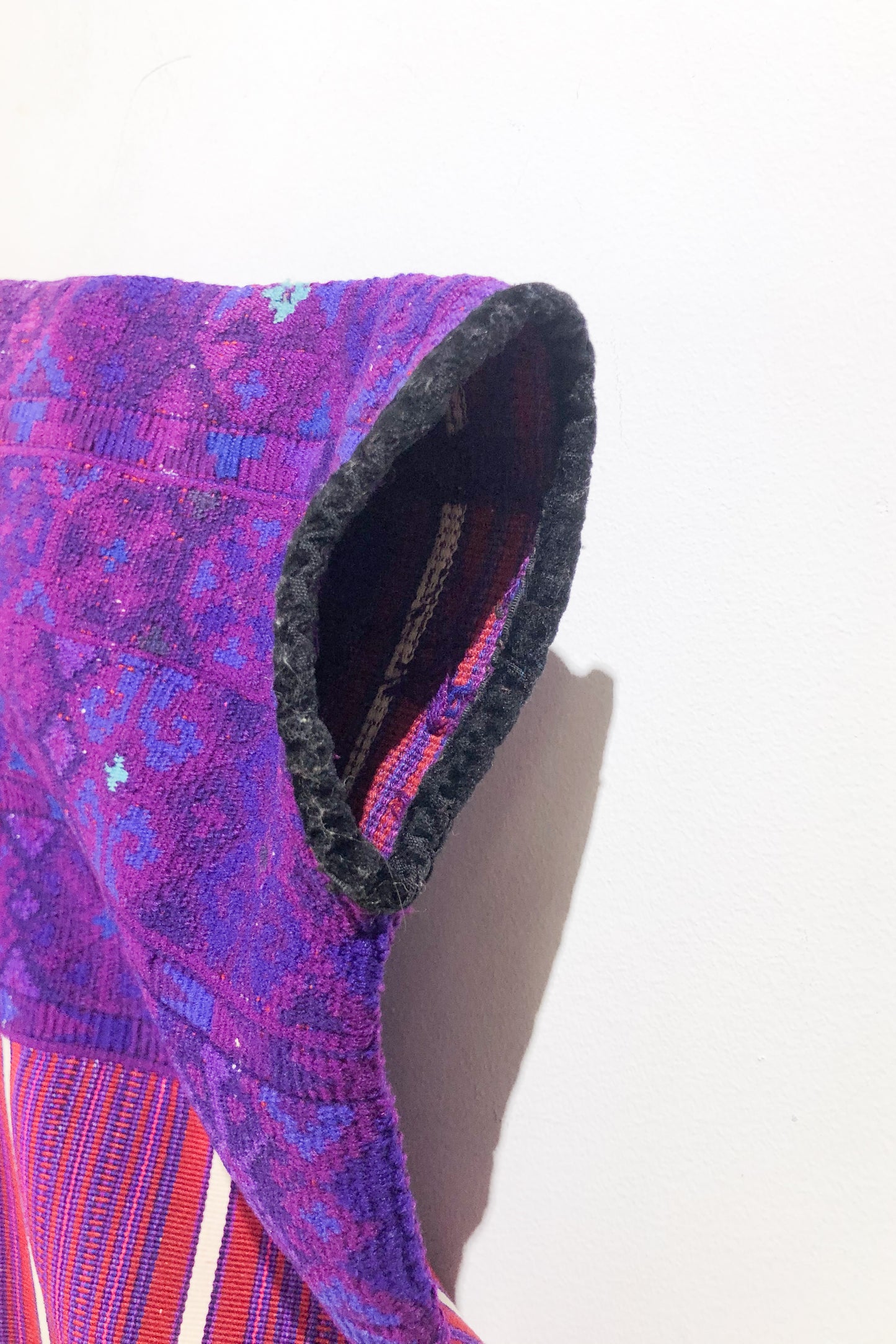 Vintage Red and Purple Huipil Striped Top. Purple yoke square neck top with red stripe bottom and contrast yellow stitching at the neckline. Black velvet trim at sleeve openings. Has some distressing along seams and at one armhole, see photos. No marked content, feels like a cotton blend woven. No marked size, fits XS/S *with notably small armhole.