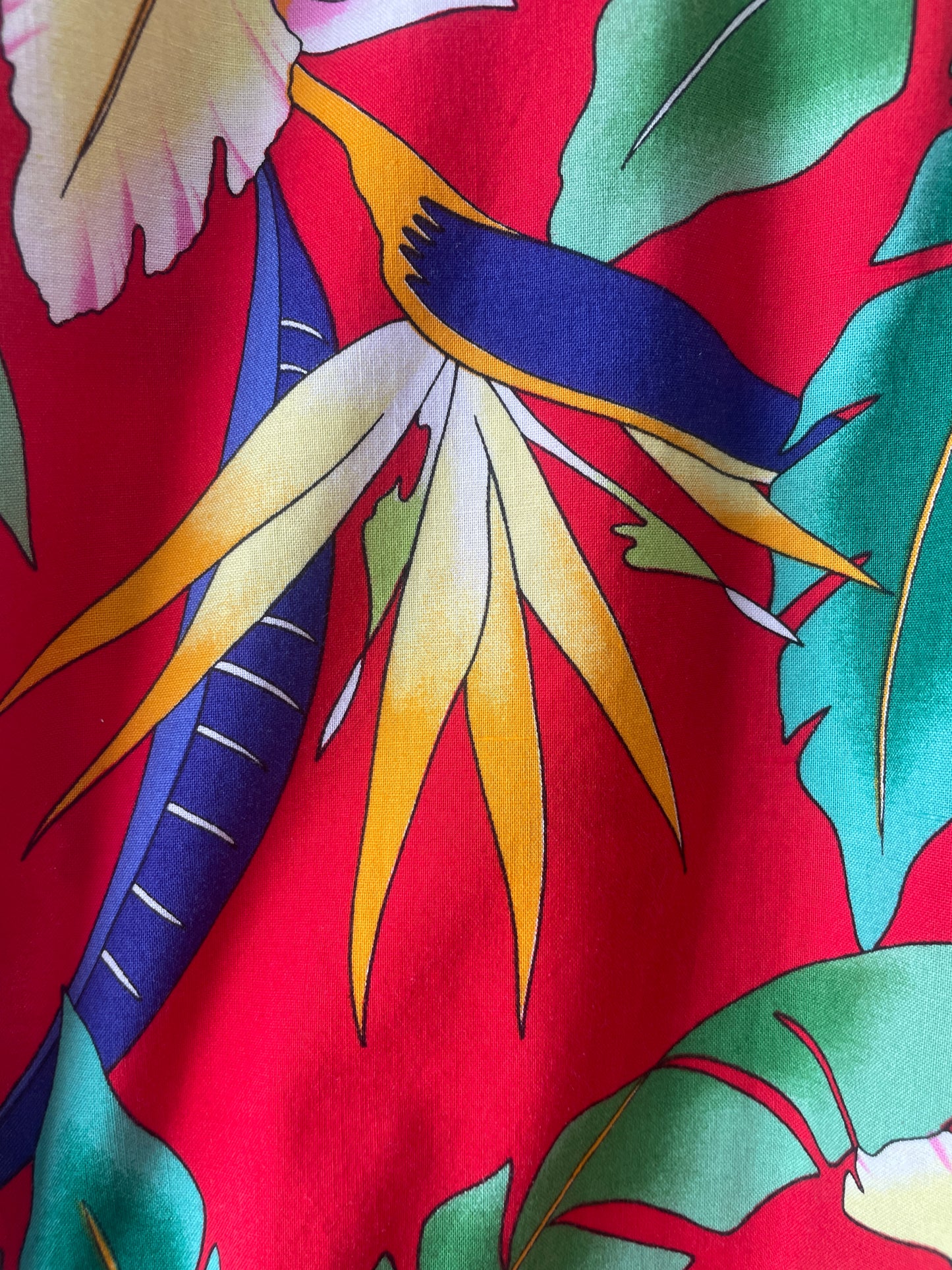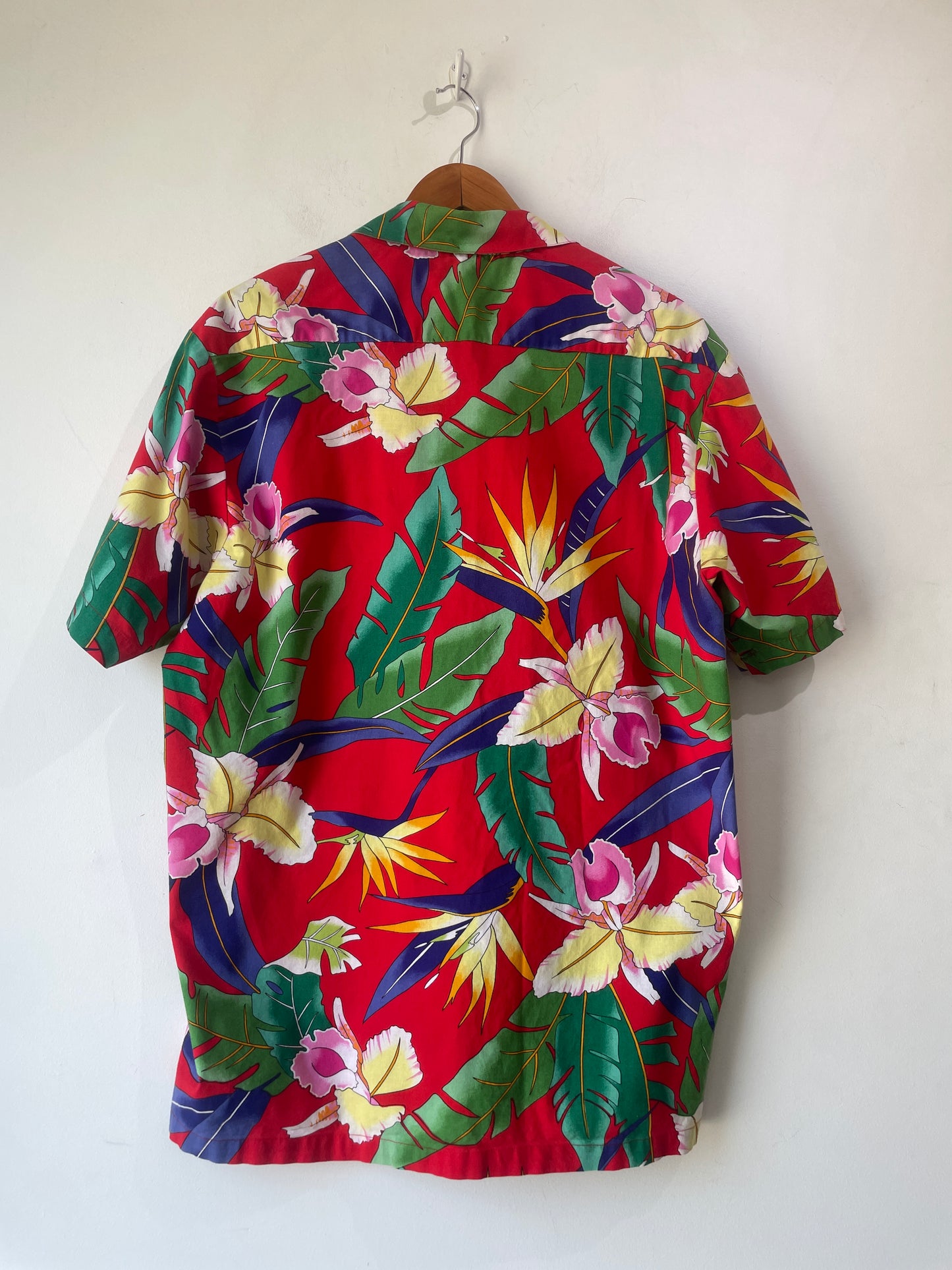 Vintage Red Tropical Monstera Leaf Hawaiian Shirt. Loud and proud! A super fun floral tropical shirt. Features flowers, monstera leaves, birds or paradise, etc! The perfect shirt for that summer vibe! 100% cotton,. Made in USA. Tagged size L, please refer to measurements.