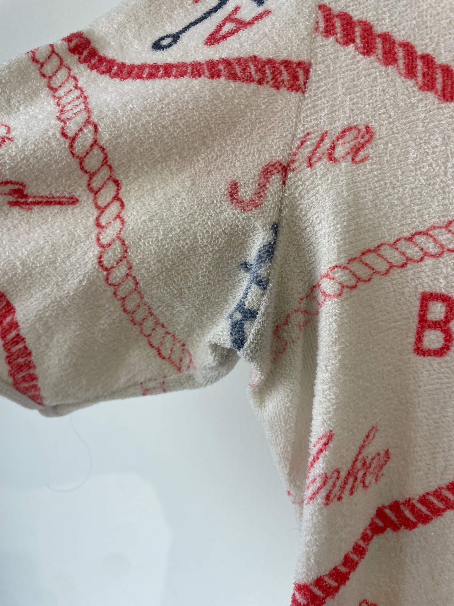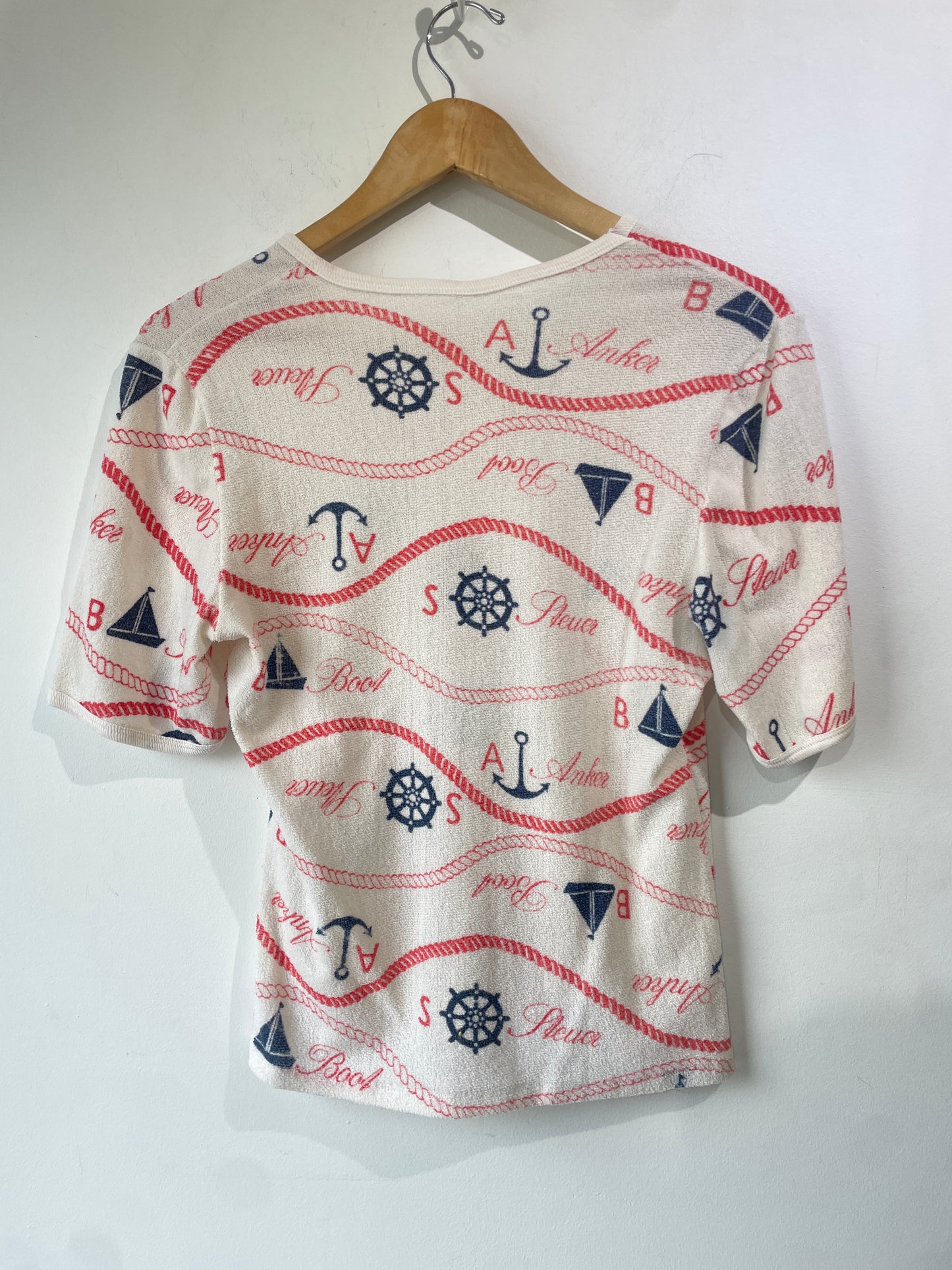 Vintage Nautical Terrycloth T-Shirt. Cutest little tee with ropes, anchors, boats and more printed throughout. Fits XS/S, wash on gentle and tumblr dry. Some wear throughout!