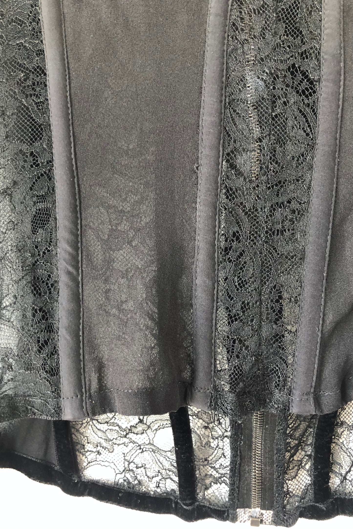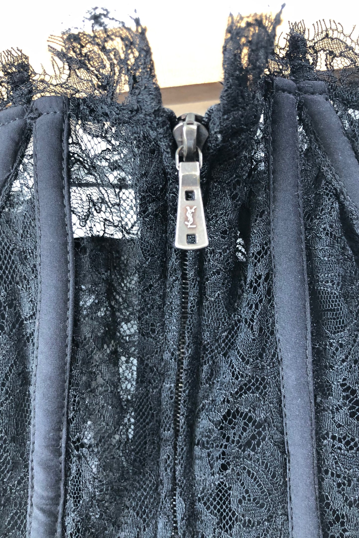 YSL Yves SAINT LAURENT Lace Bustier Top. Black lace and chiffon mixed bustier top with center front zipper closure. Scalloped edge lace trims the top edge. Has some pulling along the side seams at boning. No marked content, feels like silk mix. No marked size, fits XS/S best. Made in France.