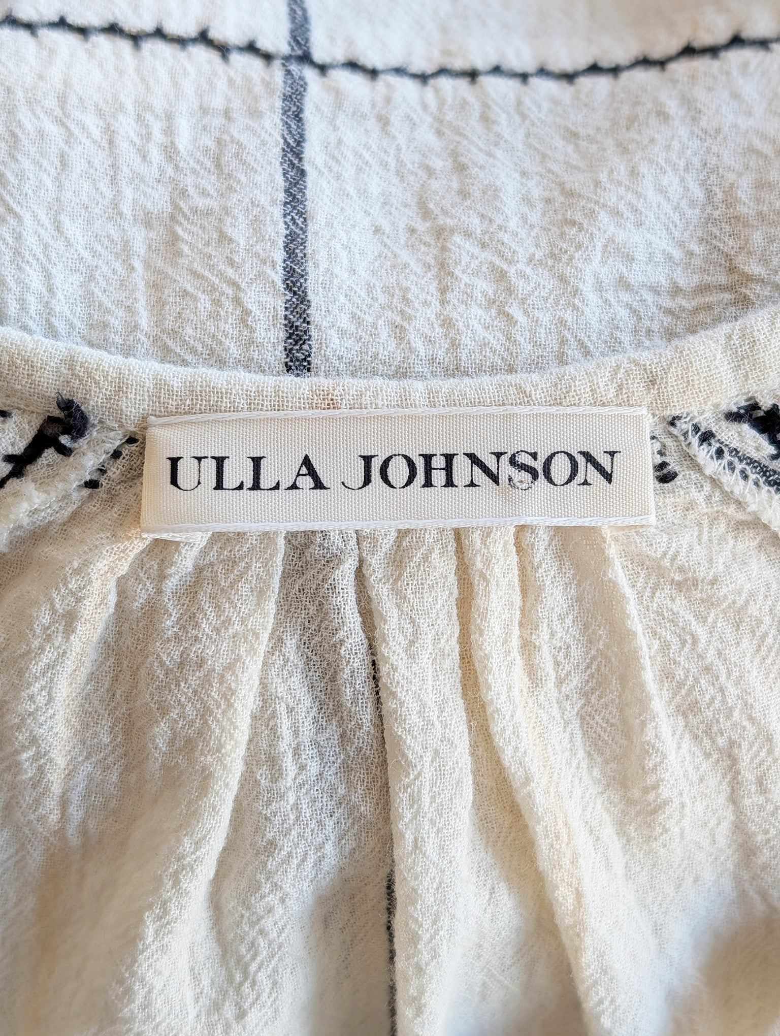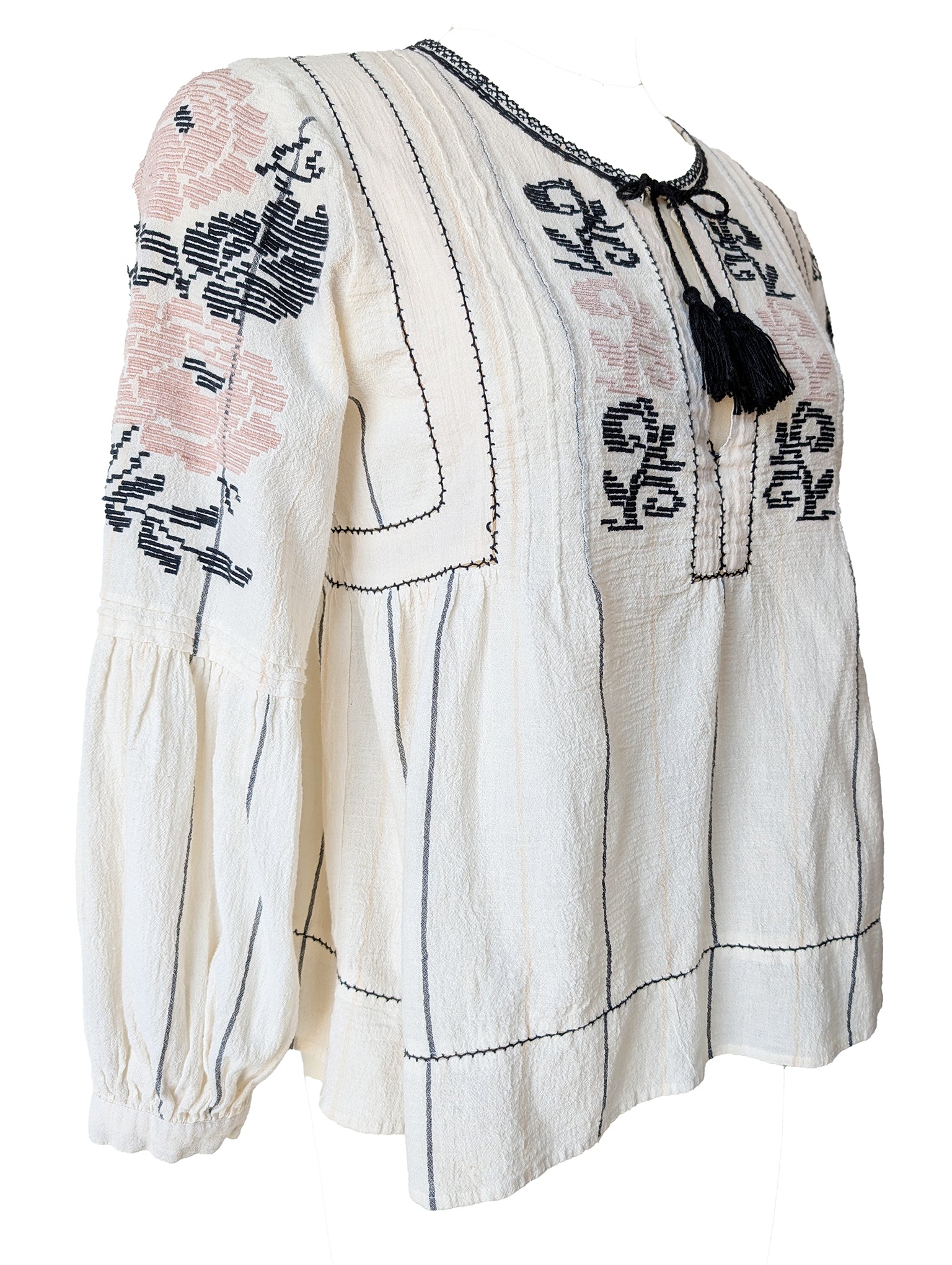 A study in balance: soft geometry, strong point of view. This woven cotton top pairs pale pink and black embroidery against a textured ivory ground, stitched in linear panels that frame the body just so. Finished with gathered sleeves and tassels at the open neckline, it's a gentle mix of romance and structure. Top is in excellent condition and free of notable flaws.