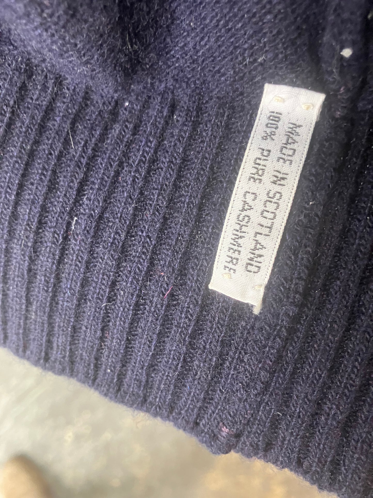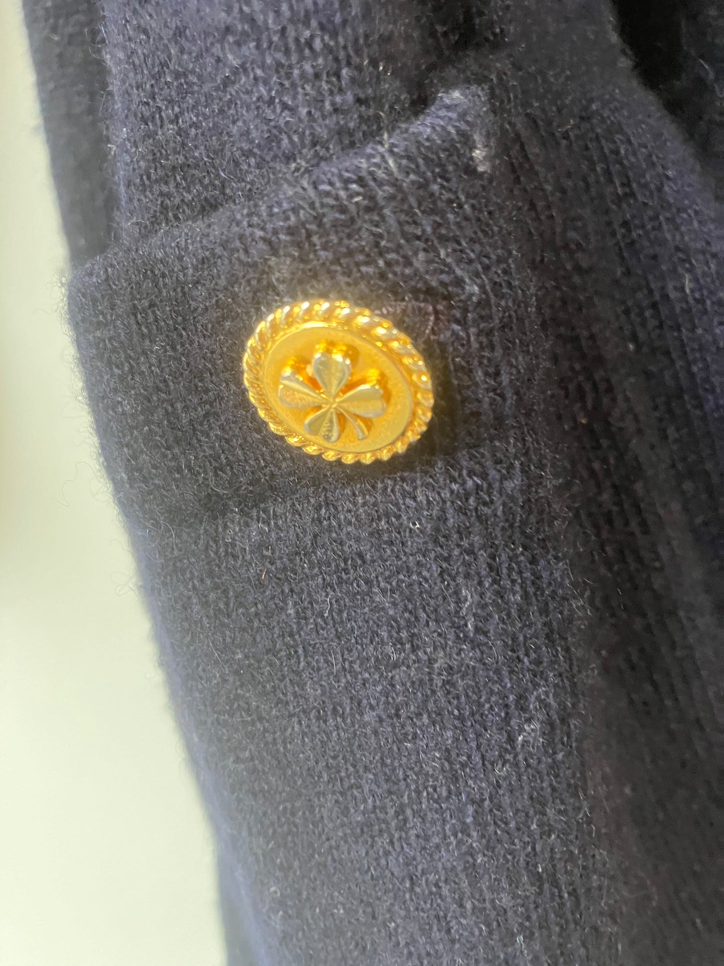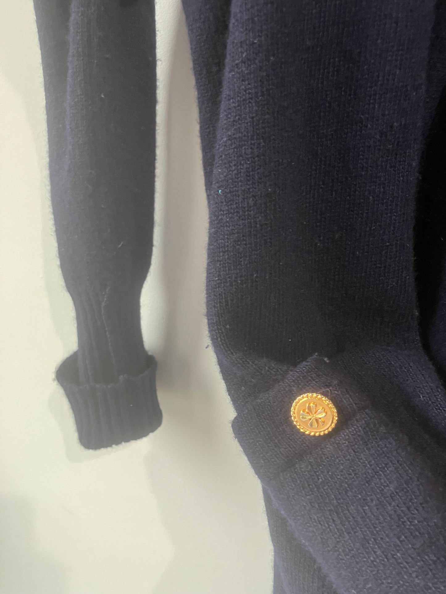 Vintage Chanel Navy Cashmere Cardigan Sweater!!! 100% cashmere. Made in Scotland. Soft as butter. Really sweet timeless garment from Chanel. Featuring gold shamrock buttons on front pockets. Extra long sleeves with rolled fitted ribbed cuffs. Fits many, may fit M/L best. Some minor piling throughout fabric, and I see some