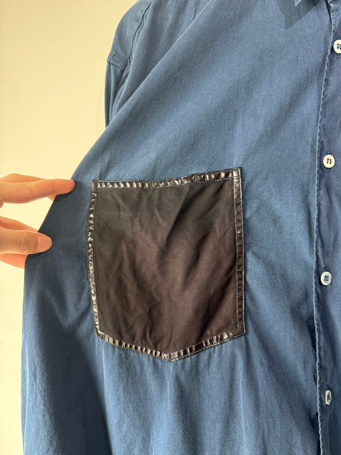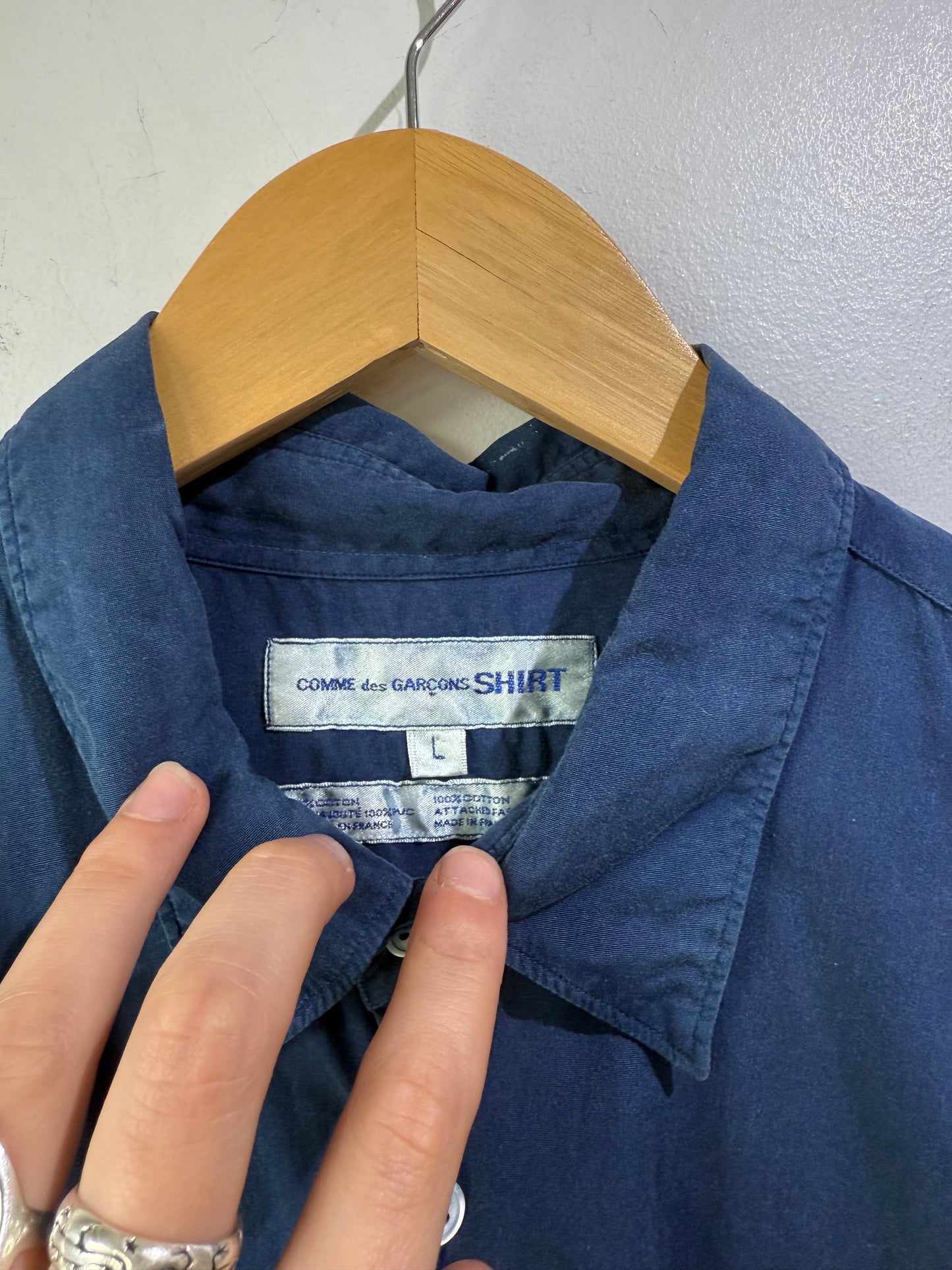 This distinctive Comme des Garçons long-sleeve shirt showcases the brand's signature avant-garde aesthetic with a striking black patch pocket adorned with contrasting texture on the left sleeve. Crafted from soft blue cotton, it's a standout piece that blends timeless tailoring with unexpected design details.