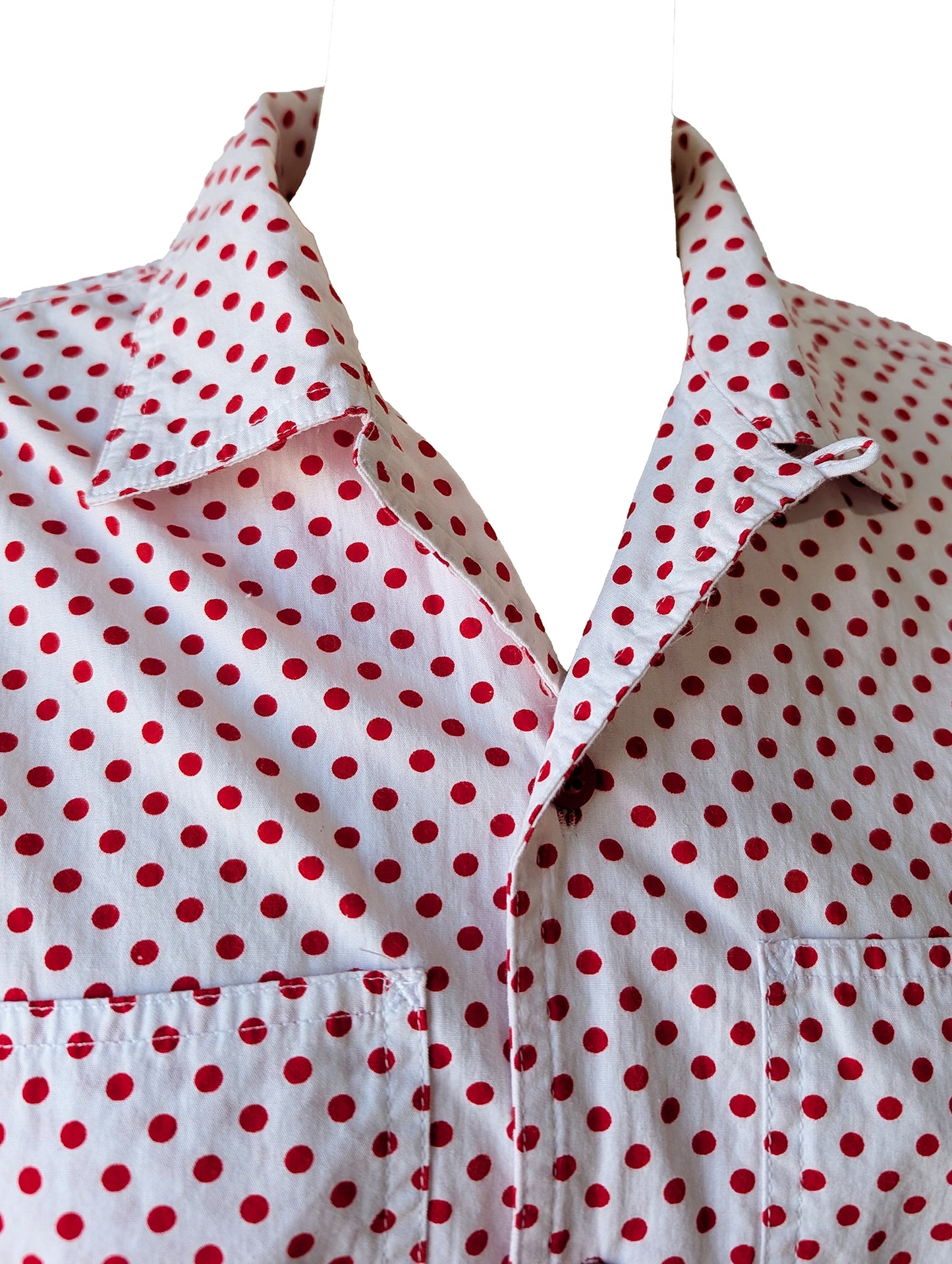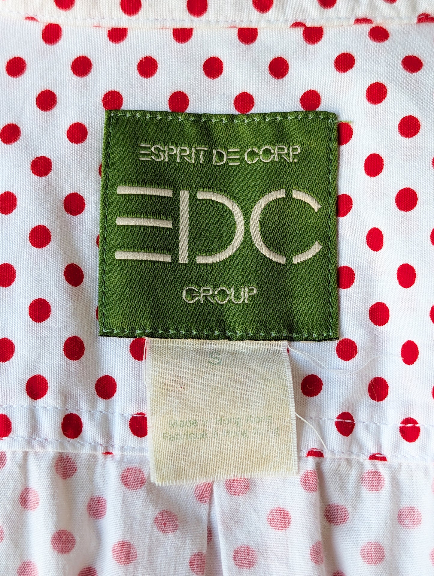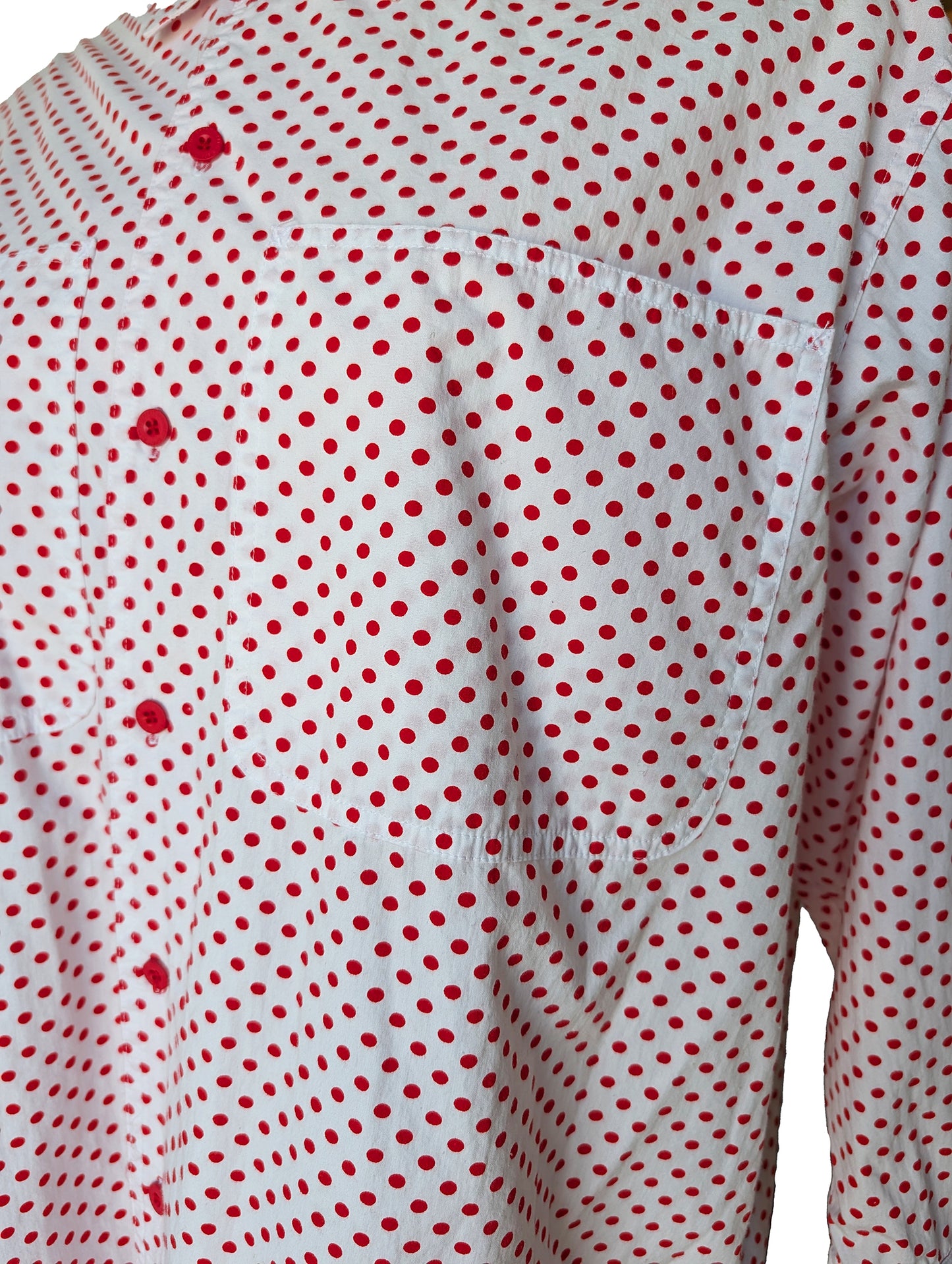 A spot of brilliance, literally. This crisp cotton Esprit button-down features a perfectly scattered red polka dot print and all the right 90s touches: slightly boxy cut, double chest pockets, and branded buttons that match the print. Light, breathable, and full of personality. Shirt is in excellent condition and is free of notable flaws.