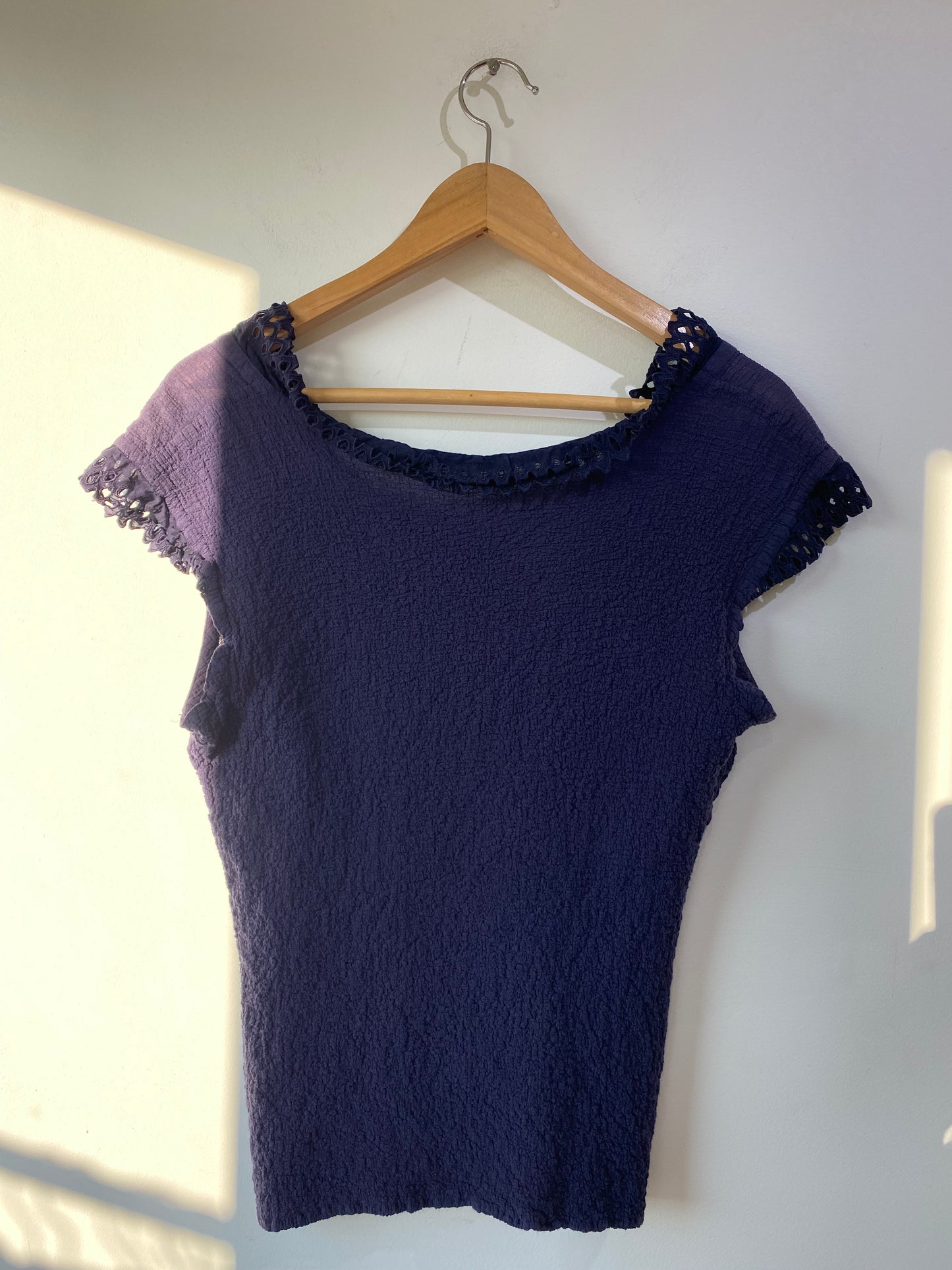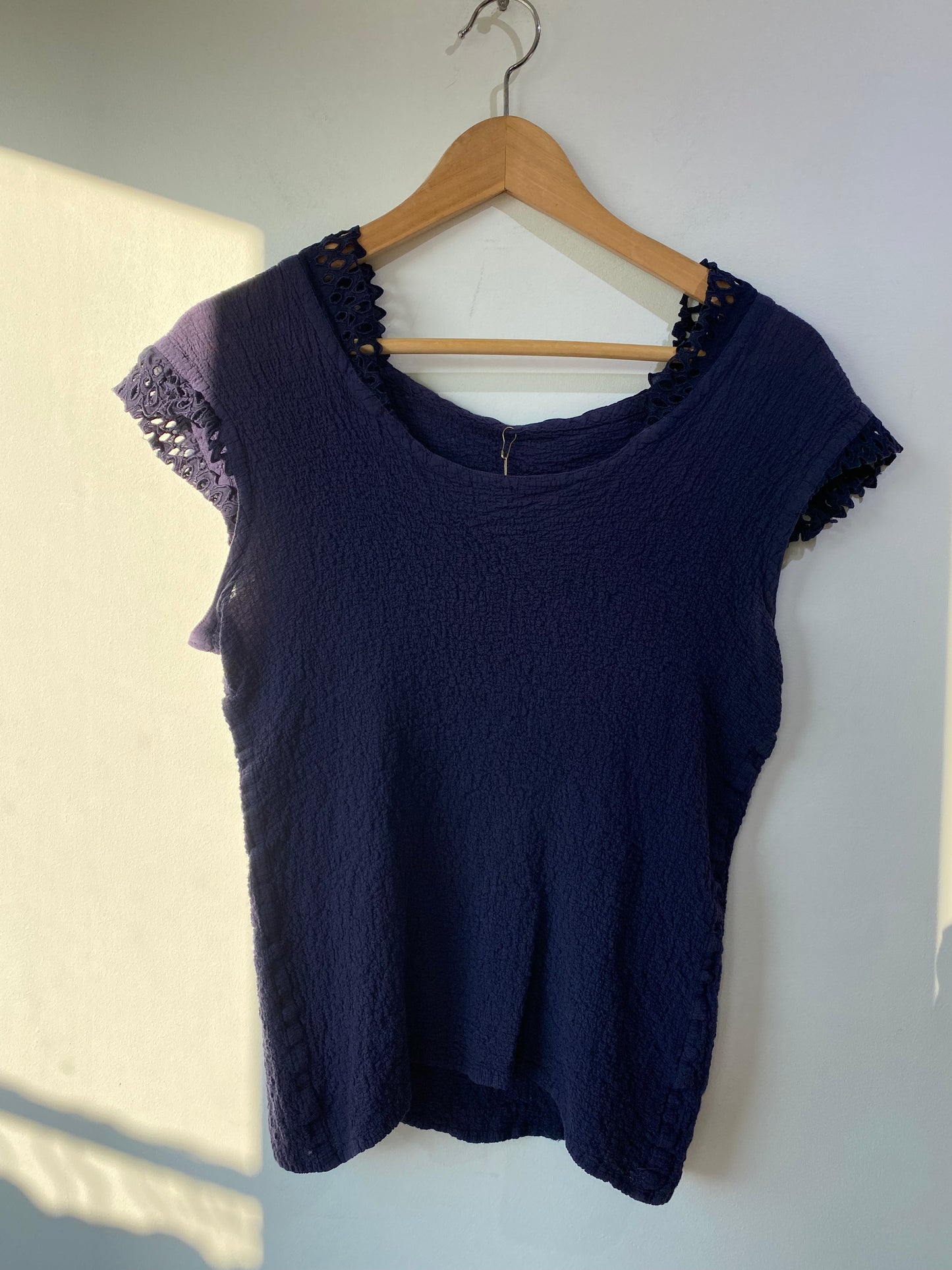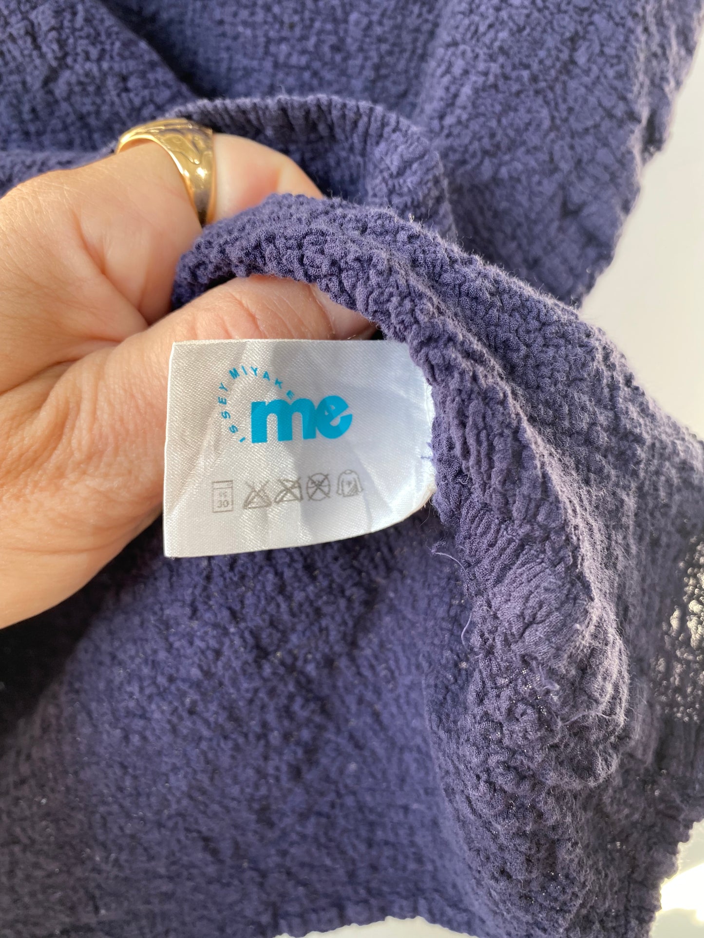 Issey Miyake Me Navy Blue Crinkly Top with Lace Collar In excellent condition. Fits Small best, medium okay too because of the stretch.