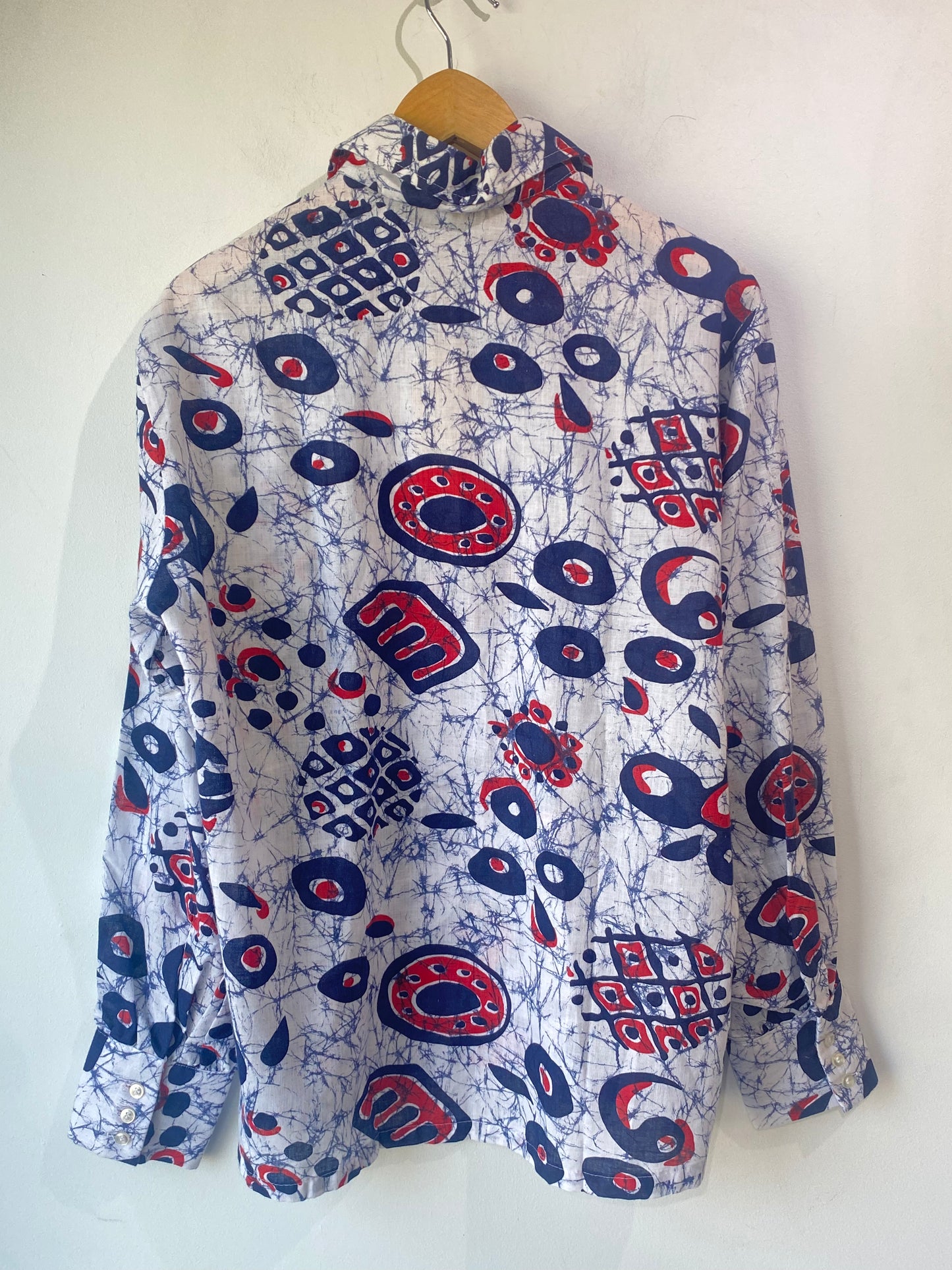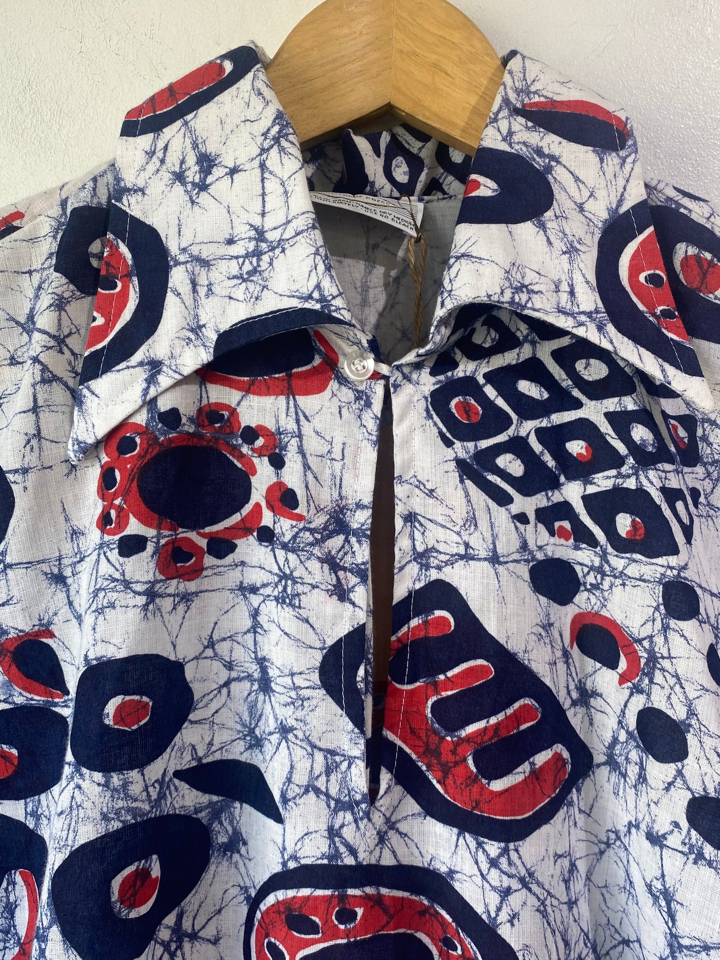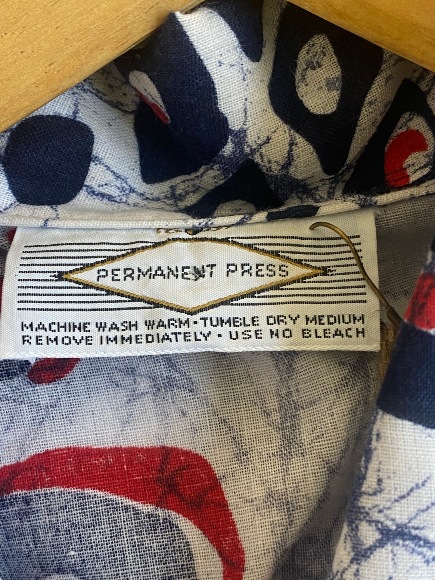 Vintage 70s Permanent Press Blue & Red Shirt! No material tag, but feels like cotton blend. Has long sleeves, a classic collar, and keyhole detail on the chest. Would best fit medium (men's), please refer to measurements. In great condition!
