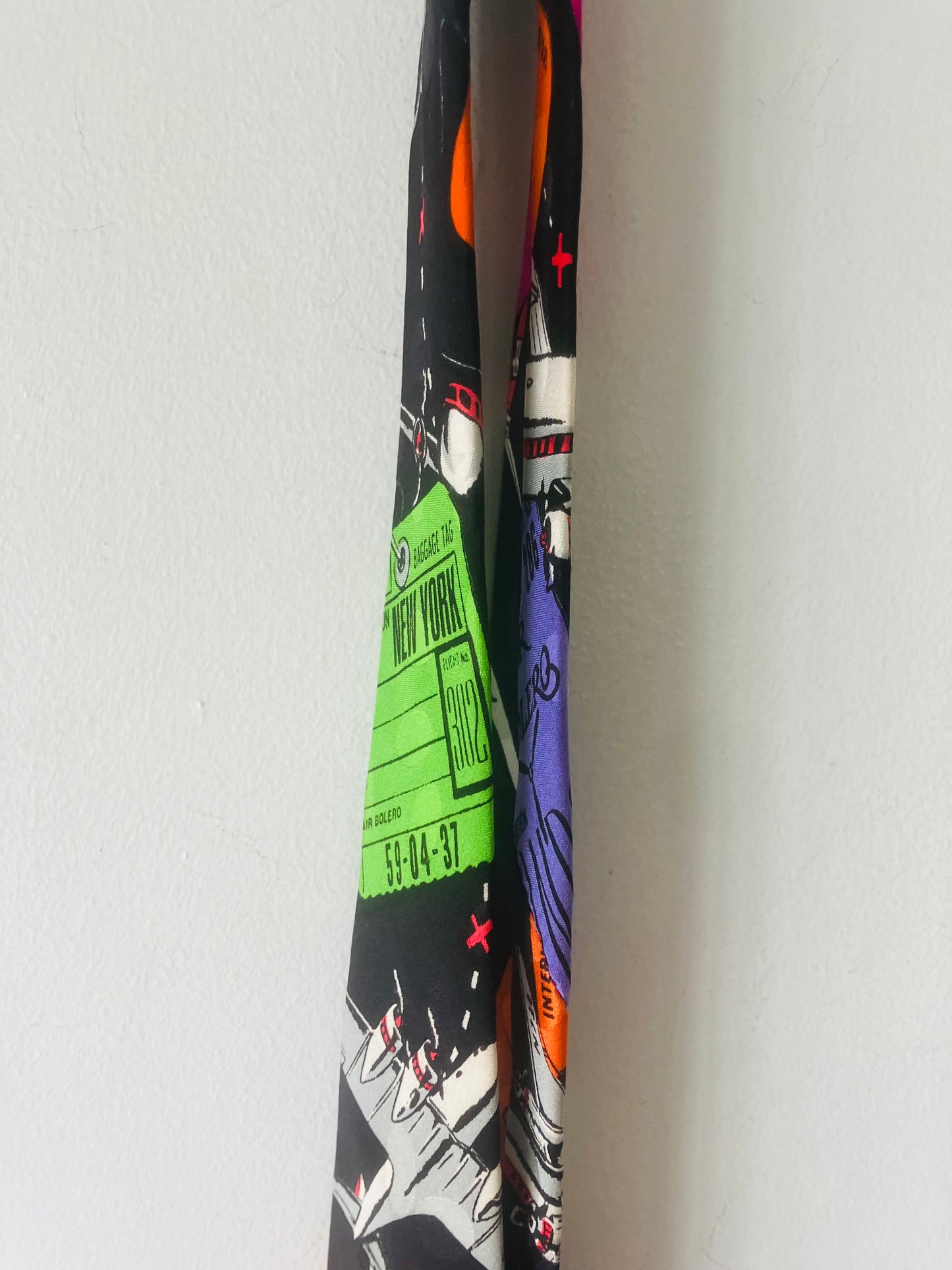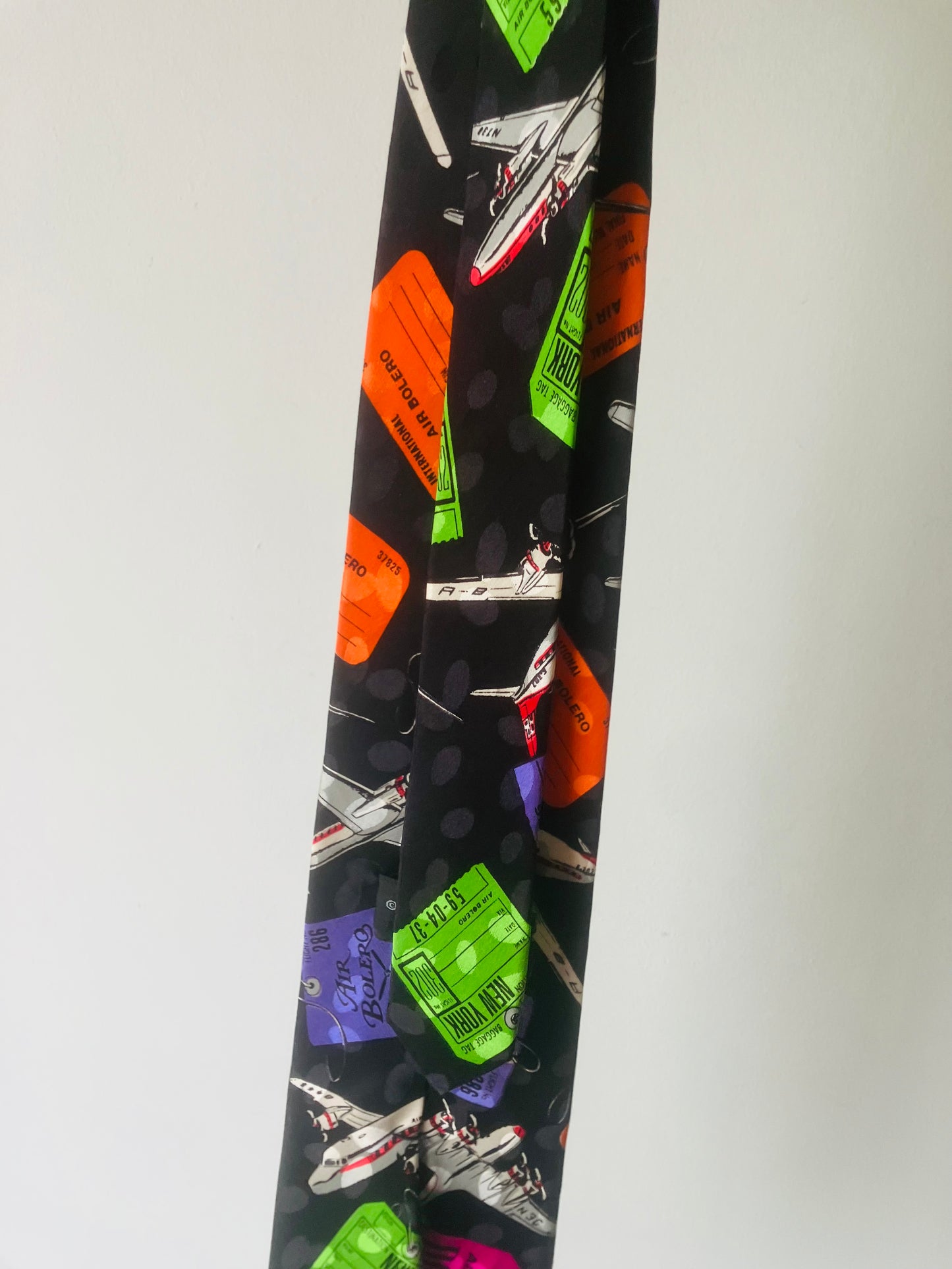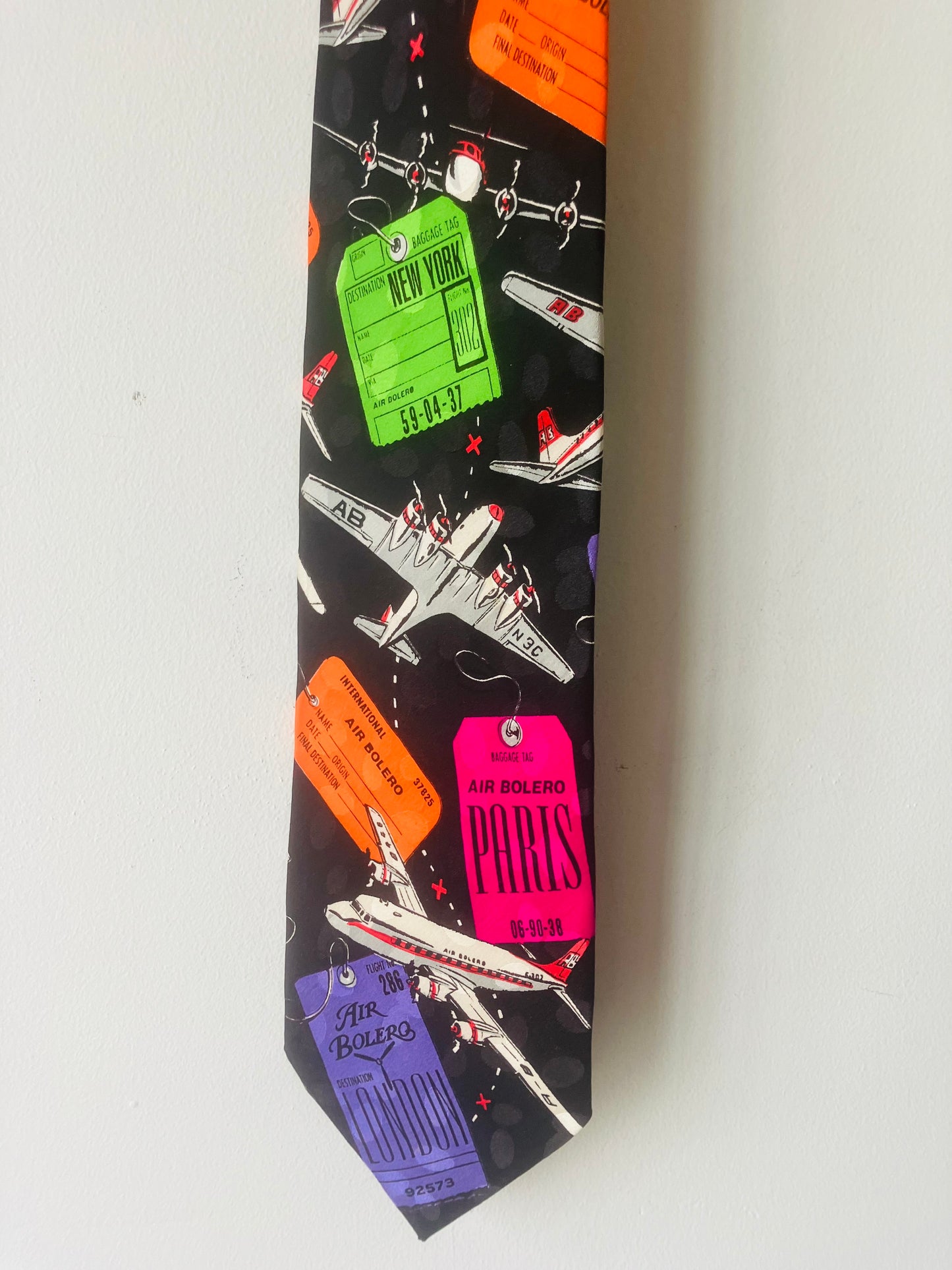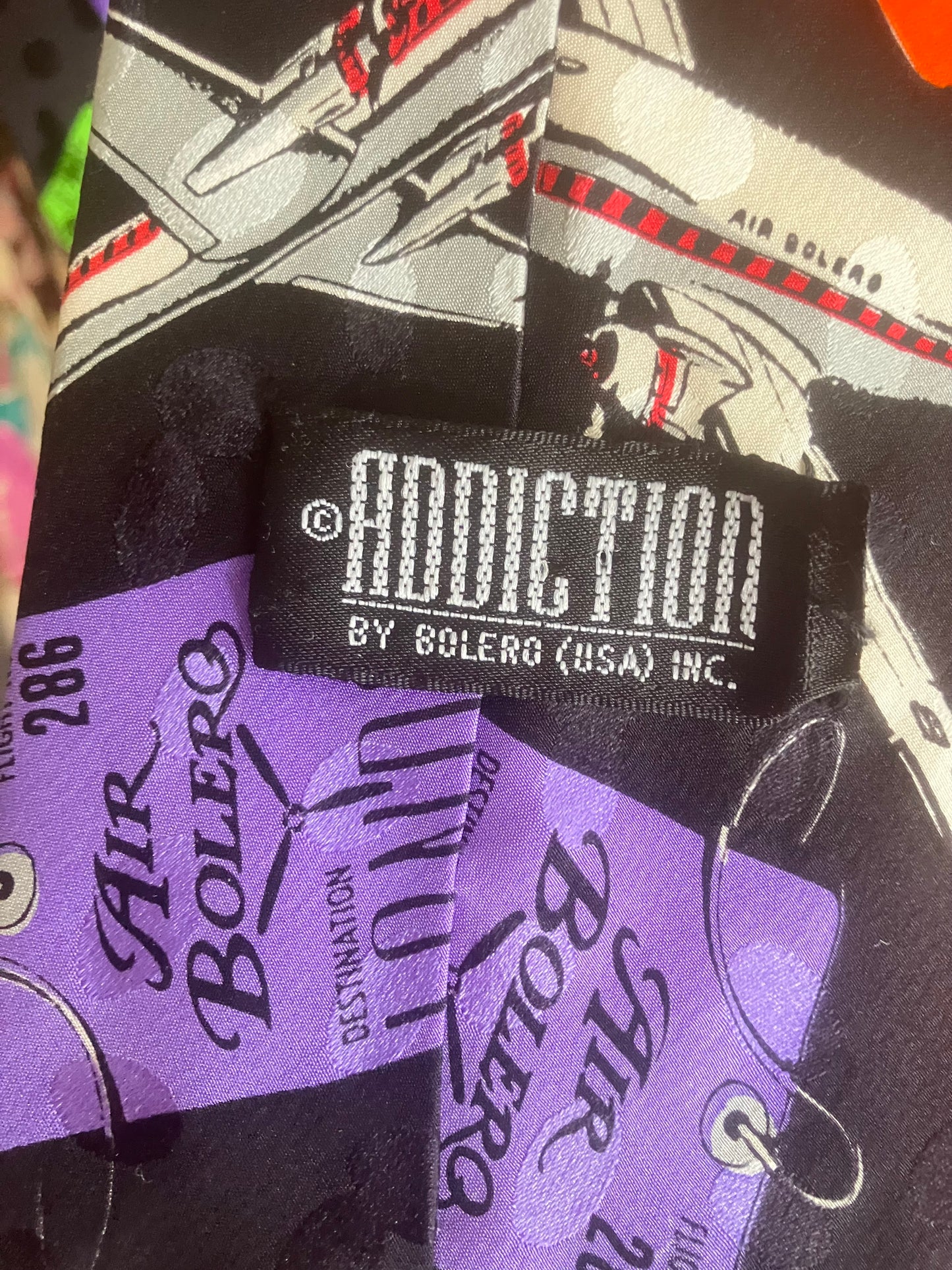 Vintage Addiction by Bolero Silk Airplane Tie in great condition. 100% silk. Made in Korea. Dry clean. Very fun homage to flight travel in bright neon colors on a black base.
