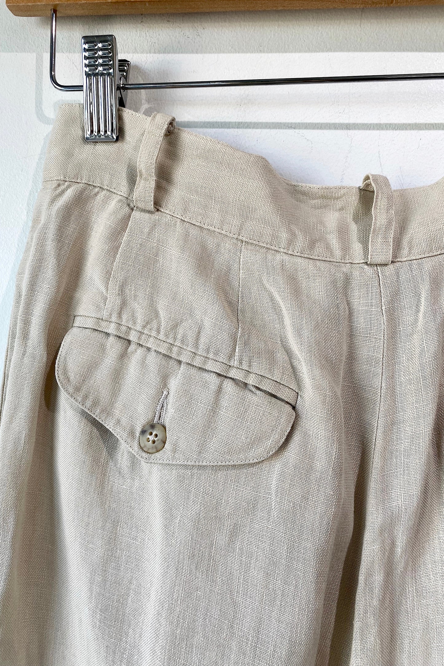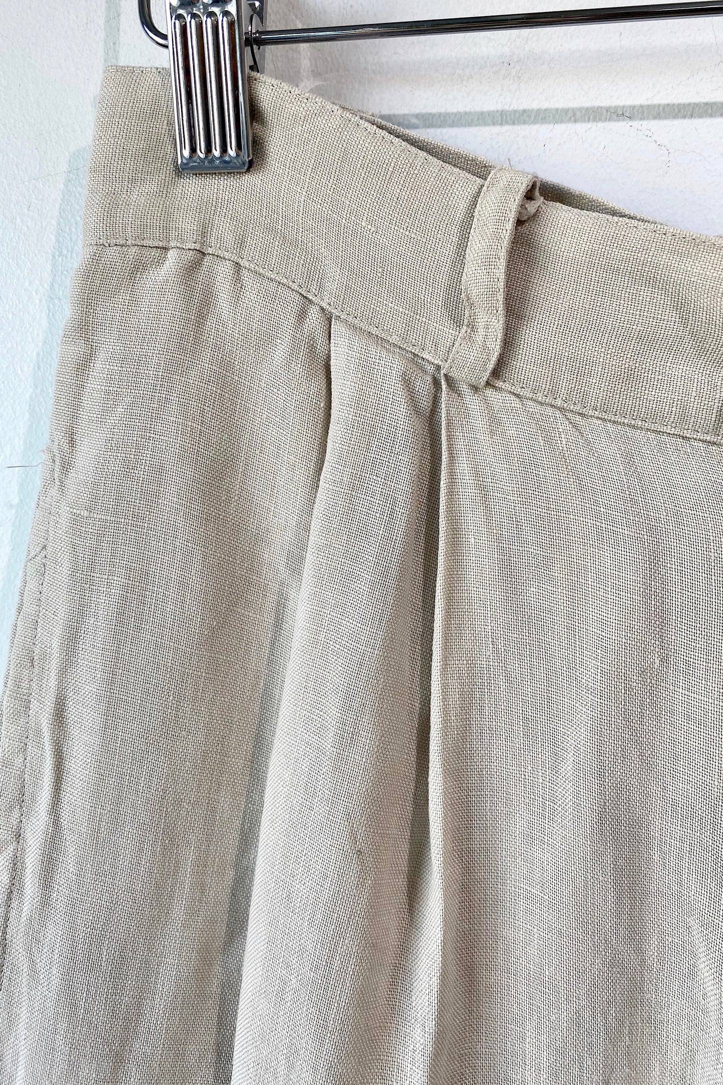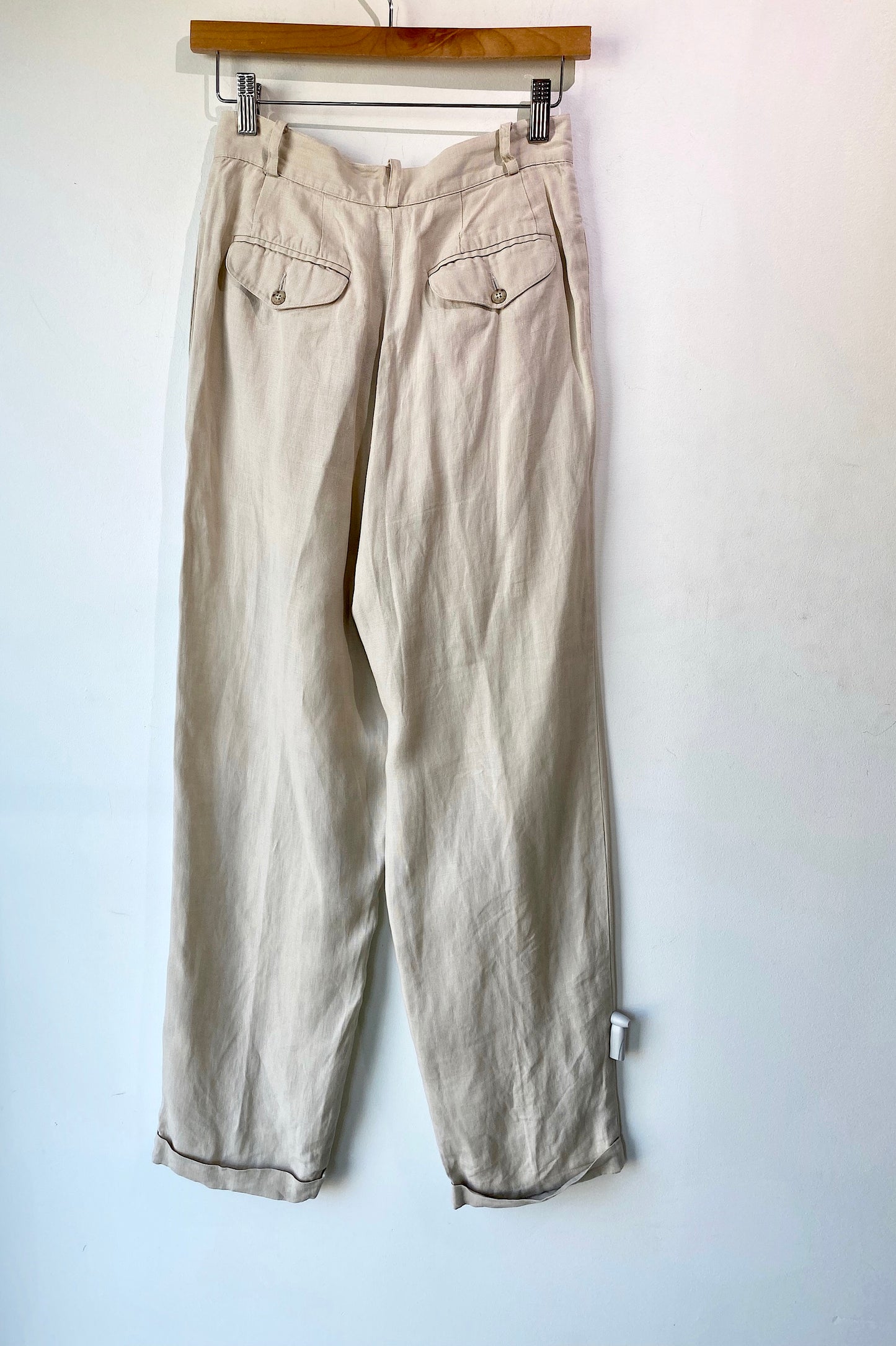 Vintage Banana Republic Tan Linen Pants. Great condition. Soft pleated trouser pants with back button pockets. 100% linen, dry clean only. Marked as size 8. Made in Hong Kong.