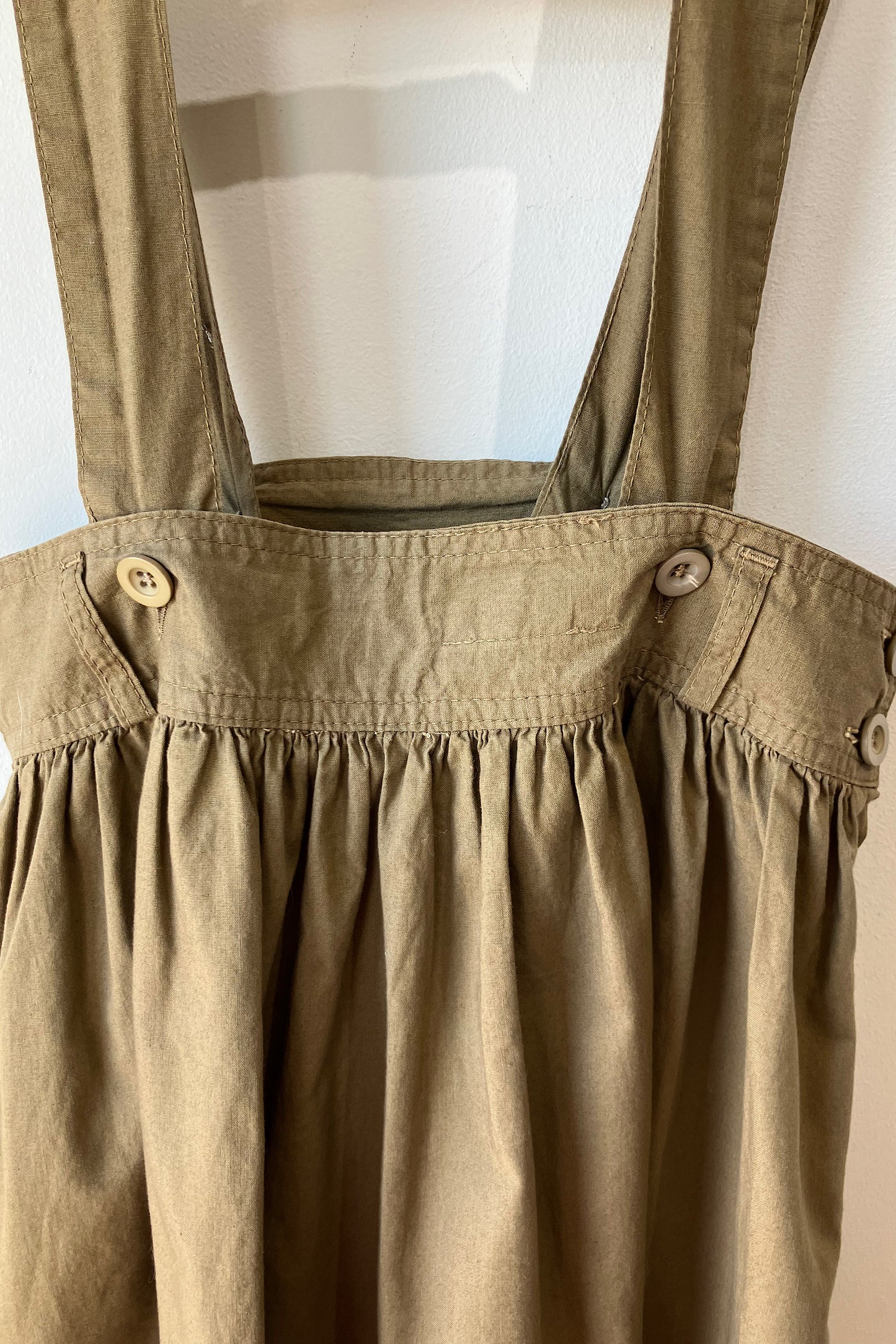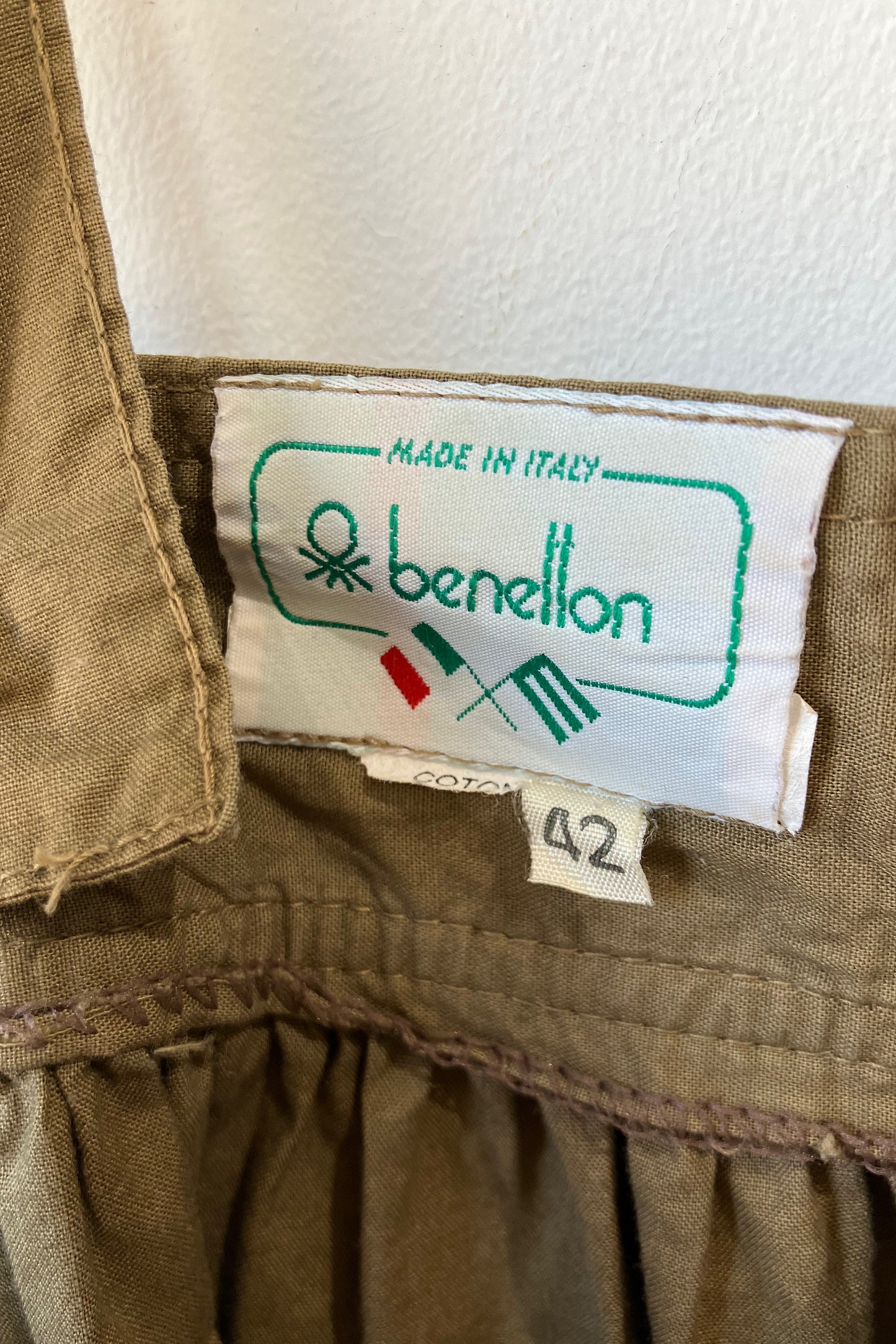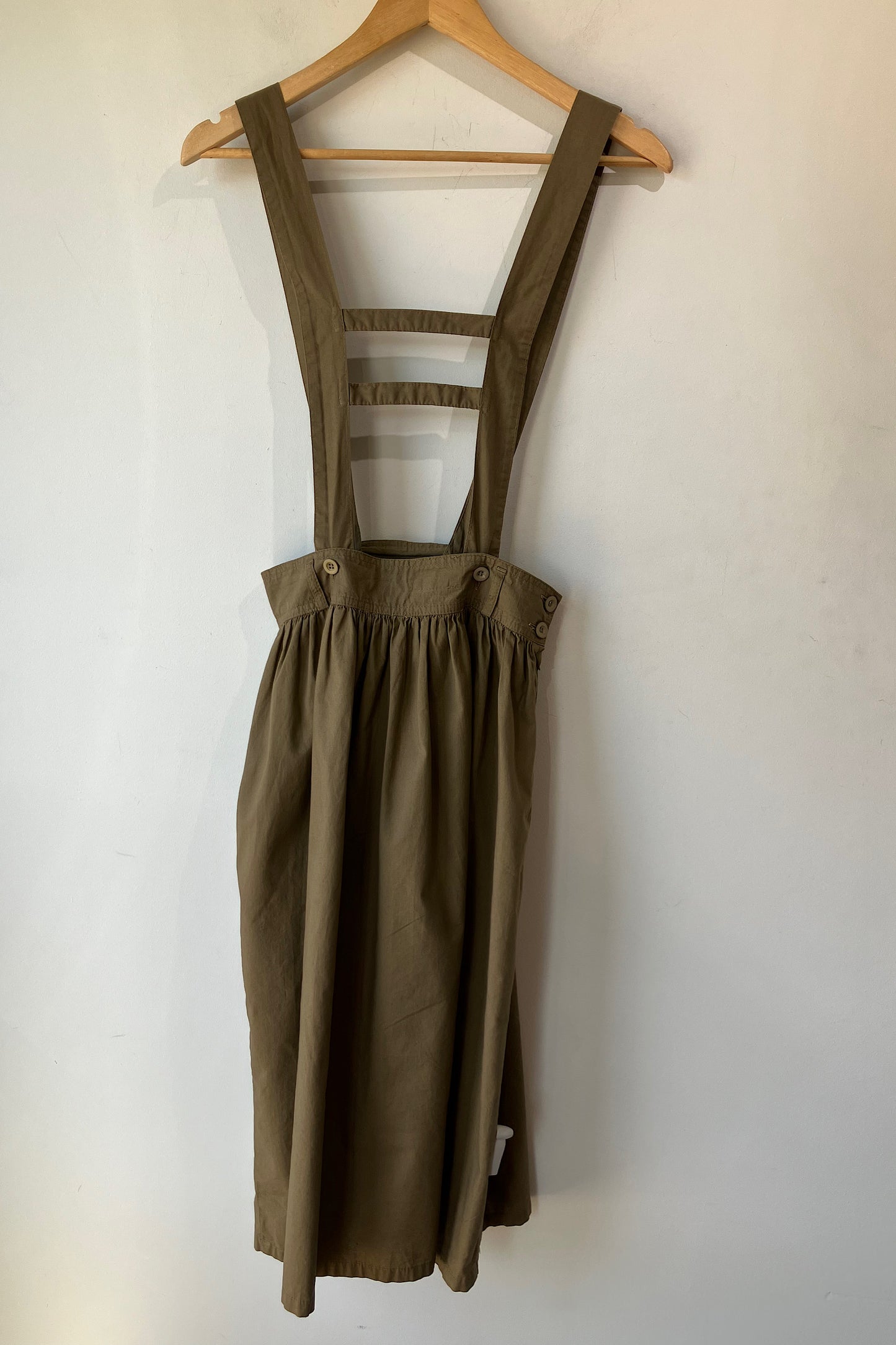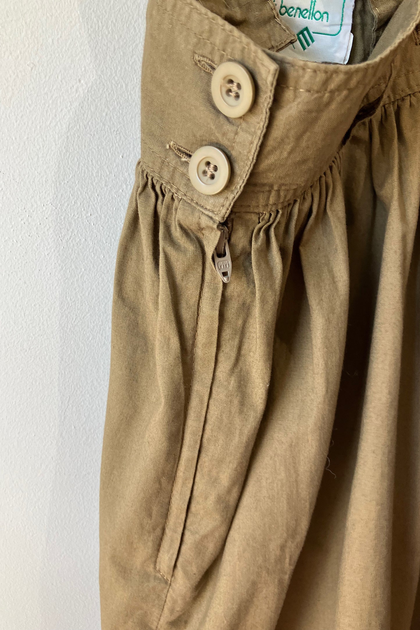 Vintage Benetton Brown Suspender Skirt. Great vintage condition with side zipper and button closures. Full skirt with shirring all along waistband. 100% cotton, hand wash cold. Marked as size 42. Made in Italy.