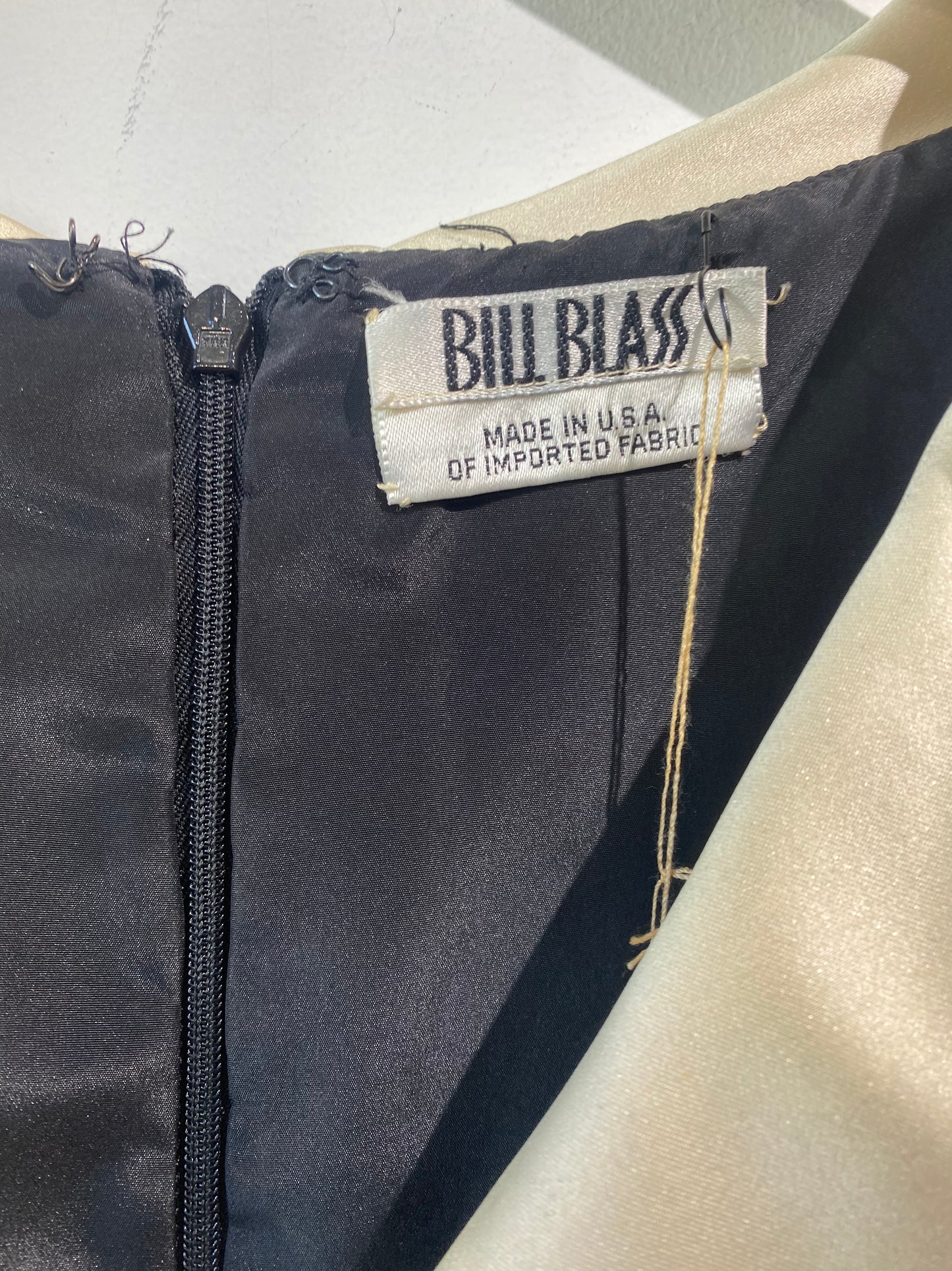 Vintage Bill Blass Black Cocktail Dress with white silk collar and cuffs. Small shoulder pads. Made in the USA circa 1980s from imported fabric, feels like a poly blend. In great vintage condition. Fits like a size S/M.