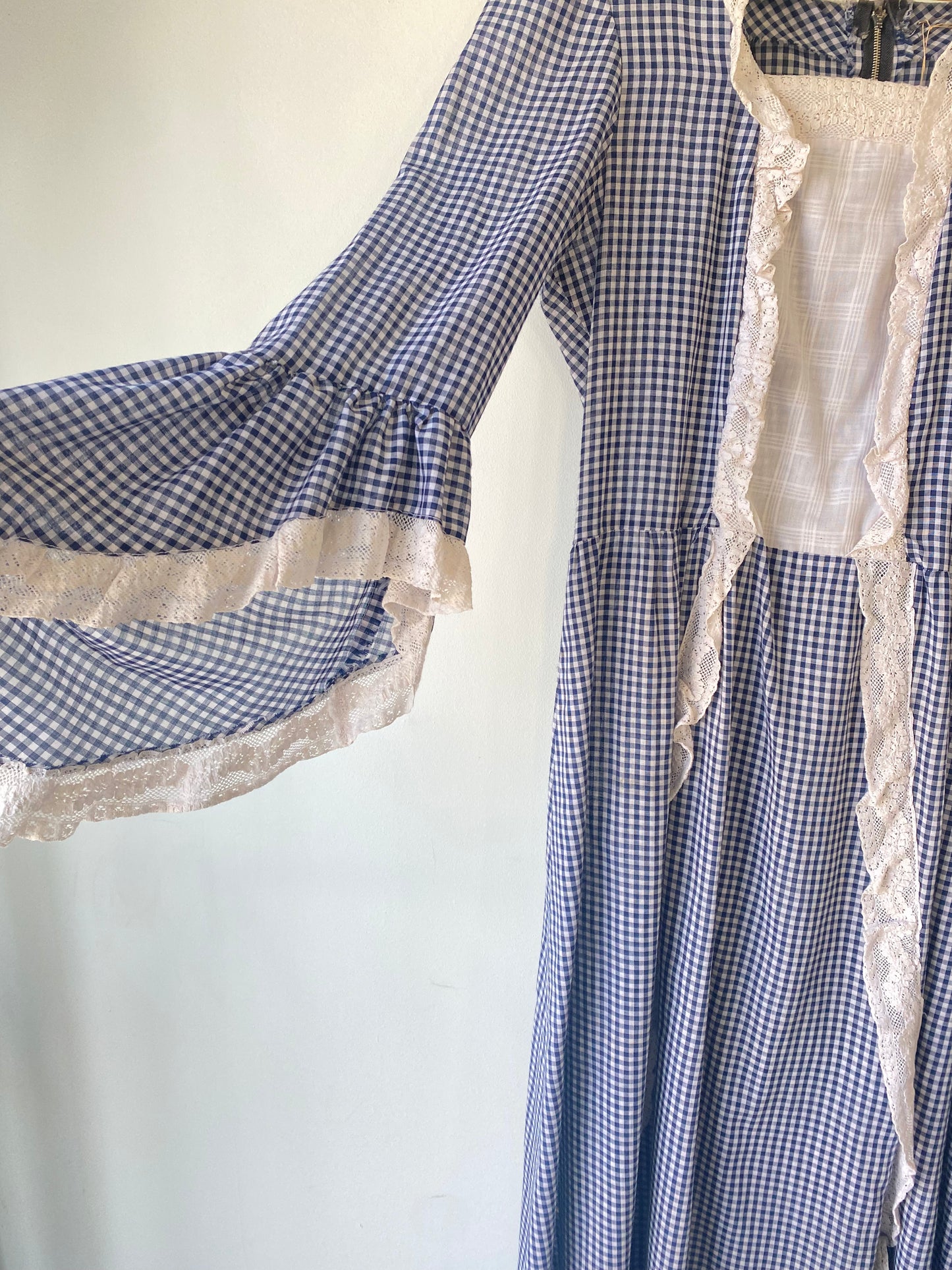Vintage Blue Gingham Prairie Dress with White lace accents. Similar to Gunne Sax. No label. In excellent vintage condition.