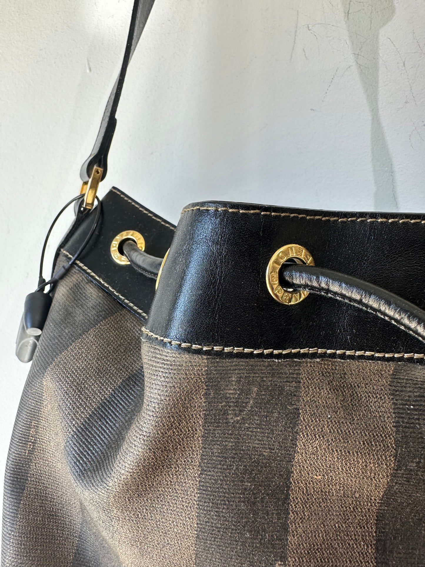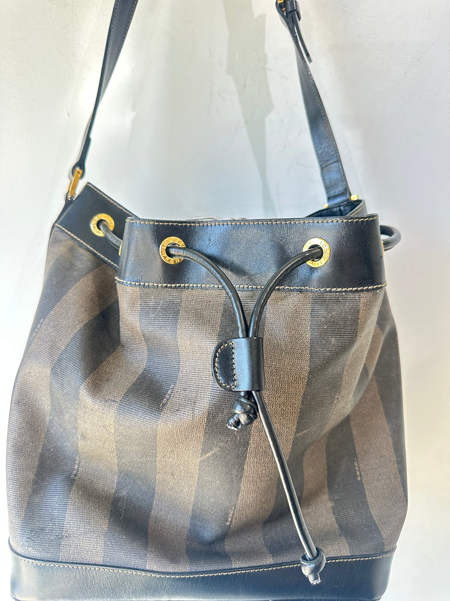 Vintage Fendi Wide Striped Bucket Bag. A rare and truly amazing vintage find, this fabulous bag from Fendi features brown and taupe block stripe coated canvas with dark brown leather details and trim. The drawstring top closure will keep your things secure while the adjustable shoulder strap gives you versatility. In excellent vintage condition, bag shows only minor signs of wear and is free of stains, tears and defects.