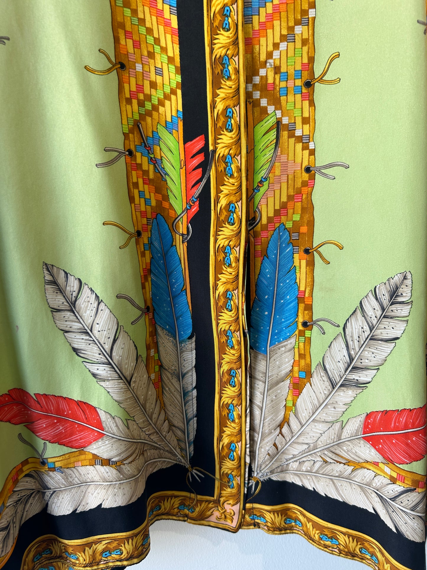 Vintage Gianni Versace Silk Printed Top. Printed with Native American inspired details, big gold button at top, absolute classic Versace vibes. Bright colors, shiny silk, and gold details. Size Sm/M, 100% silk, dry clean only.