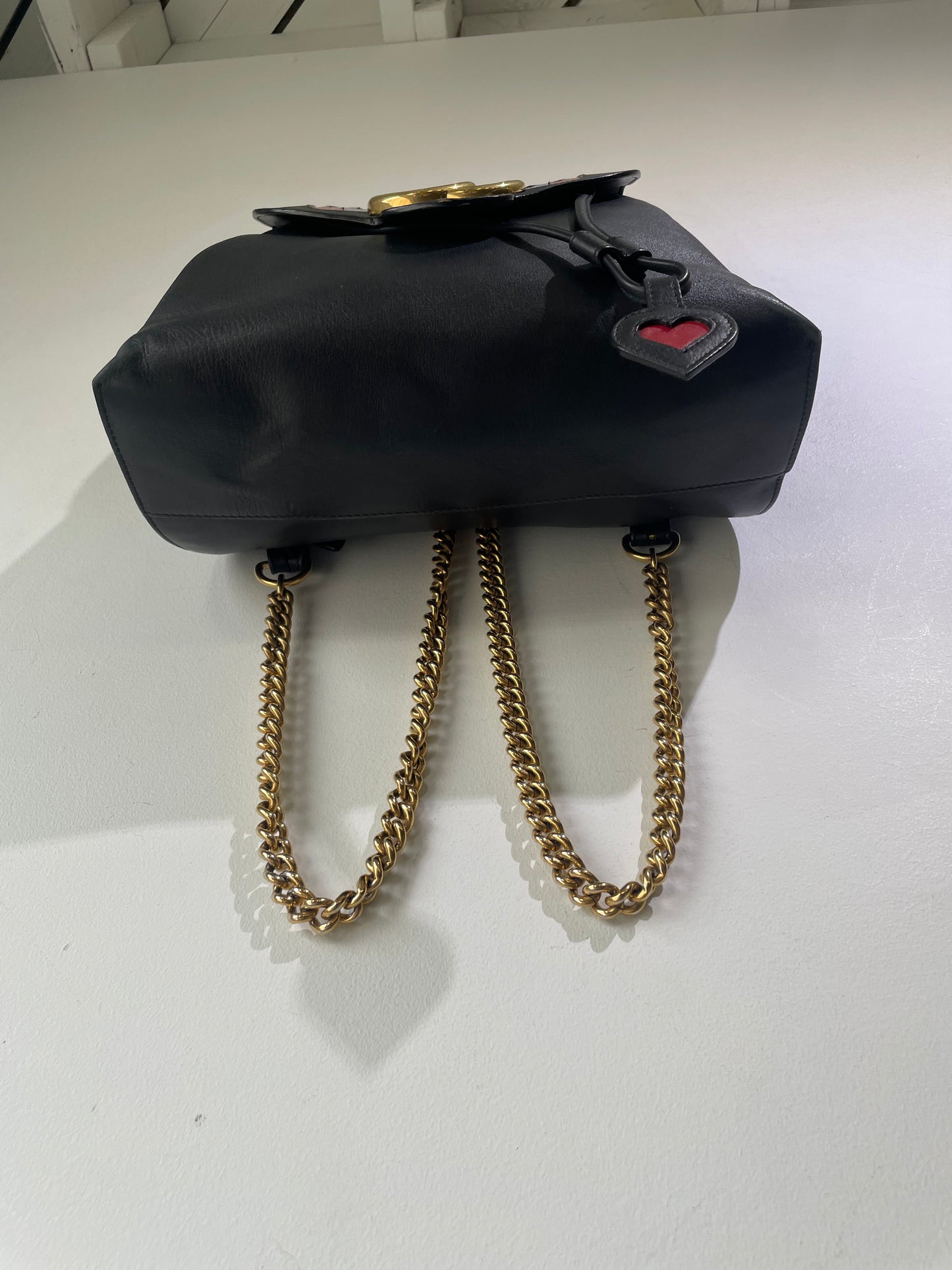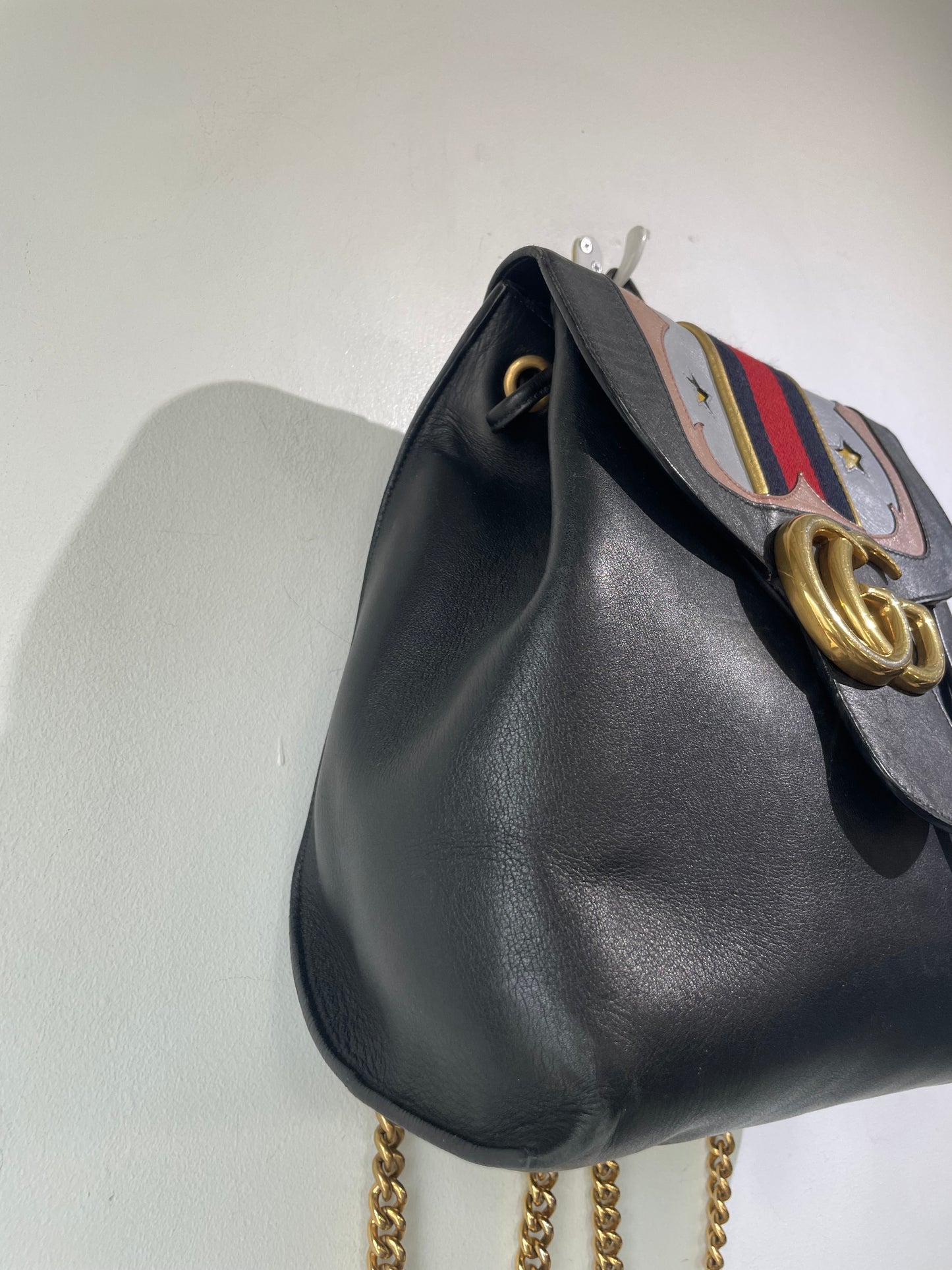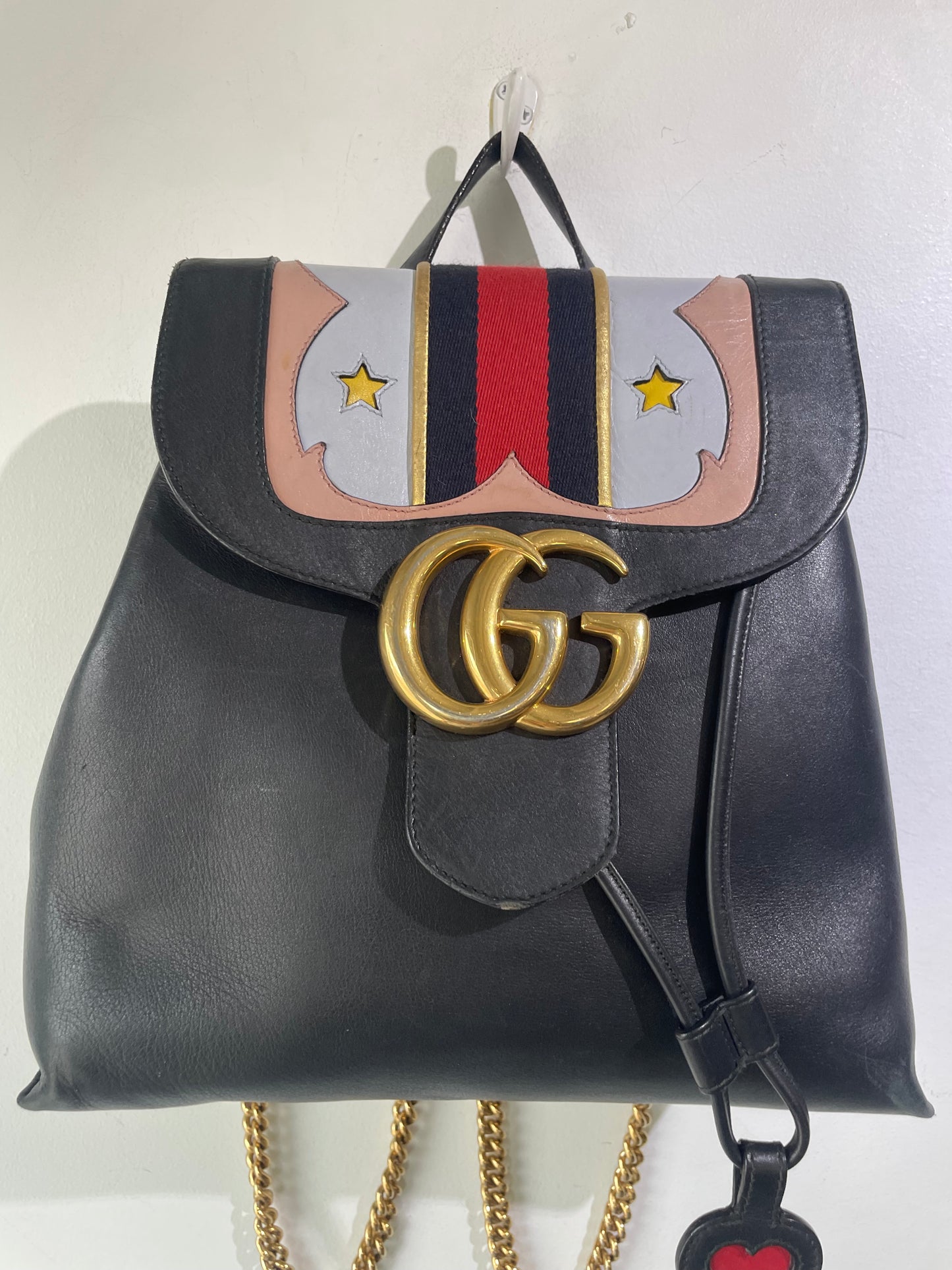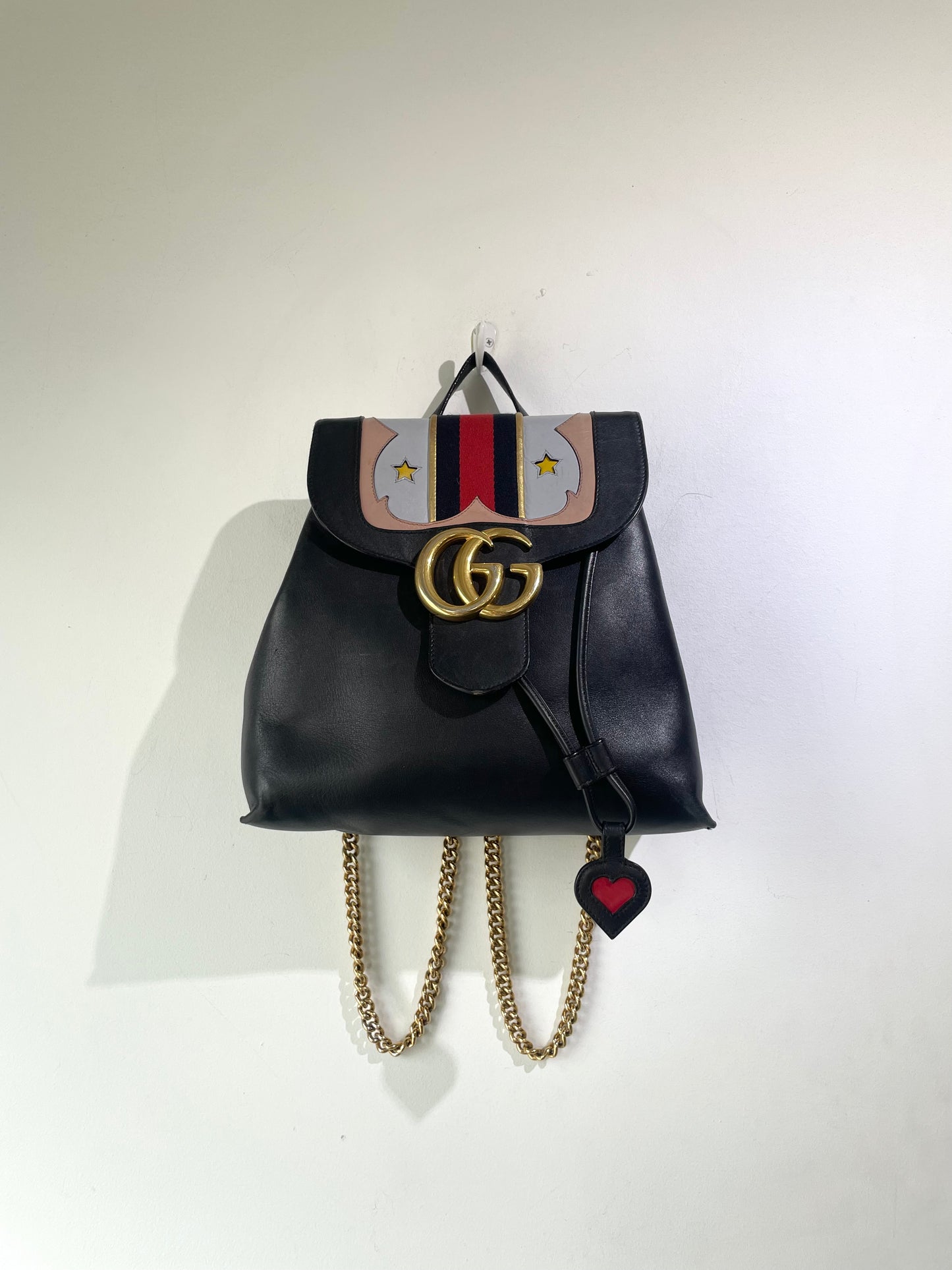 Gucci Marmont Navy Backpack with Heart Charm! A stylish leather backpack with brass chain straps from Gucci. Featuring the iconic double G in gold on front, heart tag, and multicolored leather details. Made in Italy. In very good condition, with some wear on interior from use and minor marks on surface and at corners. Measurements are approx. 11" x 11" at widest.